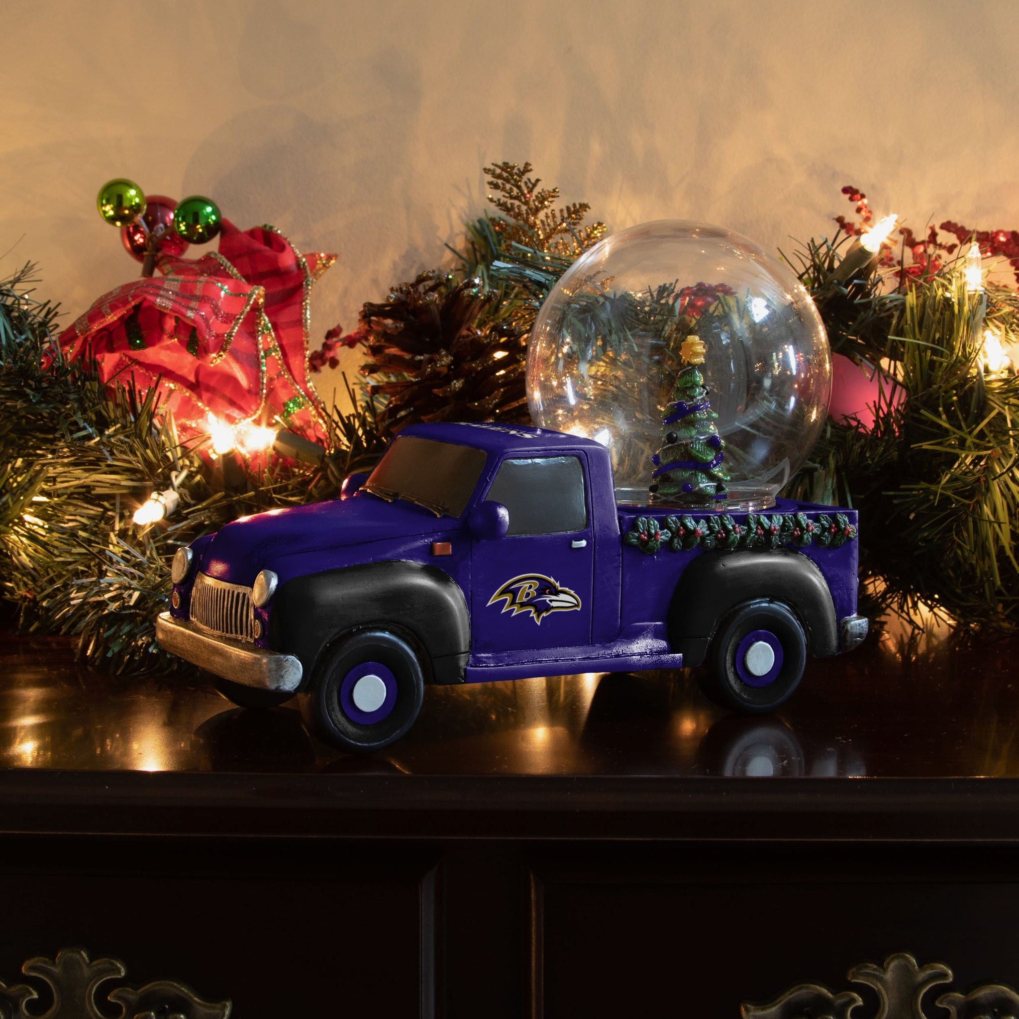 This snow globe is ZOOMING into the holidays! Kick your holiday cheer into high gear with this Baltimore Ravens Pickup Truck Snow Globe!