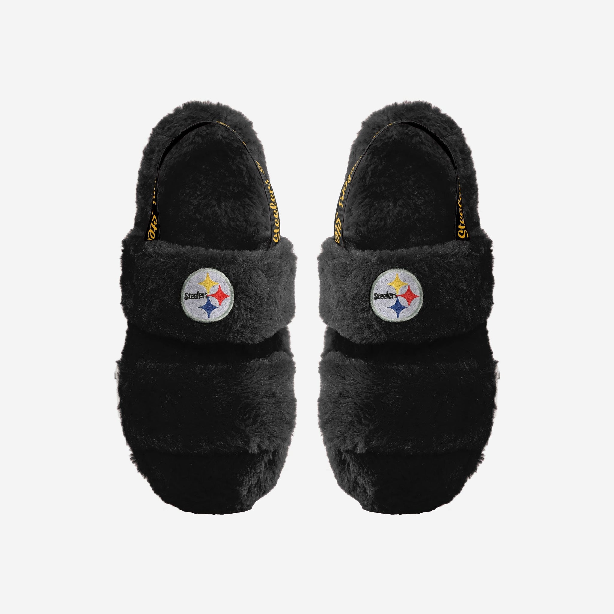 One, two, three, FUR! Watch the big game in style and comfort by rocking these Pittsburgh Steelers Women's Heel Strap Wordmark Fur Slides!