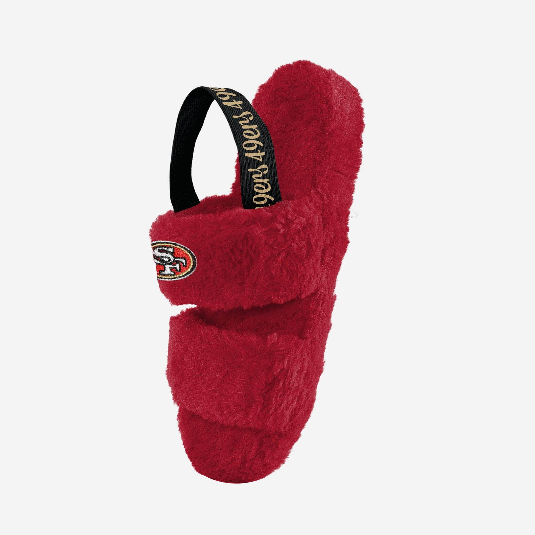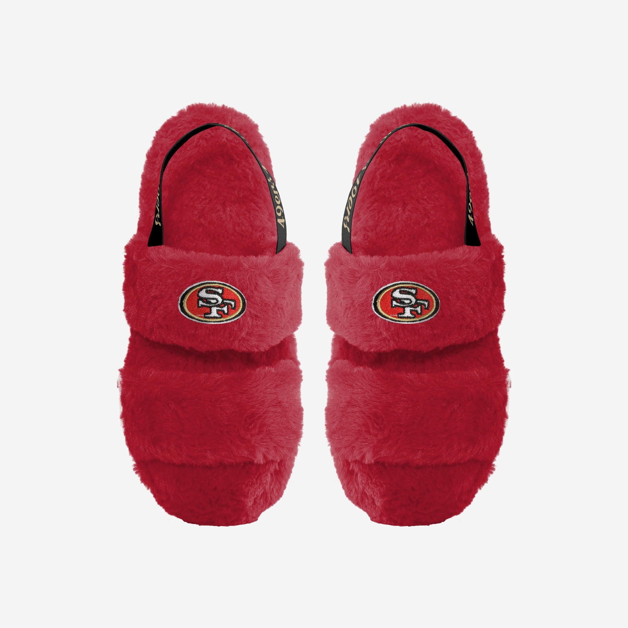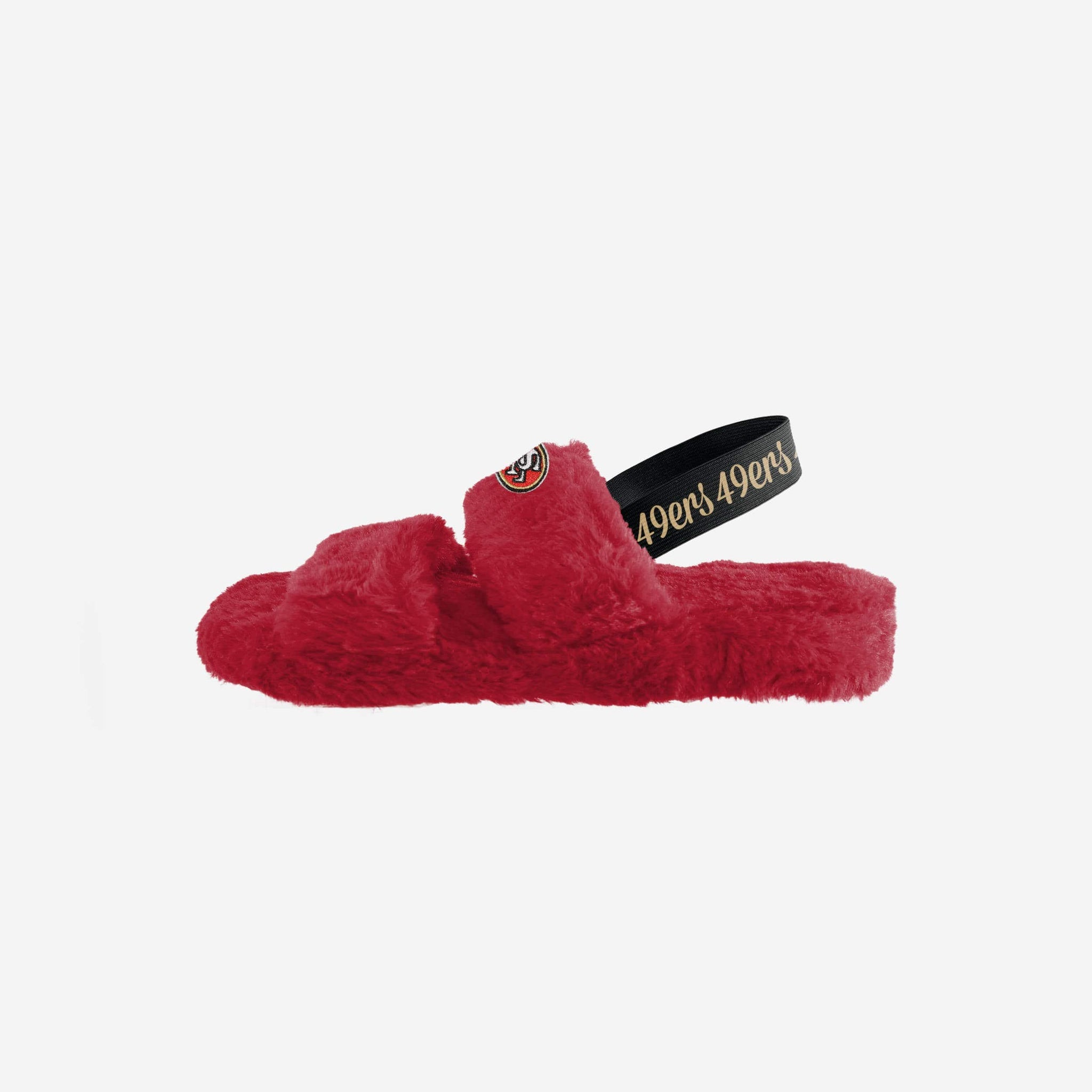 One, two, three, FUR! Watch the big game in style and comfort by rocking these San Francisco 49ers Women's Heel Strap Wordmark Fur Slides!