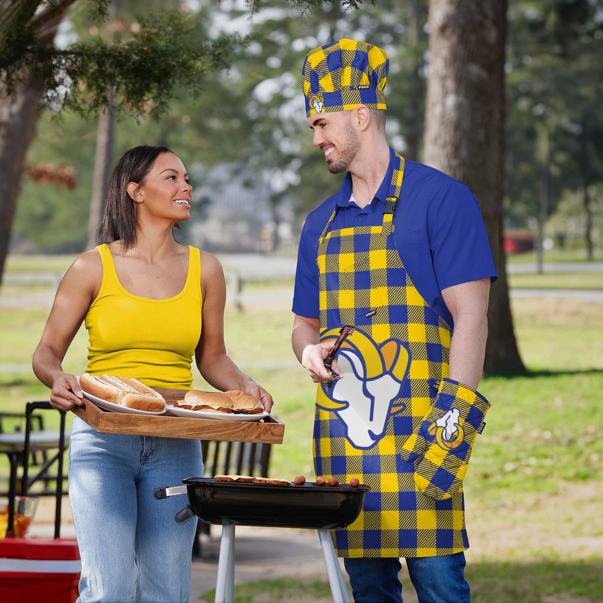 Get ready to serve up the best food in the greatest fan fit. From the kitchen, to the table, to game day, do it all in style with the Los Angeles Rams Plaid Chef Set.