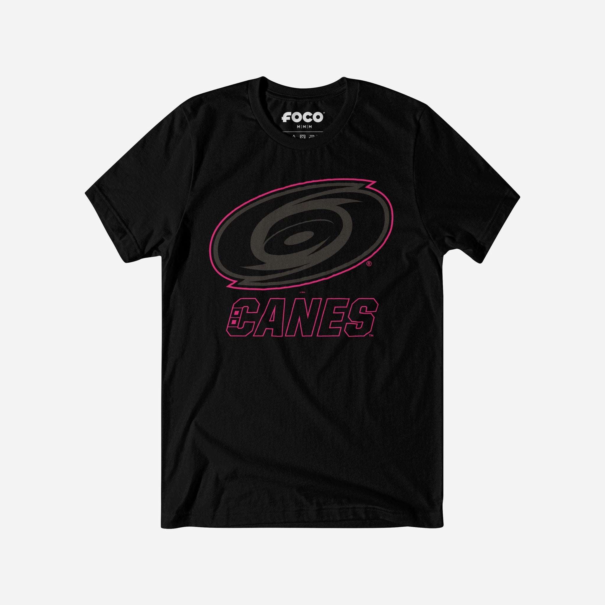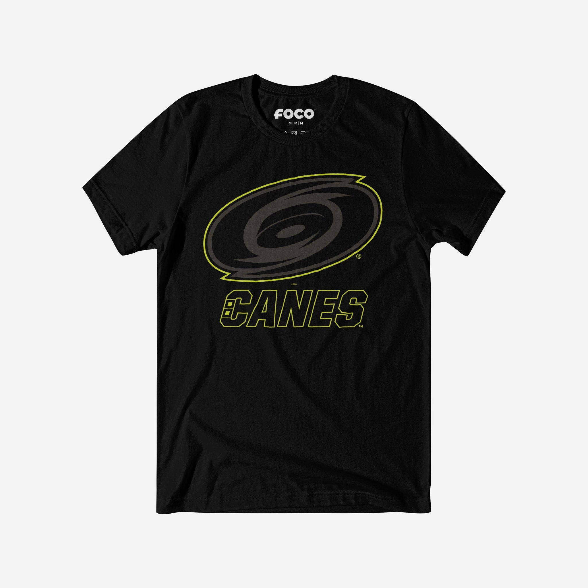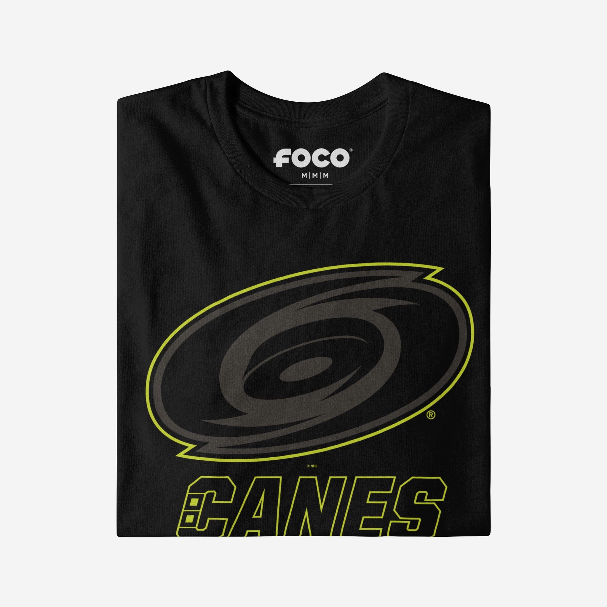 - Team logo display with highlight outline: The front of this apparel features a black Carolina Hurricanes team logo display outlined in neon, and a neon wordmark team name display