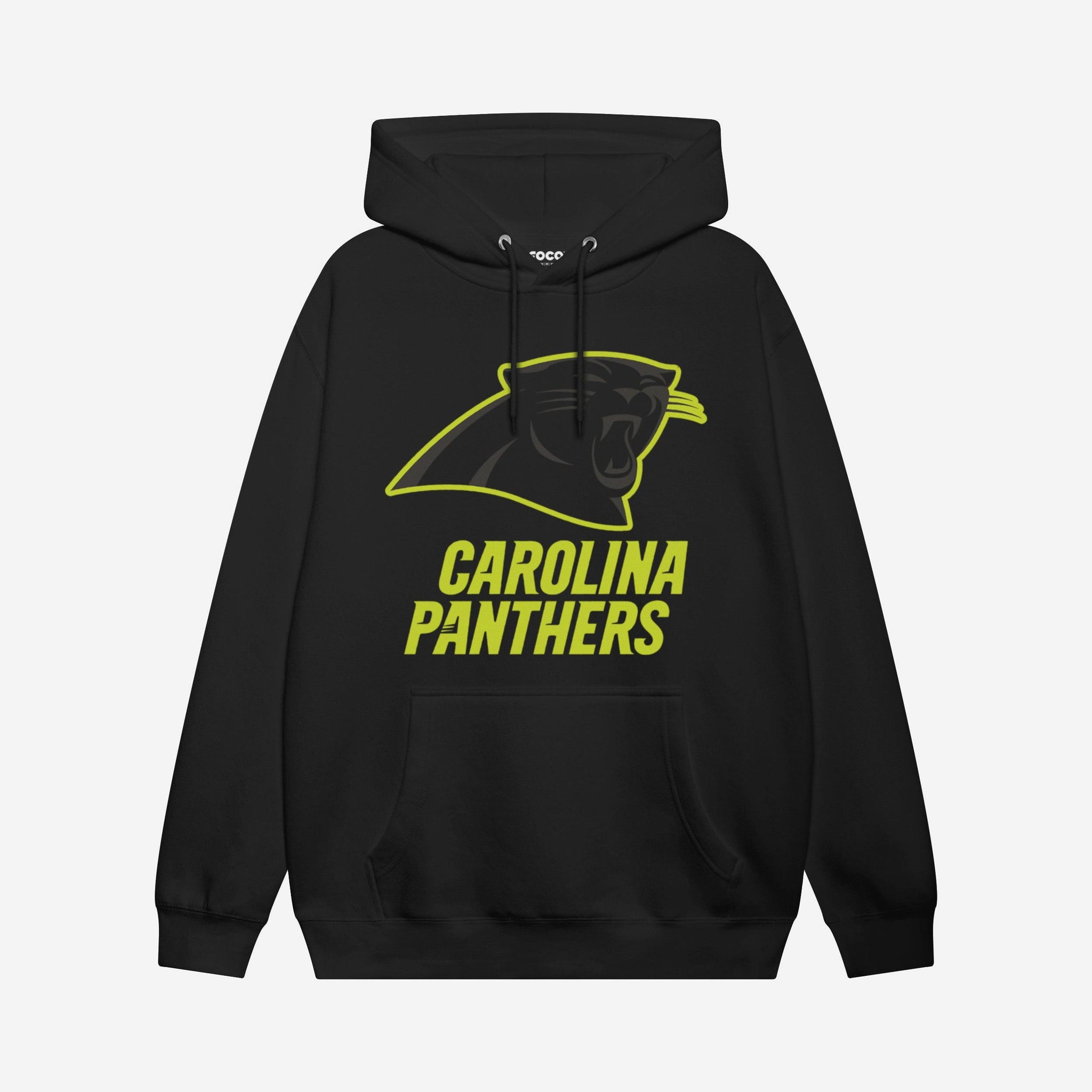• Team logo display with highlight outline: The front of this apparel features a black Carolina Panthers team logo display outlined in neon, and a neon team name display