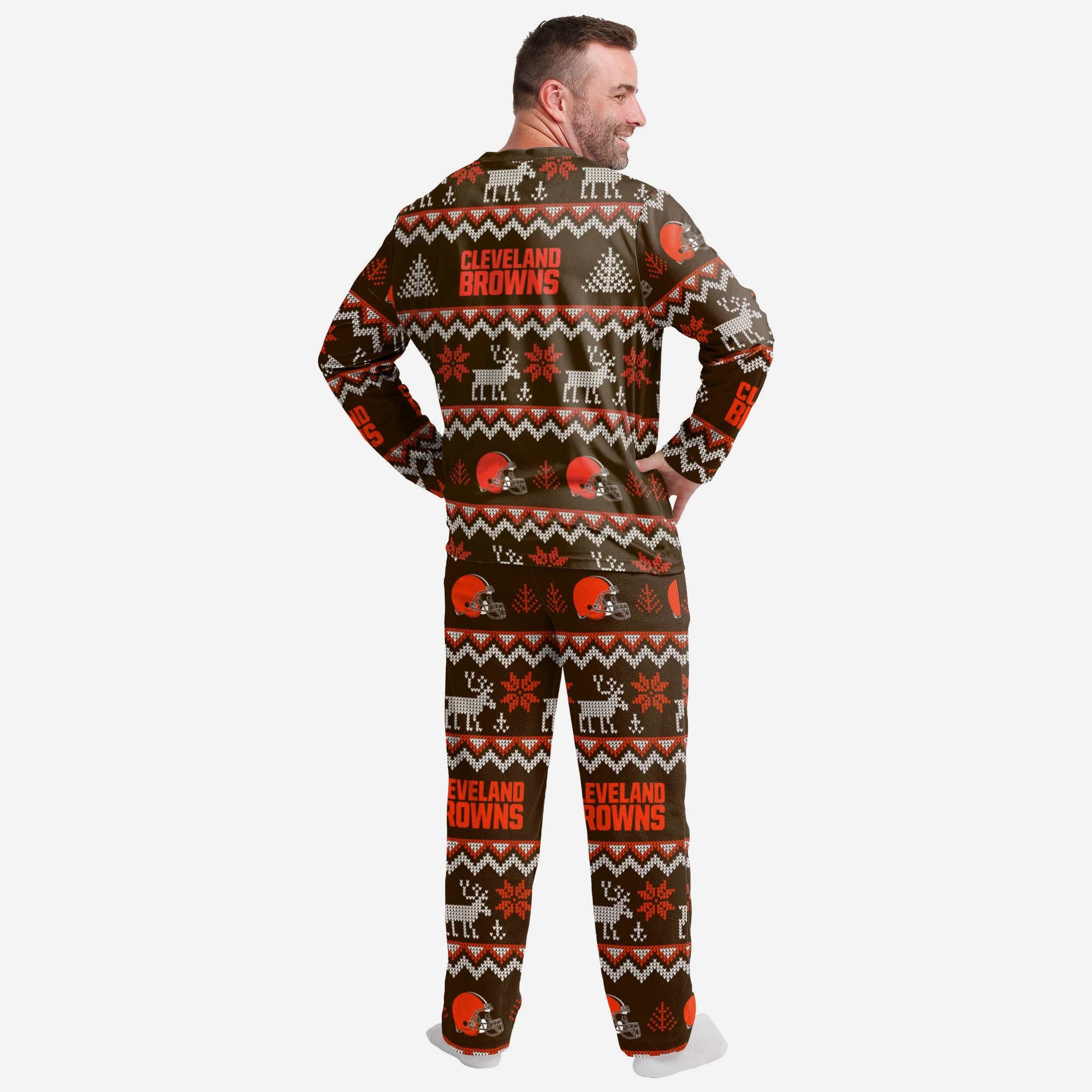 Get some matching family pajamas and dress to impress this holiday season! You won't want to miss these men's team pajamas! These men's PJ's are comfortable and show off your team spirit in the form of some sweet men's jammies. Introducing the Cleveland Browns Ugly Pattern Family Holiday Pajamas! Don't forget to take your holiday photo with the whole family wearing matching Christmas pajamas!