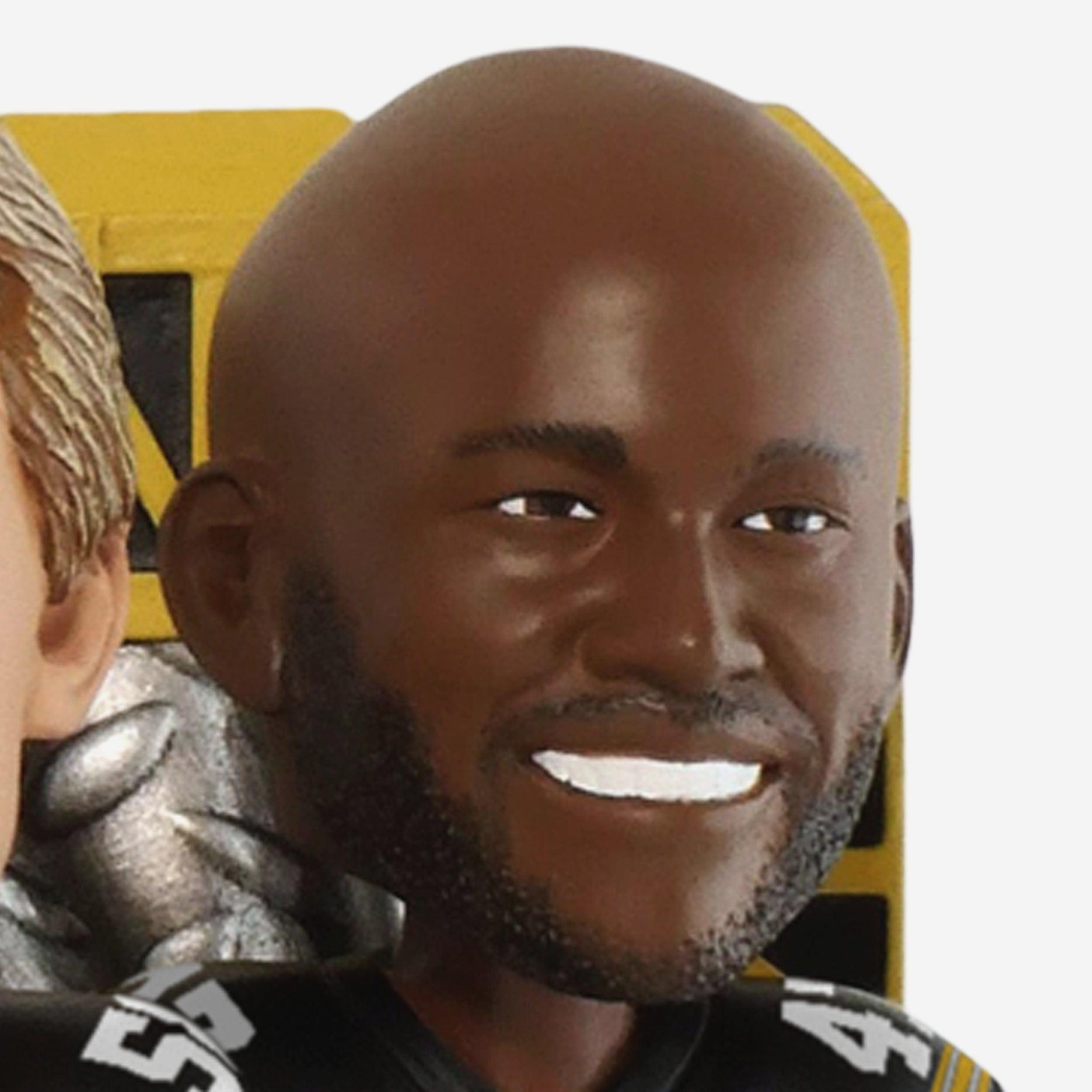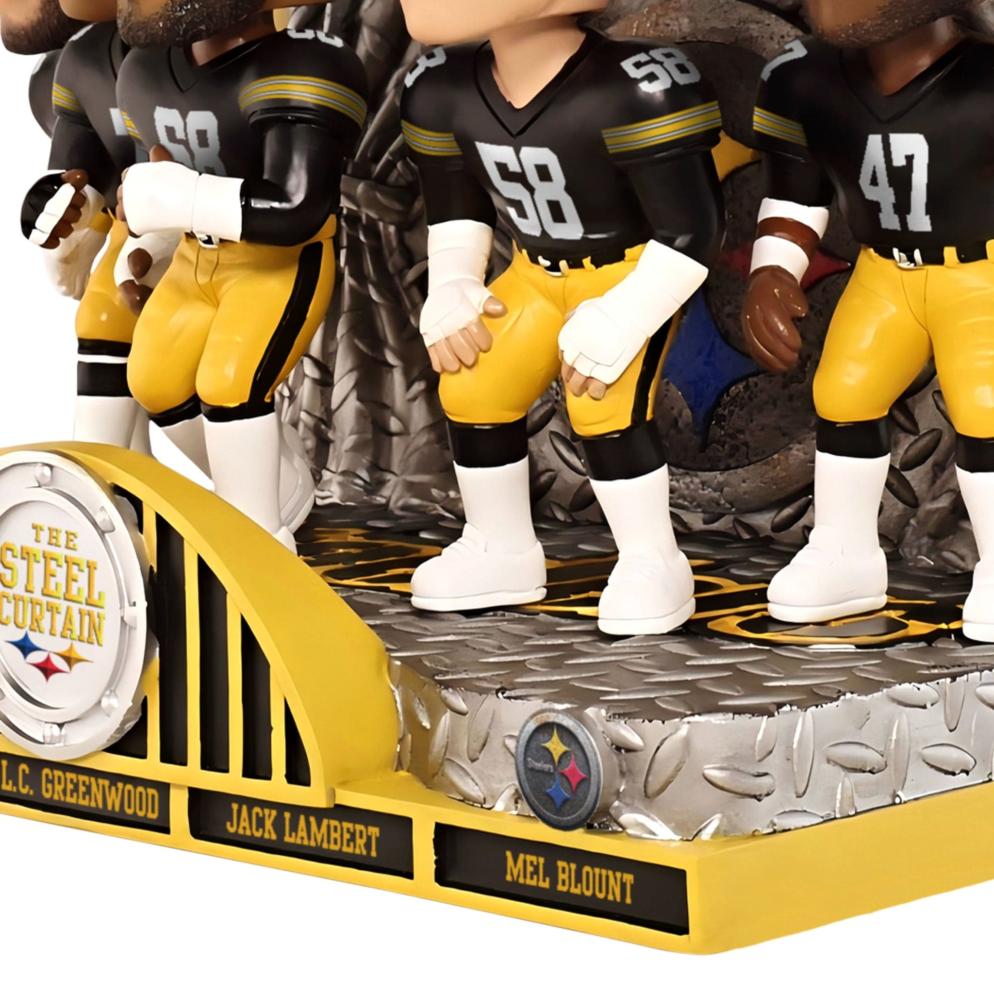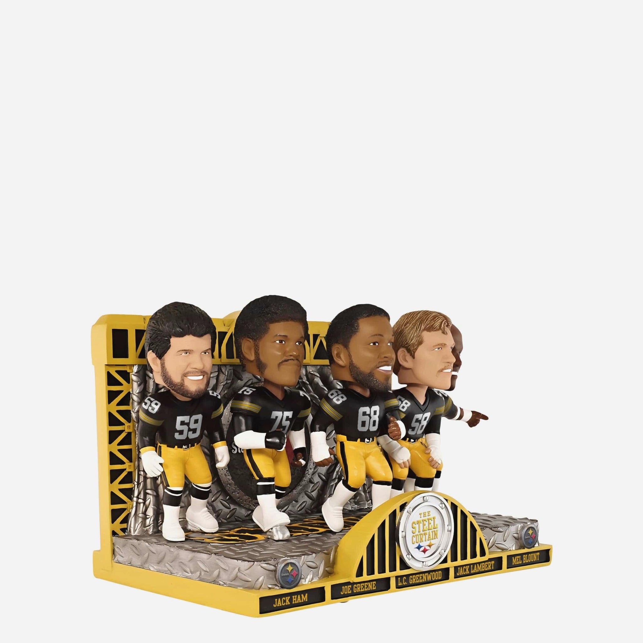 • Portrays Jack Lambert, Jack Ham, Mel Blount, L.C. Greenwood, and Joe Greene wearing their gameday uniforms in action poses, ready to show off the Steel Curtain defense