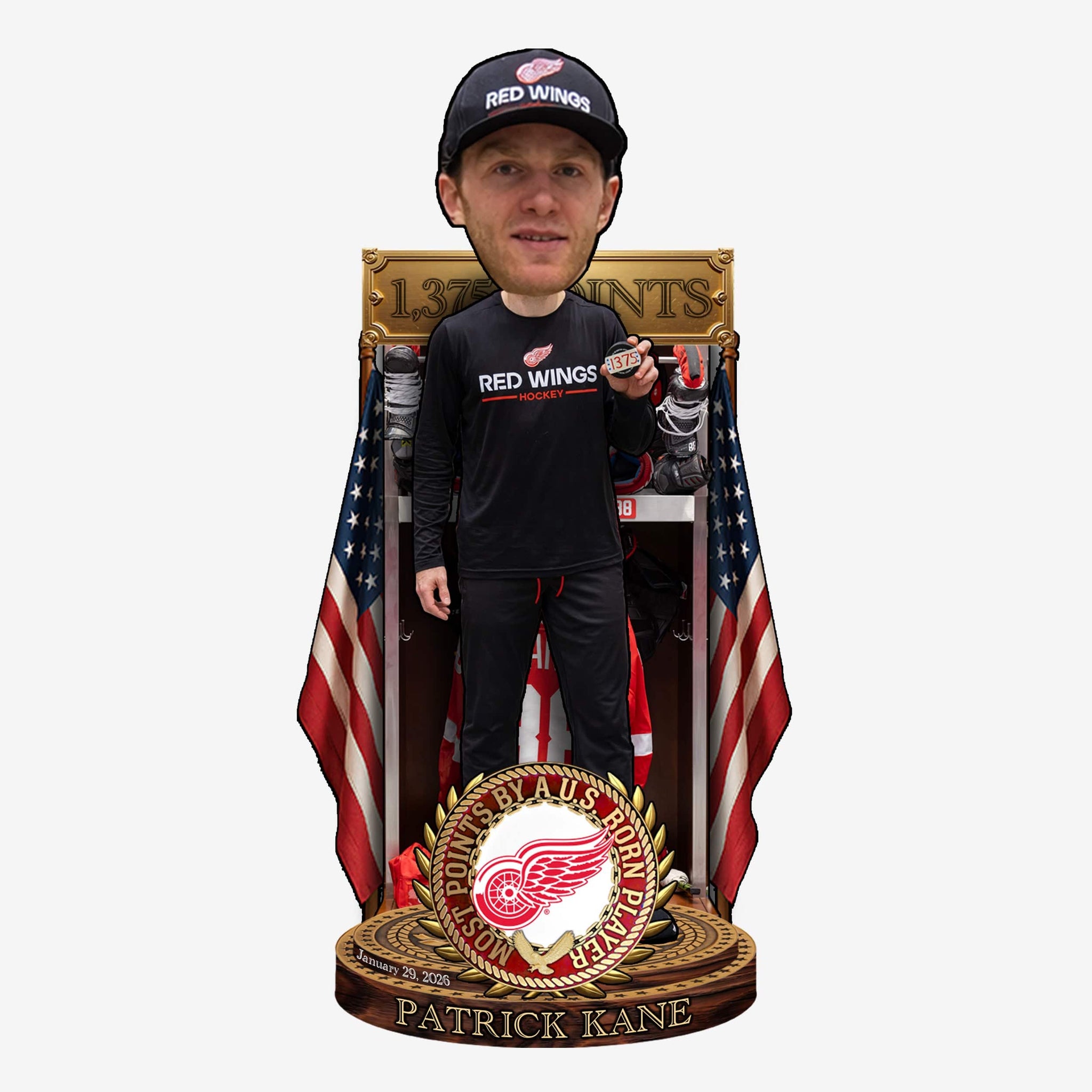 1,375 points and counting! Add an American-made milestone moment to your collection with the Patrick Kane Detroit Red Wings All-Time American-Born Points Leader Bobblehead.