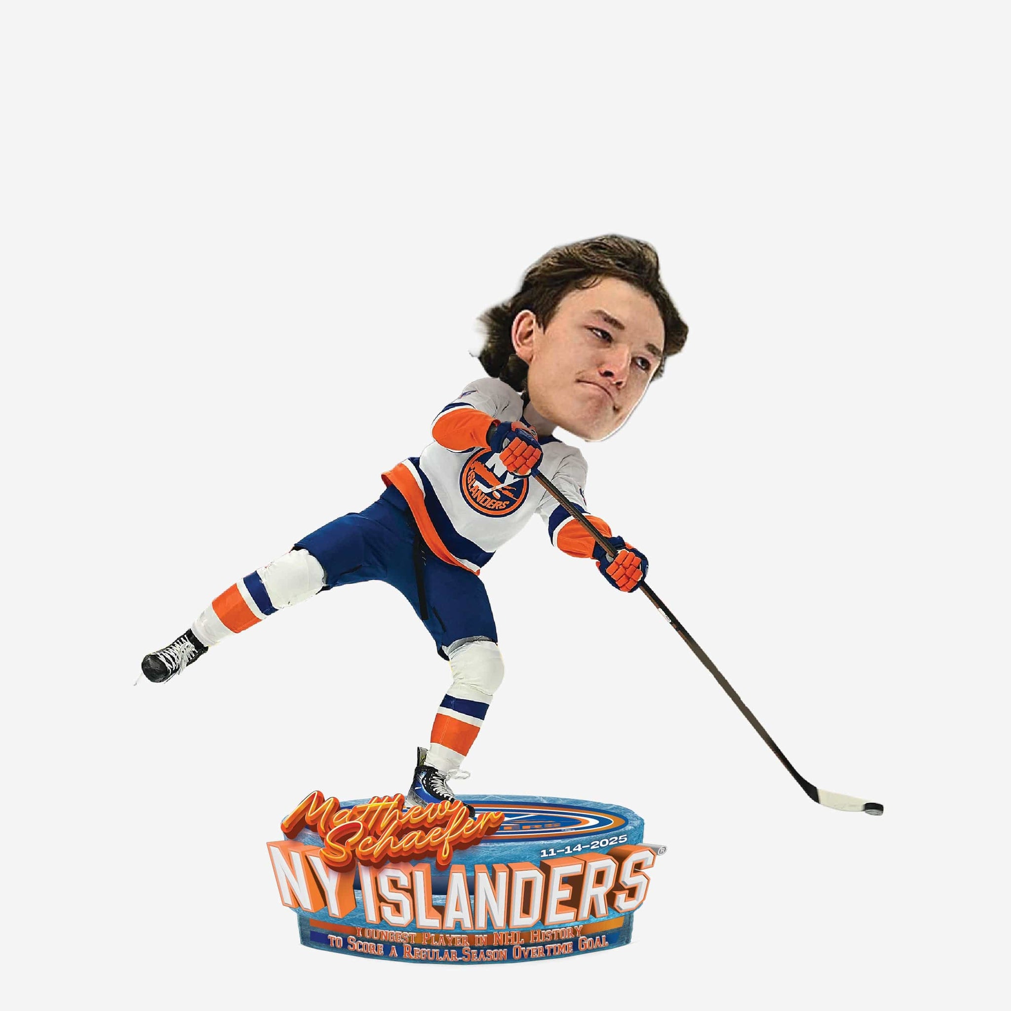 History came early on the Island! Celebrate a record-setting moment on the ice with this Matthew Schaefer New York Islanders Youngest Regular Season Overtime Goal Bobblehead.