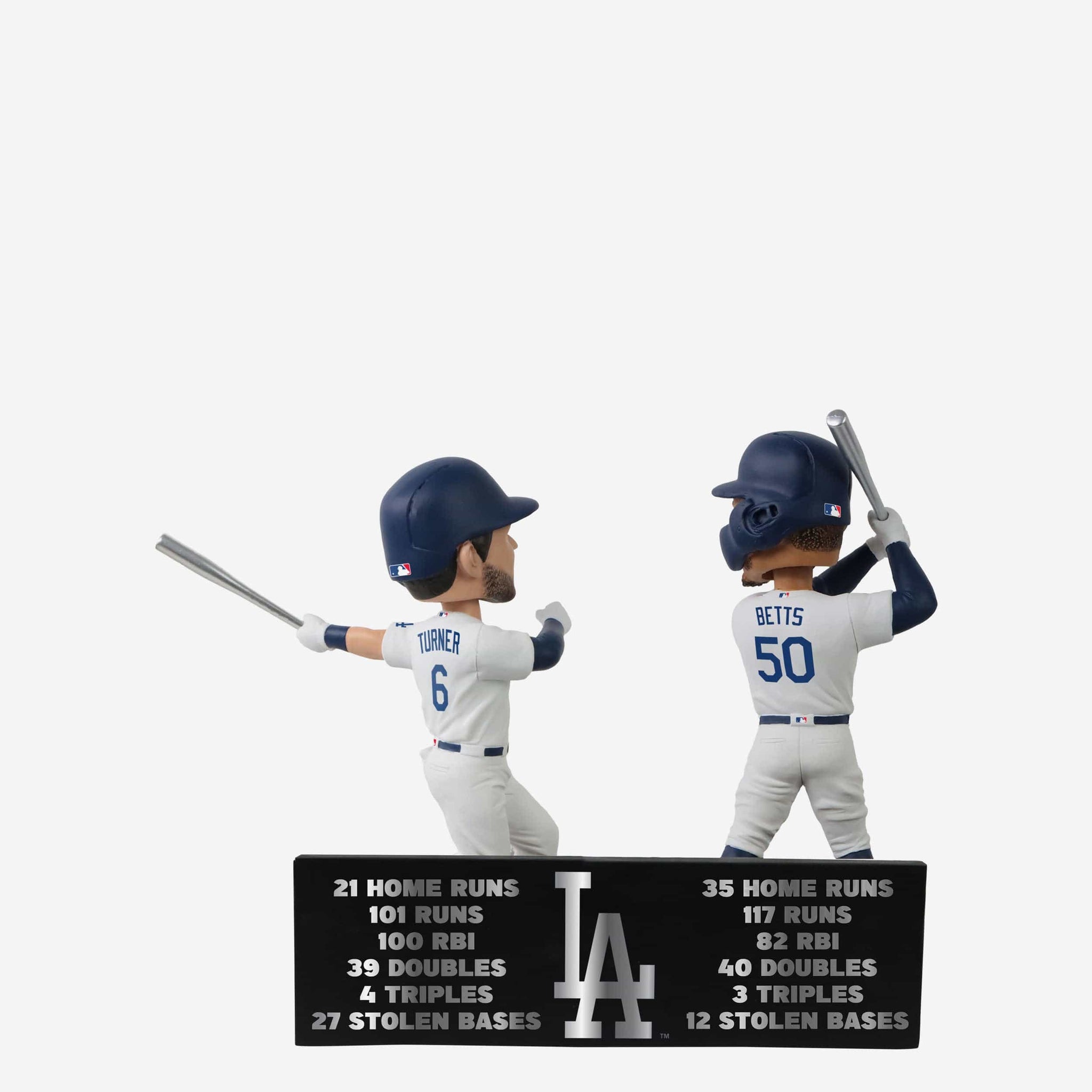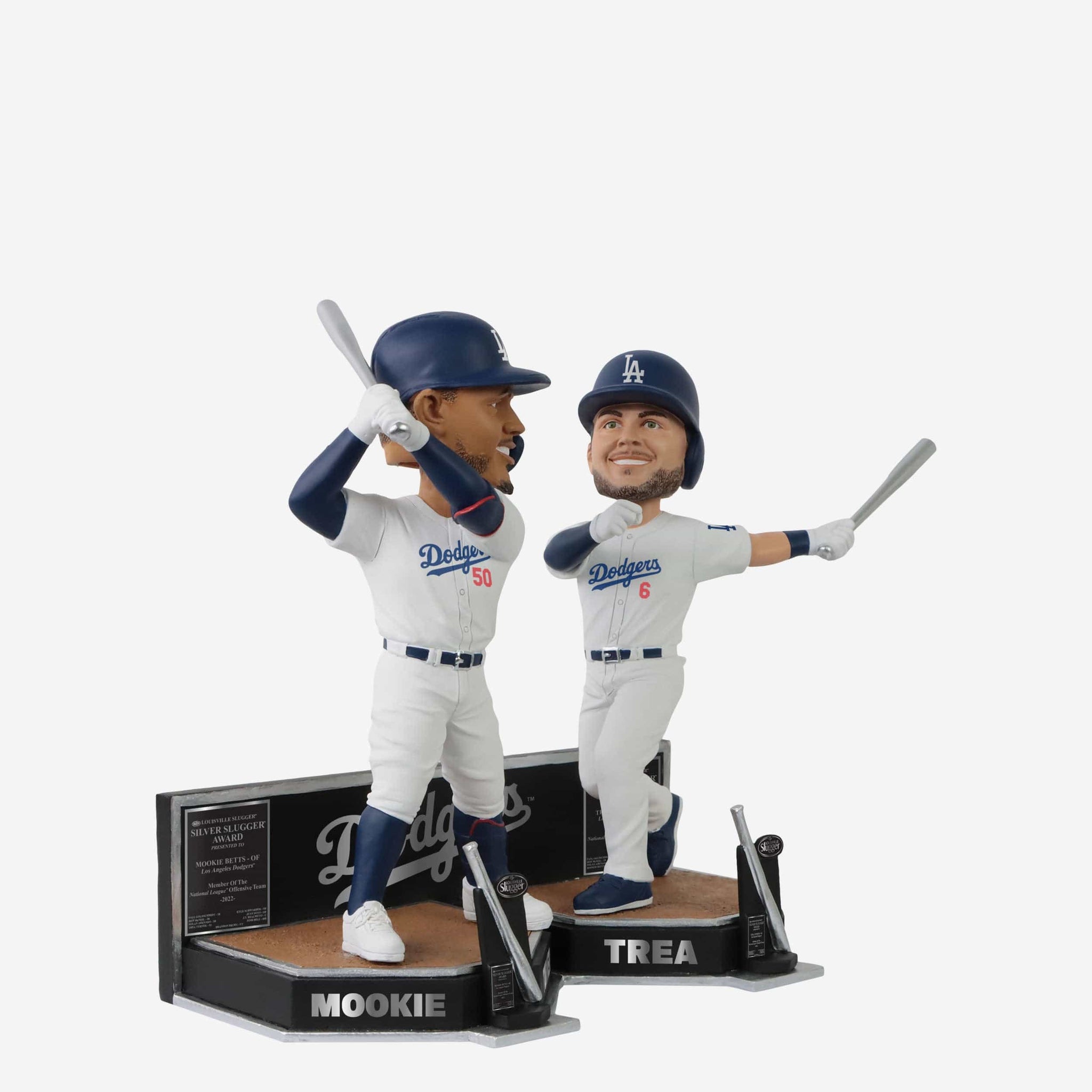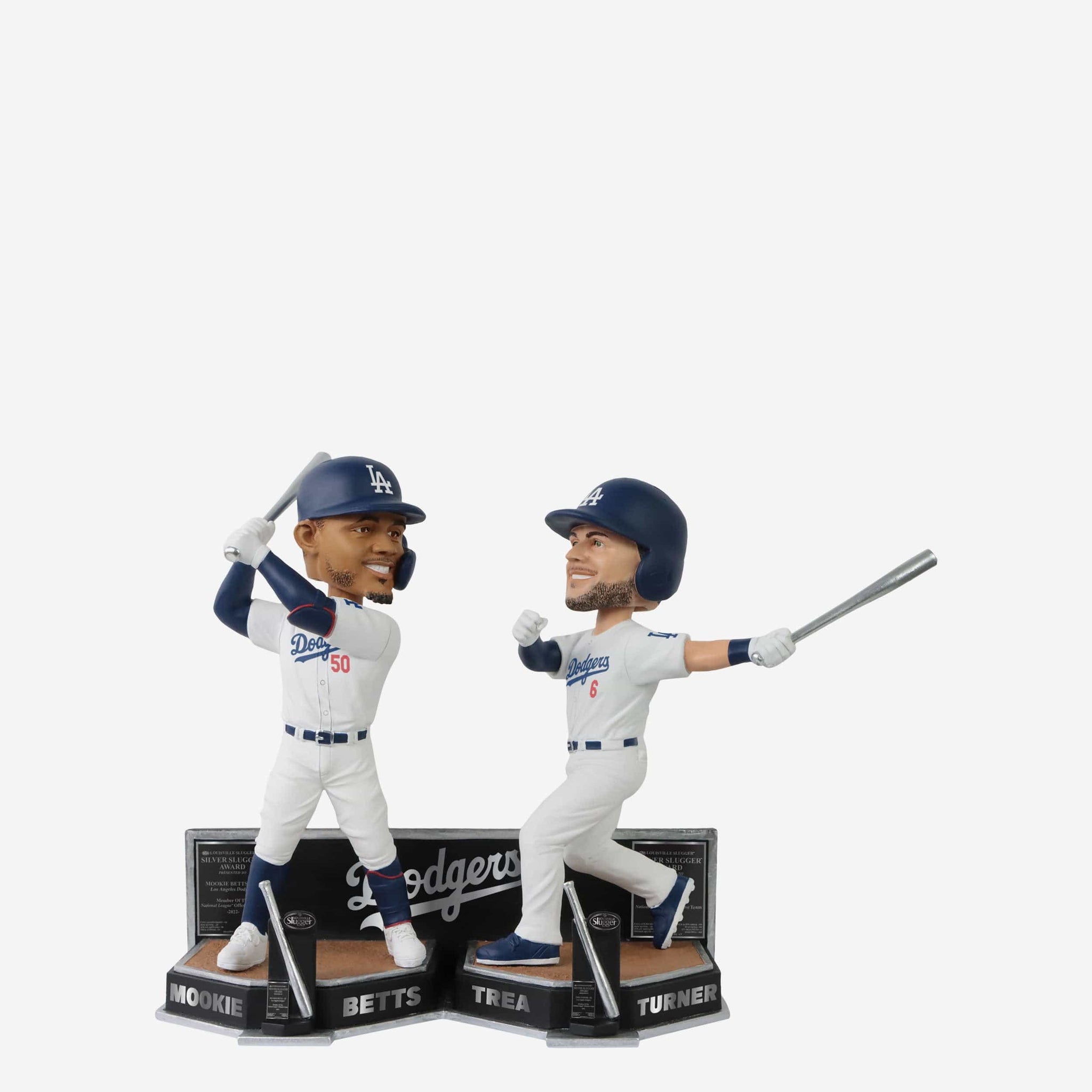 This Hollywood duo is ready for the spotlight. Bring some silver to your blue carpet premiere with the Mookie Betts & Trea Turner Los Angeles Dodgers 2022 Silver Slugger Dual Bobblehead.