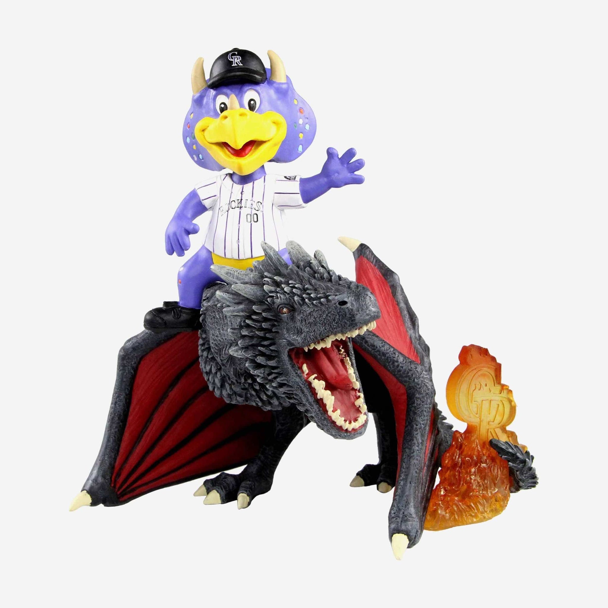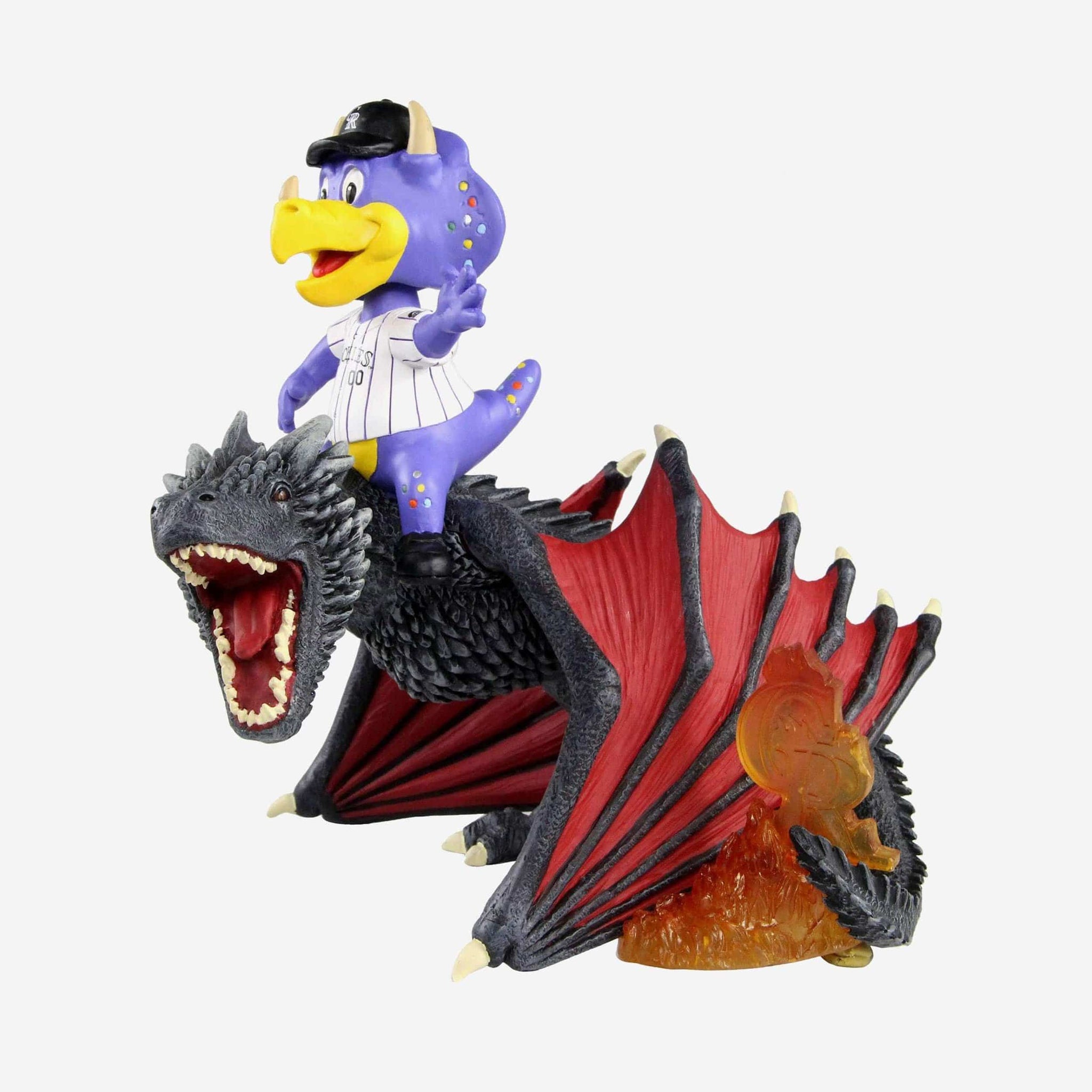Do you ever find yourself in a moment of panic, shouting something along the lines of "WHERE ARE MY DRAGONS!?" Panic no more. Because your dragon is right here, along with your favorite mascot. Meet the Colorado Rockies Dinger Game of Thrones Mascot on Fire Dragon Bobblehead.