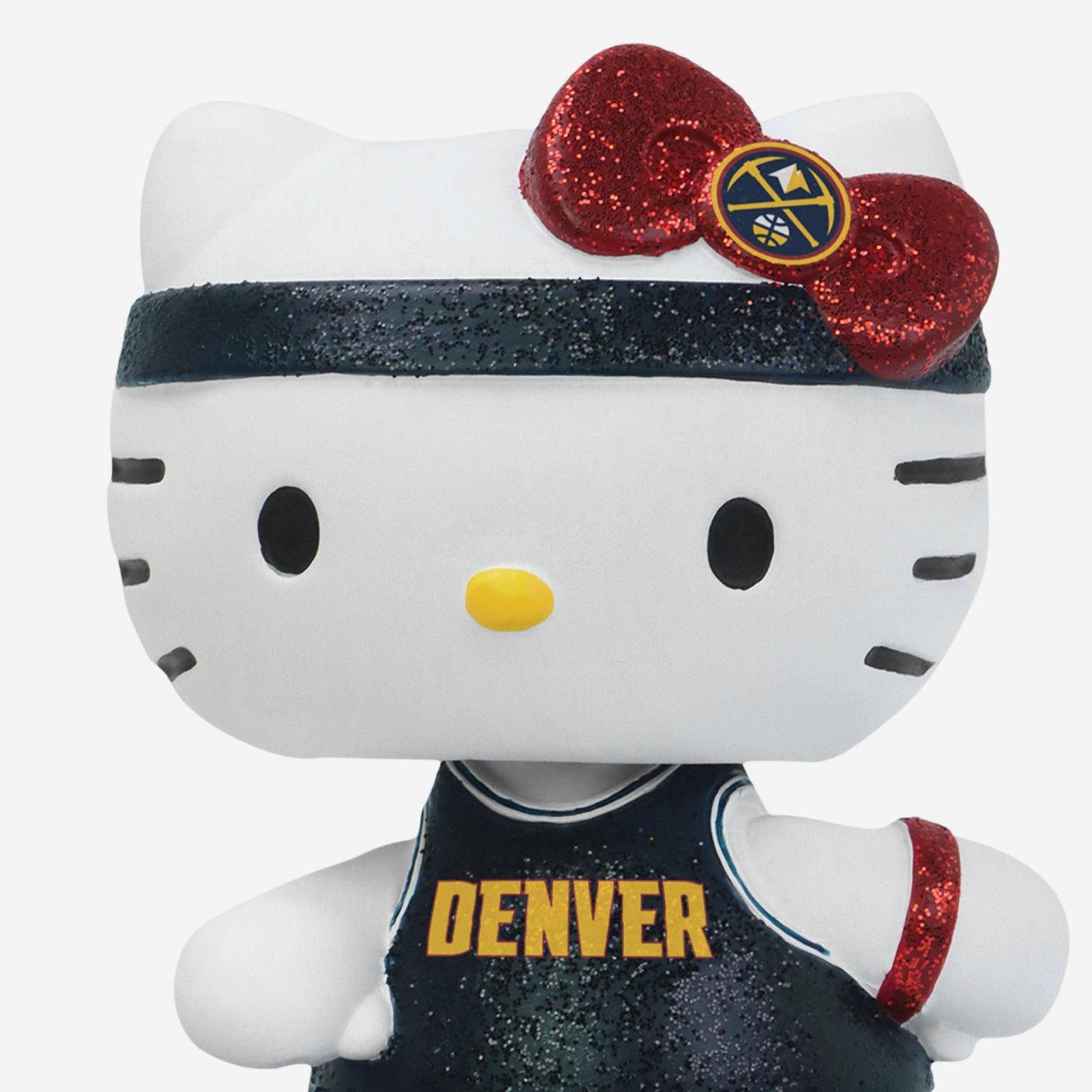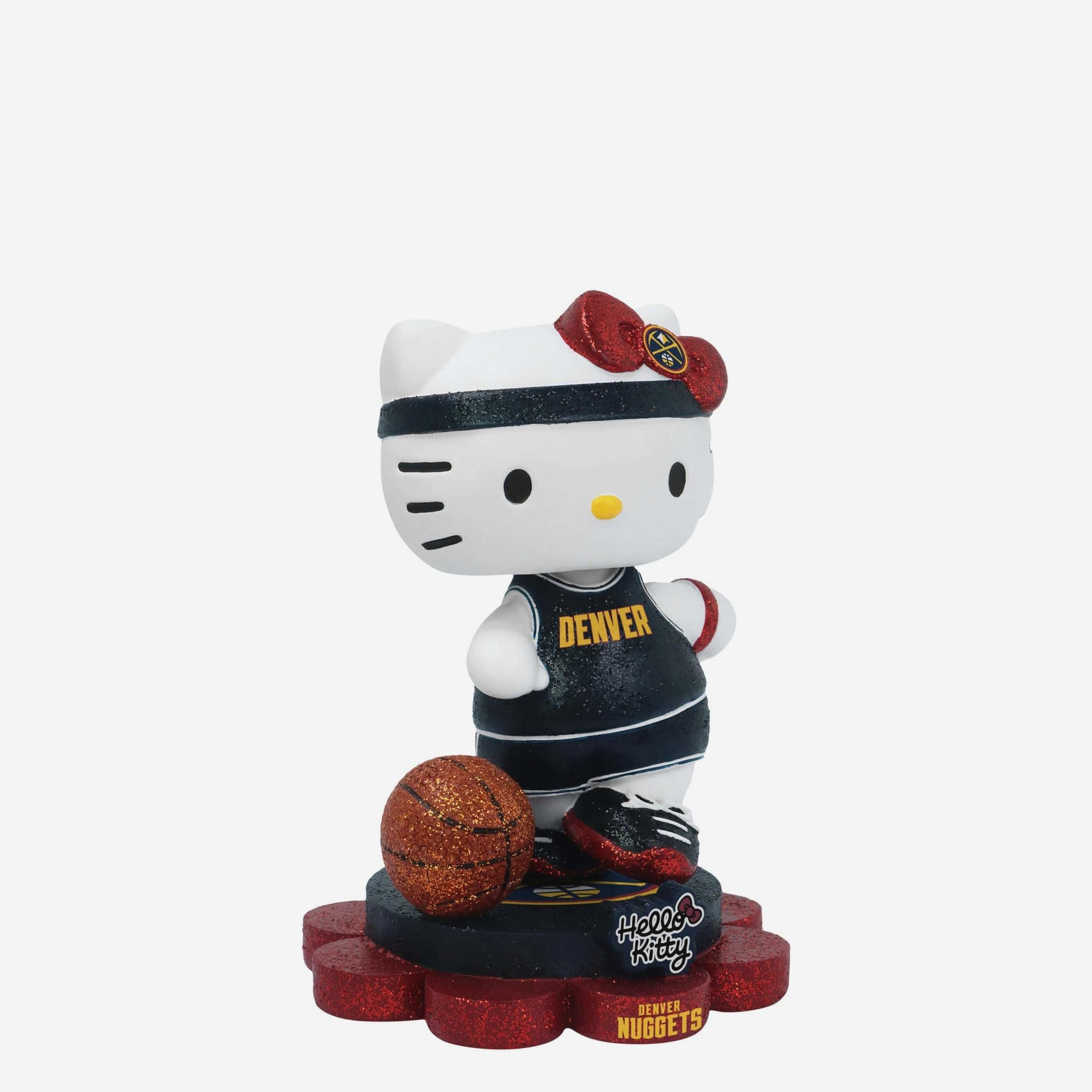 Cute, collectible, and courtside-ready! Hello Kitty® is officially hitting the hardwood and your collection in sparkle style with the Denver Nuggets Hello Kitty® Glitter Mini Bobblehead.