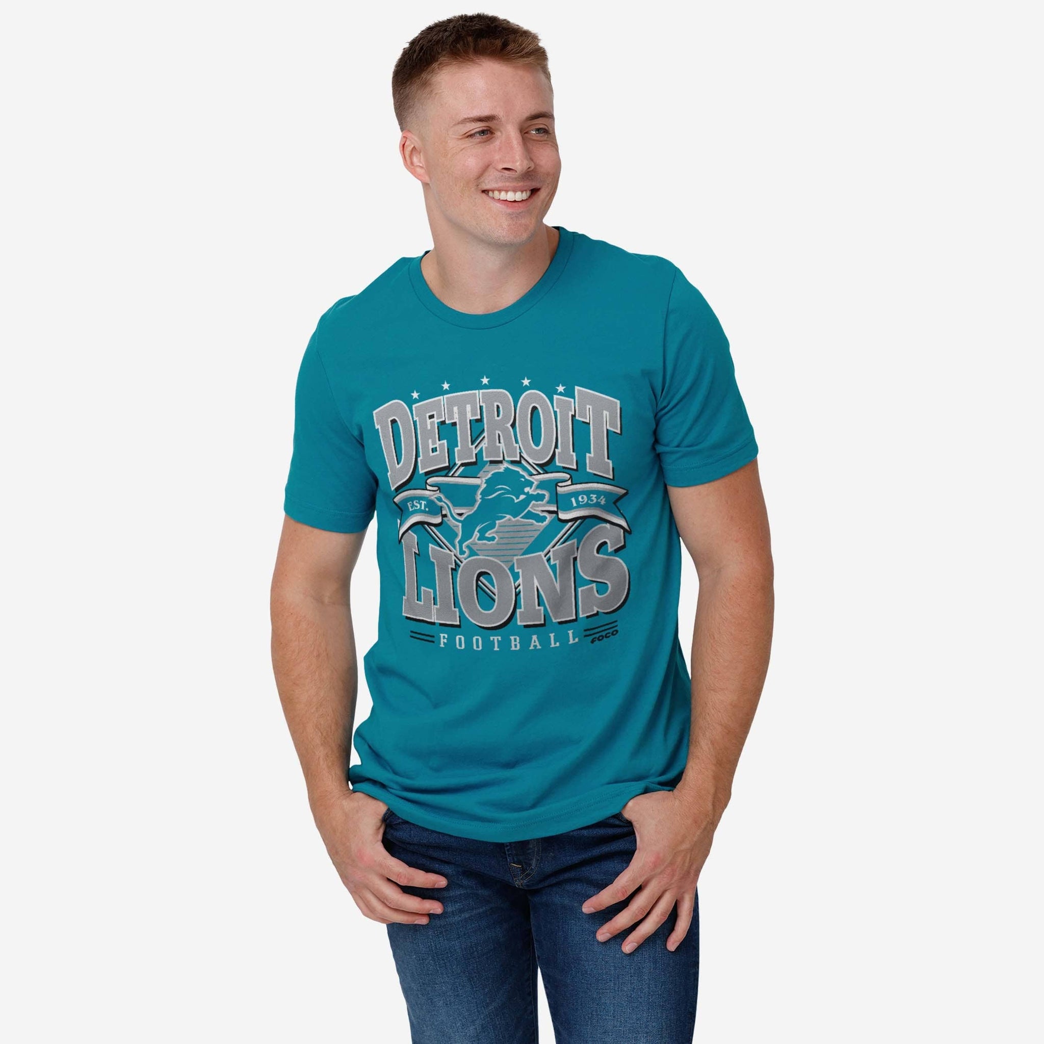• All-over, team-colored design: This traditional t-shirt shows off the official Detroit Lions colors in an all-over, team-colored design, so you can show your team spirit with pride.
