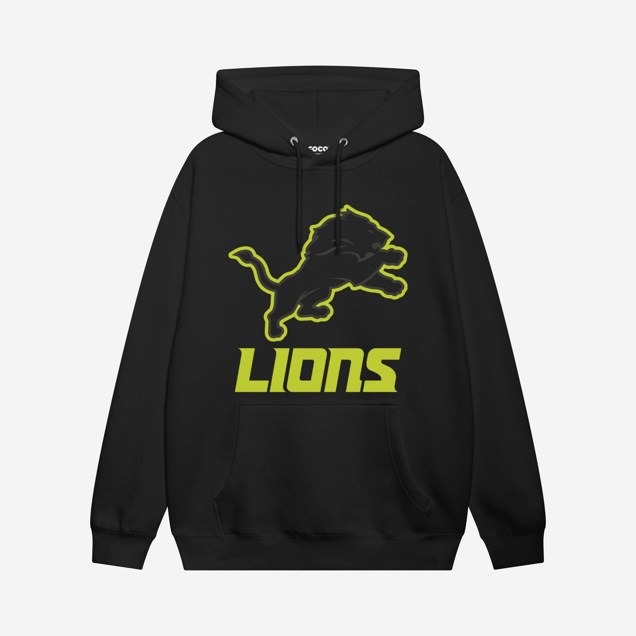 - Team logo display with highlight outline: The front of this apparel features a black Detroit Lions team logo display outlined in neon, and a neon team name display