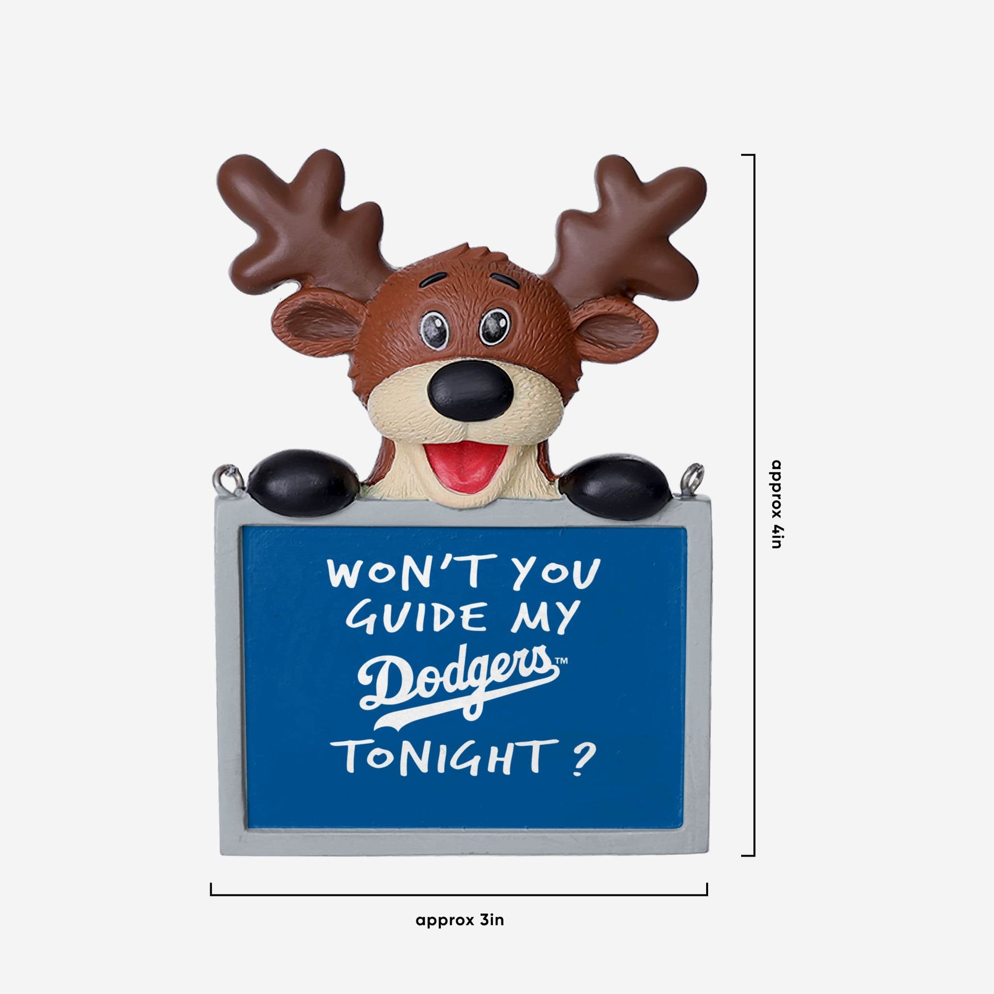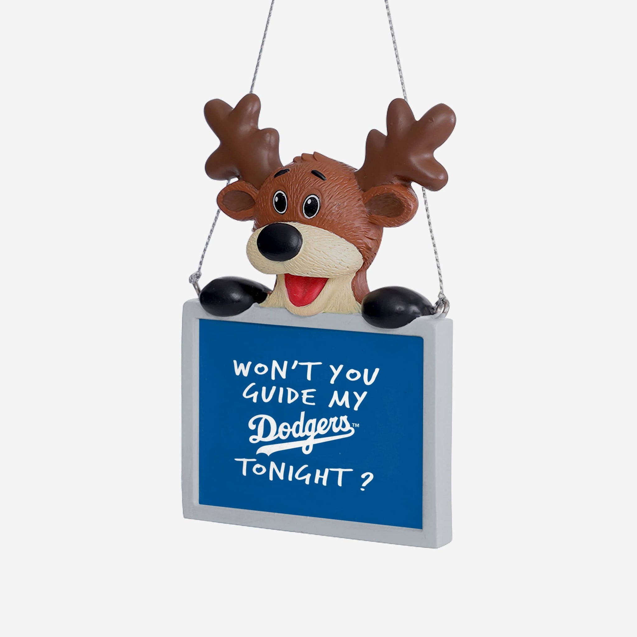 Tired: Dasher. Dancer. Prancer. Vixen. Wired: This Los Angeles Dodgers Reindeer with Sign Ornament.