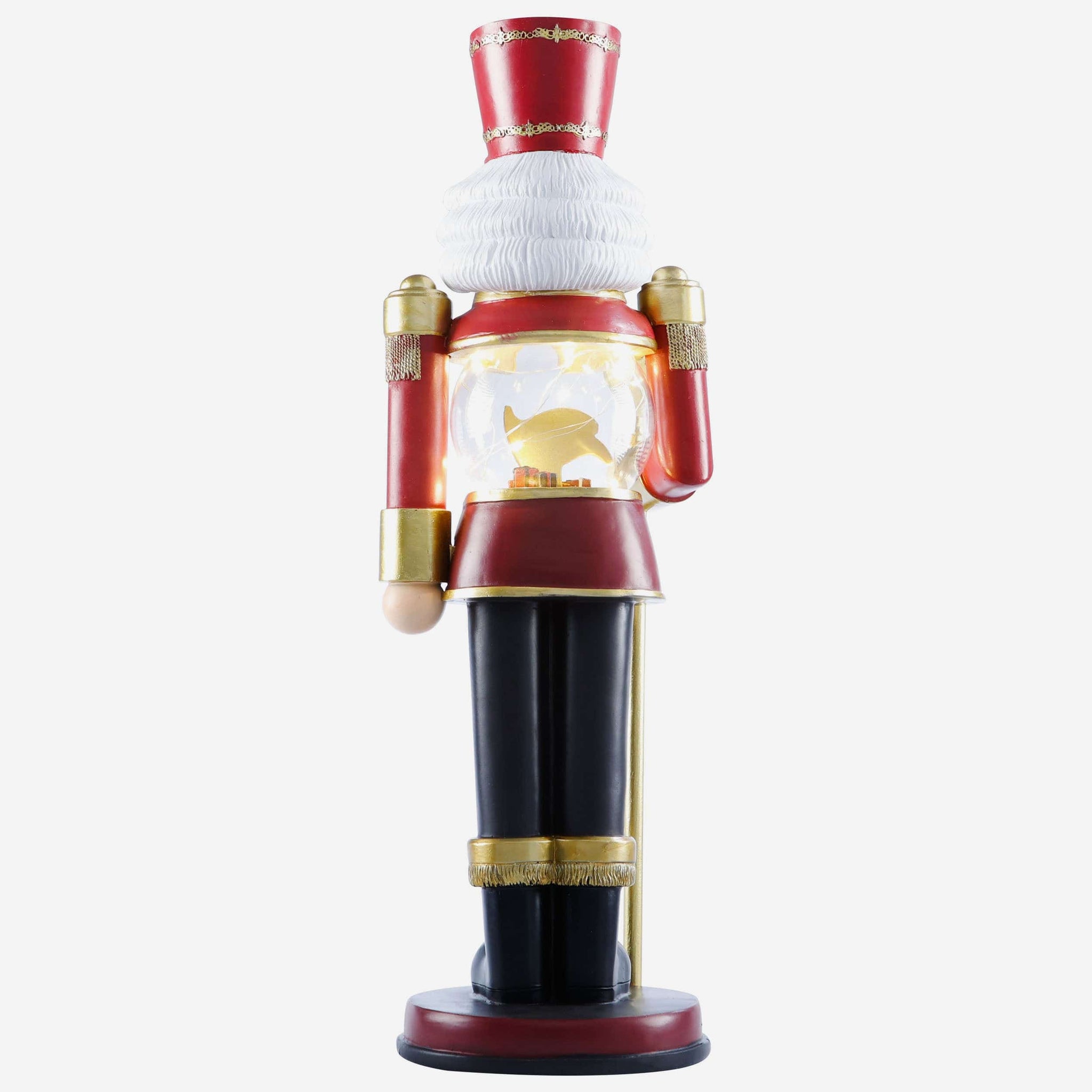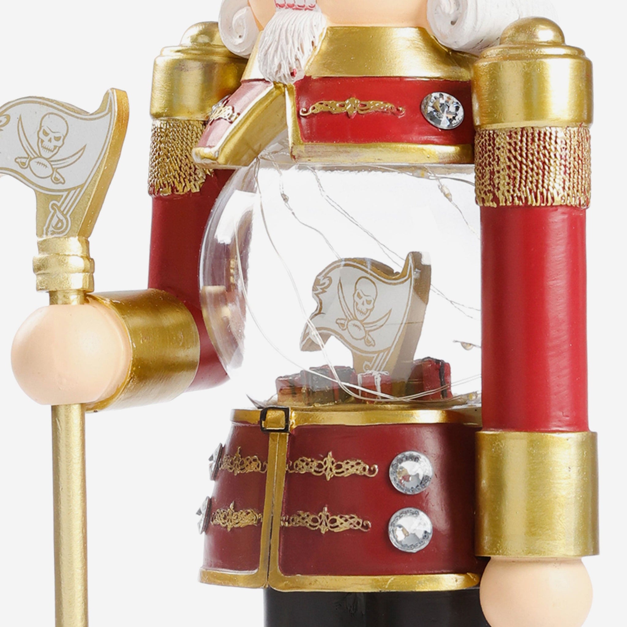 • Nutcracker's torso features clear globe with gold-colored team logo display, holiday gift accents, and light-up fairy lights for maximum holiday magic