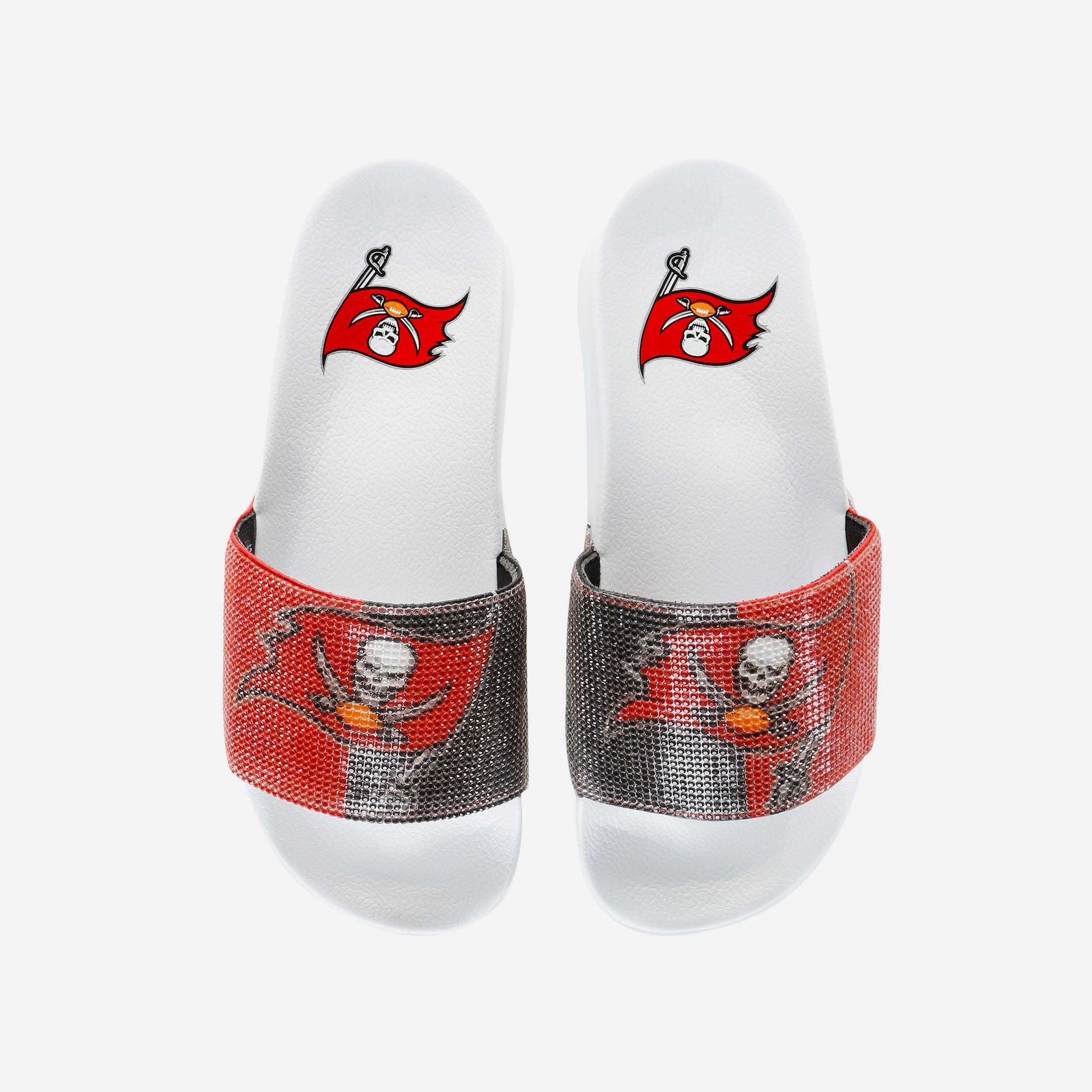These Tampa Bay Buccaneers Women's Big Logo Shimmer Slides are the jewel of fresh fan footwear! Let your team spirit shine like a beacon of awesome!