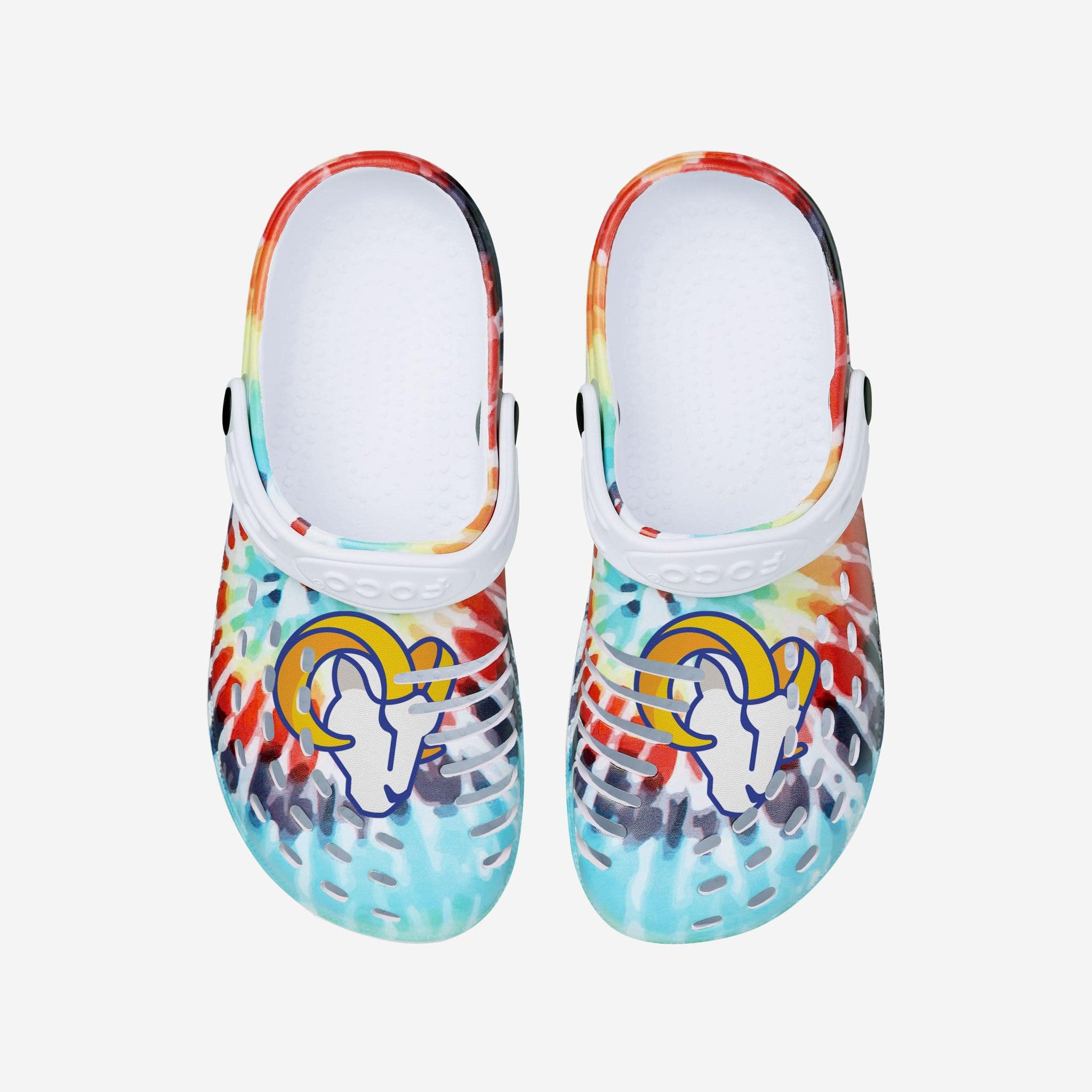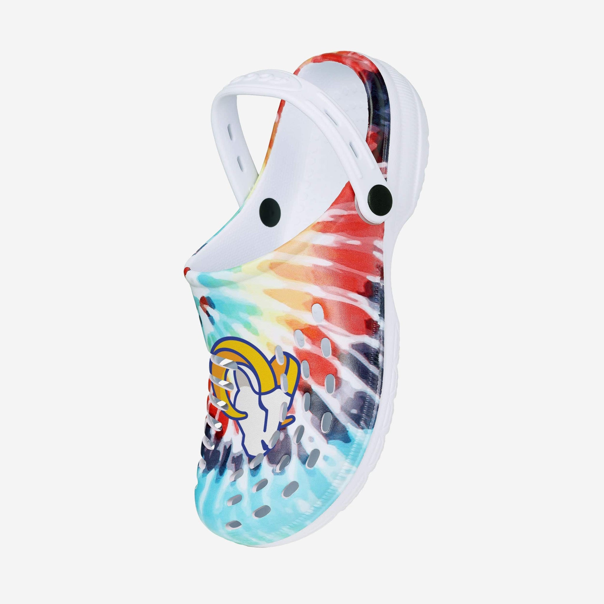 Peace. Love. Tie-dye. Step back in time with some style from yesteryear by rocking these Los Angeles Rams Women's Tie-Dye Clogs with Straps.
