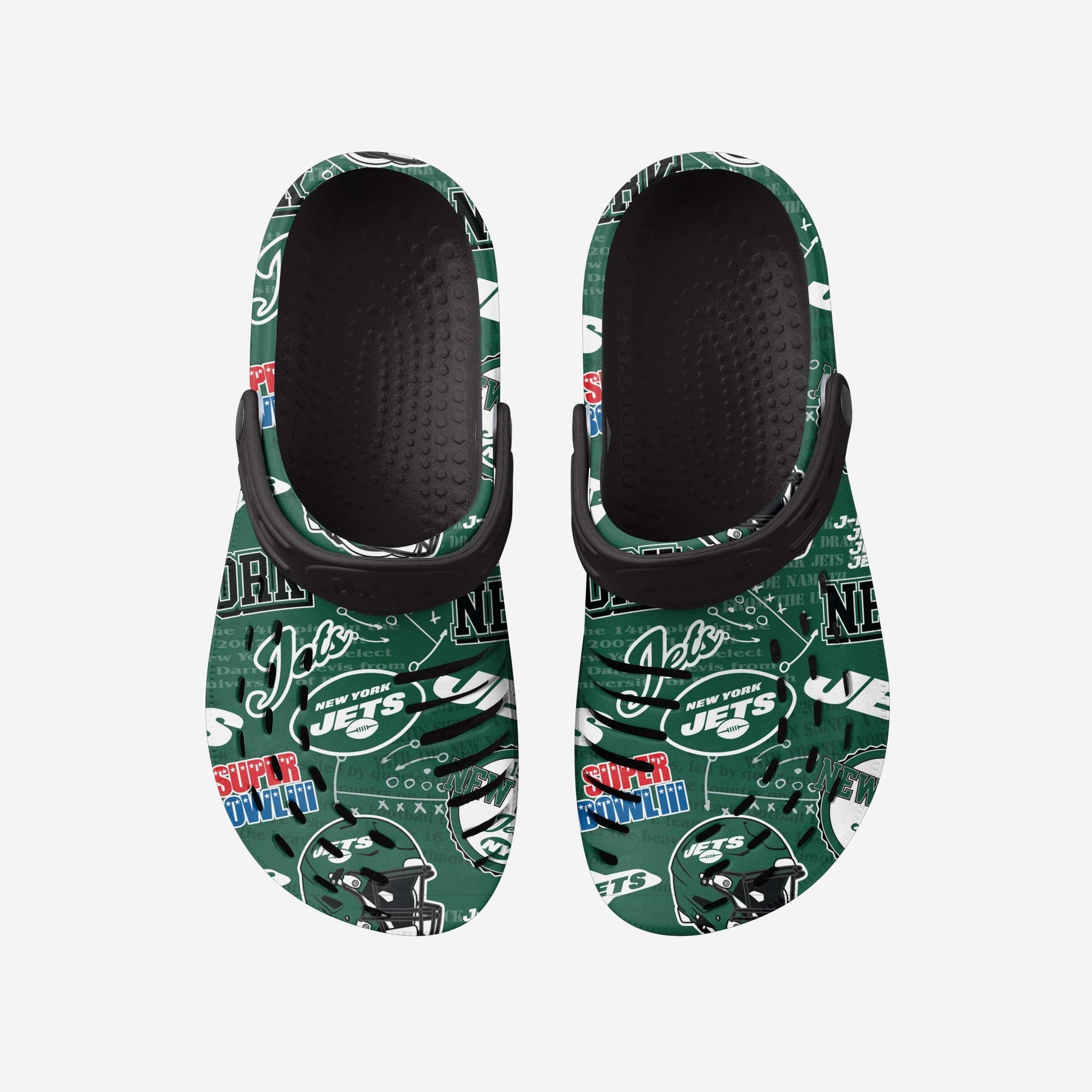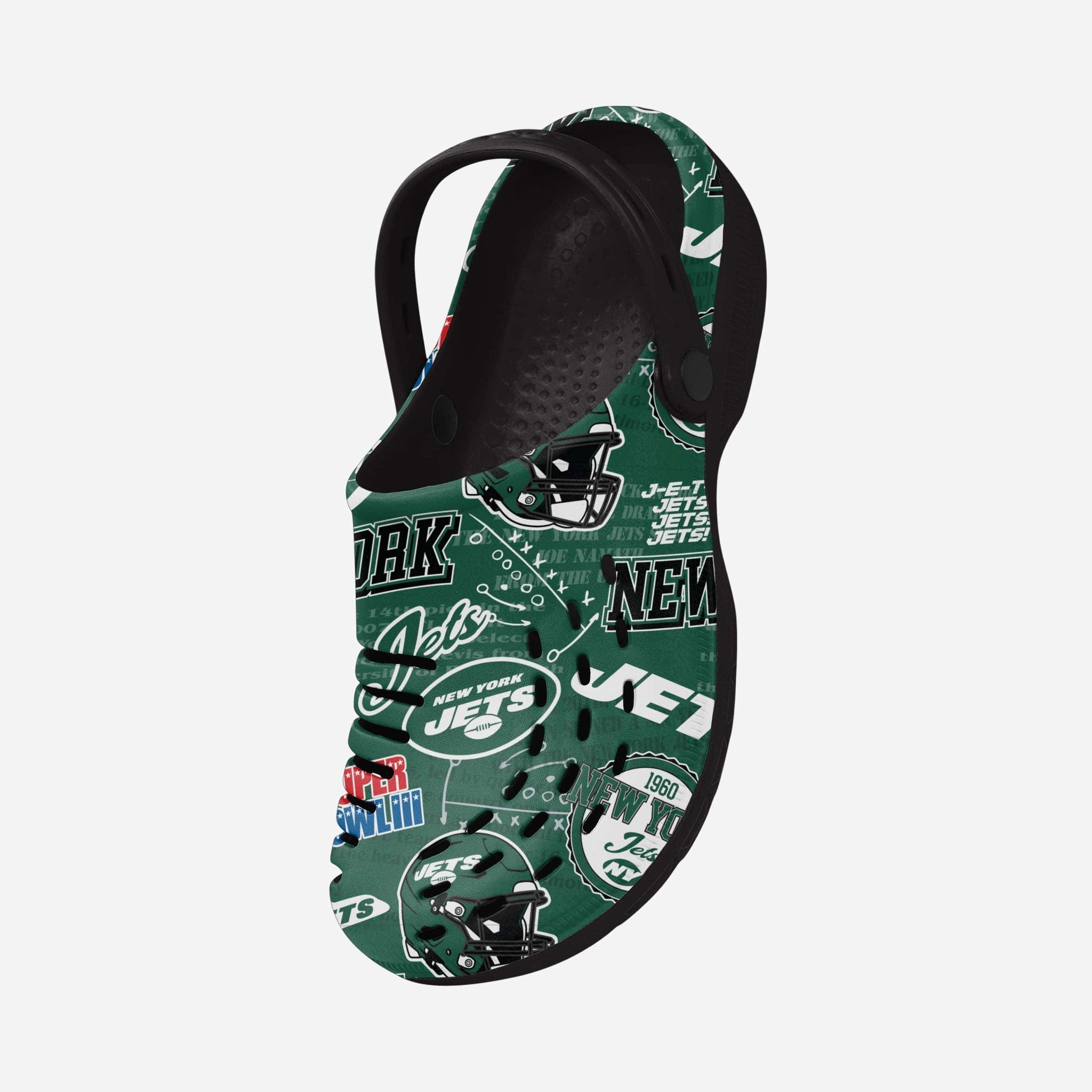 The New York Jets Historic Print Clogs with Straps are here to help you take a step into the time machine and celebrate your franchise's glorious history.
