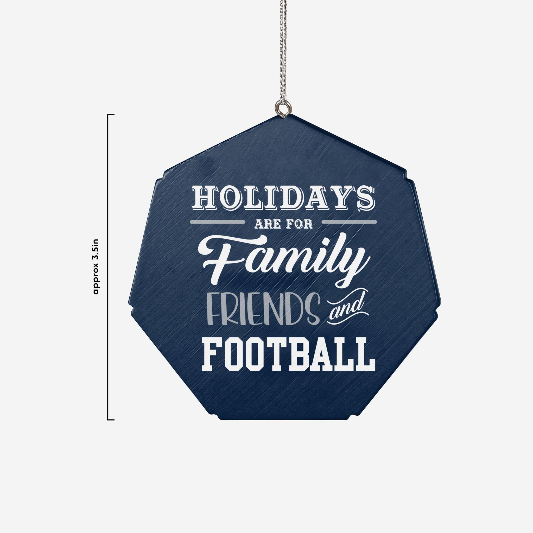 • ”HOLIDAYS ARE FOR FAMILY FRIENDS AND FOOTBALL” text display on reverse side of ornament