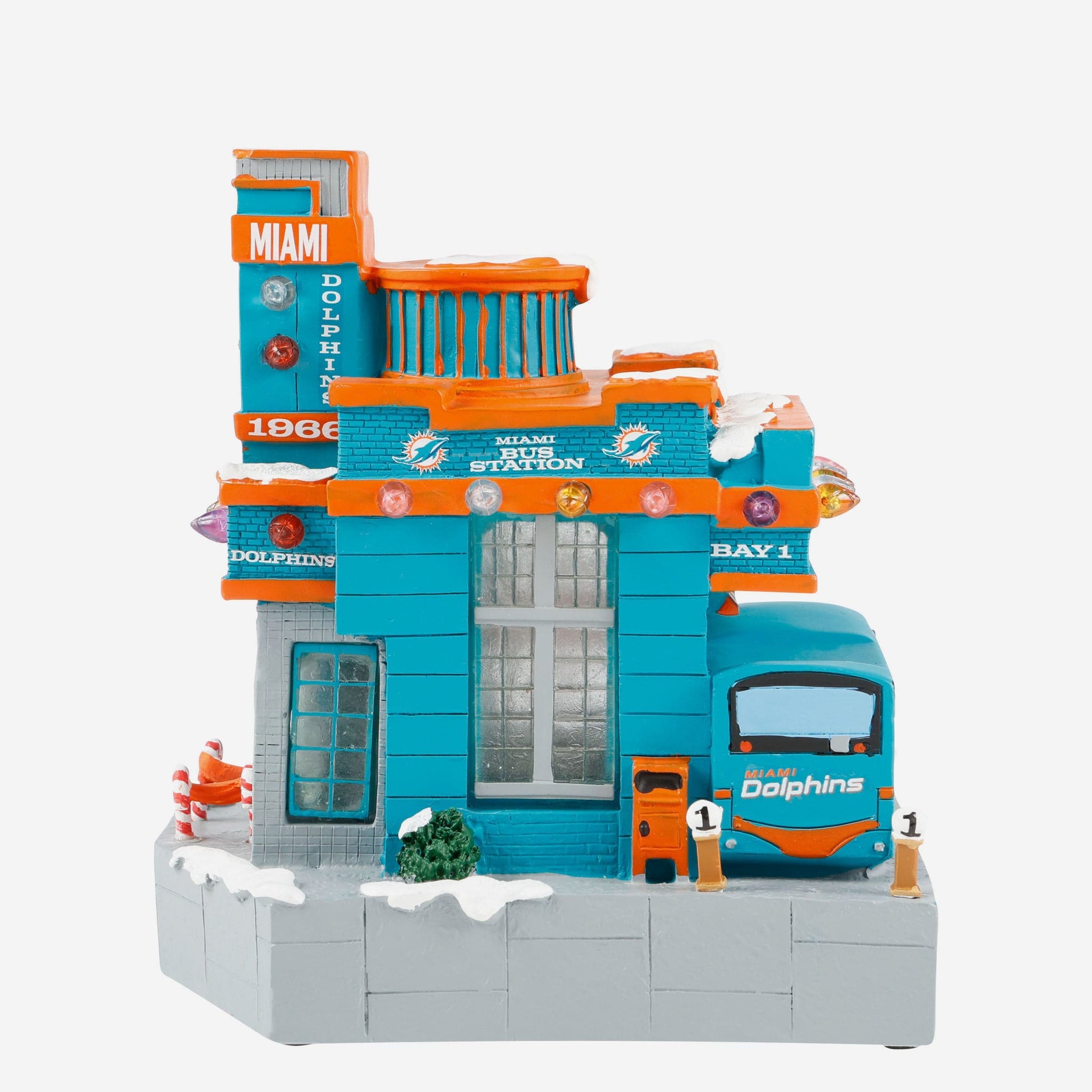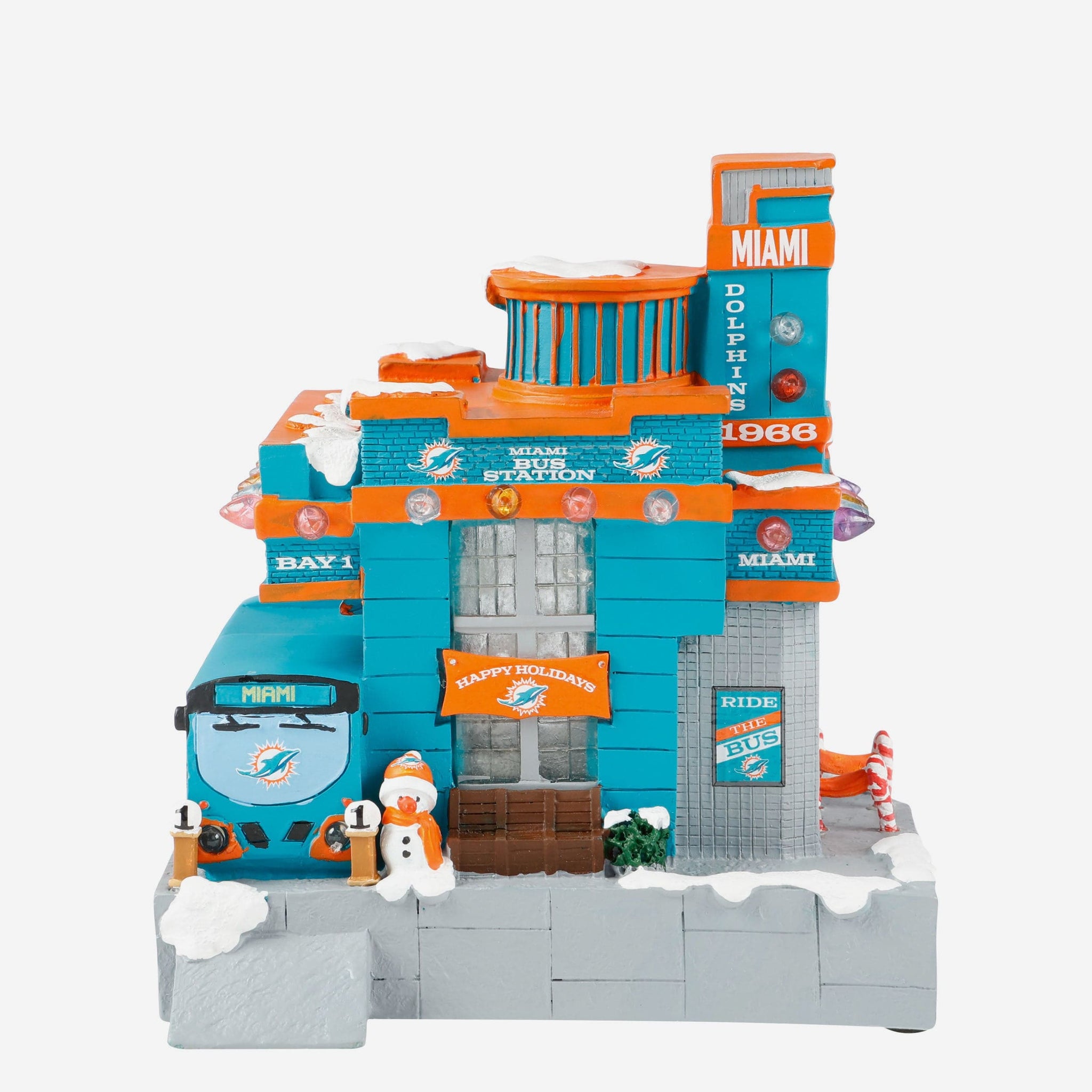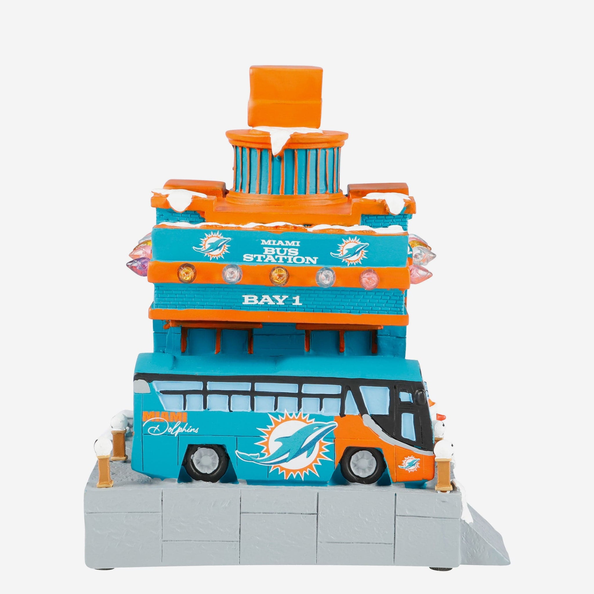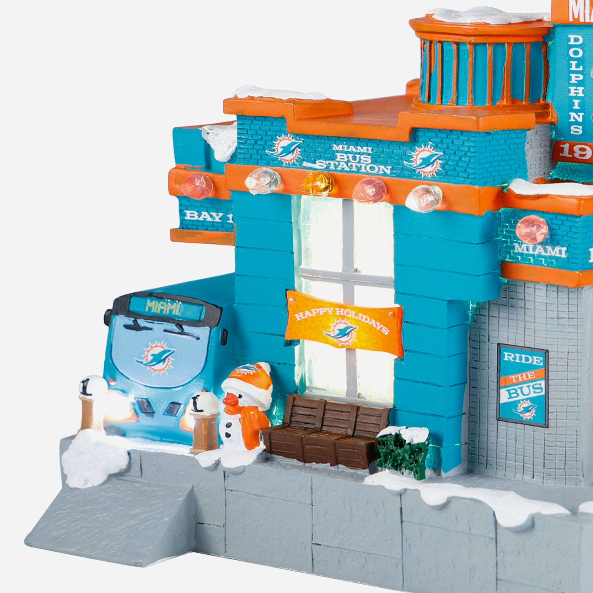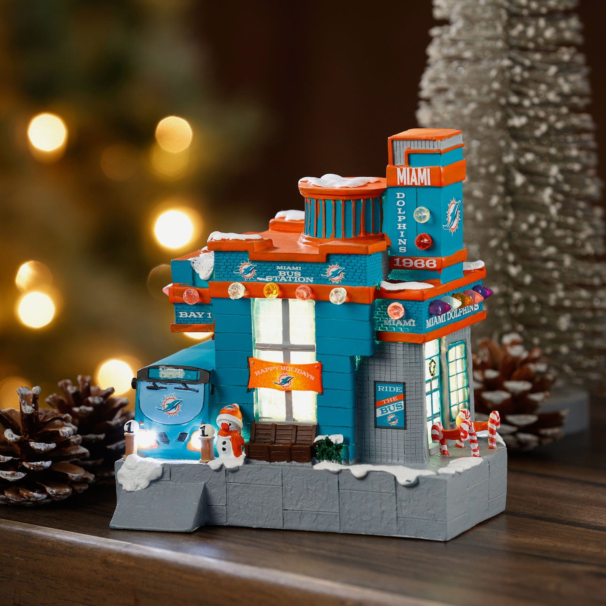 All aboard the holiday spirit! Illuminate your festive village with the Miami Dolphins Light Up Resin Team Bus Station.