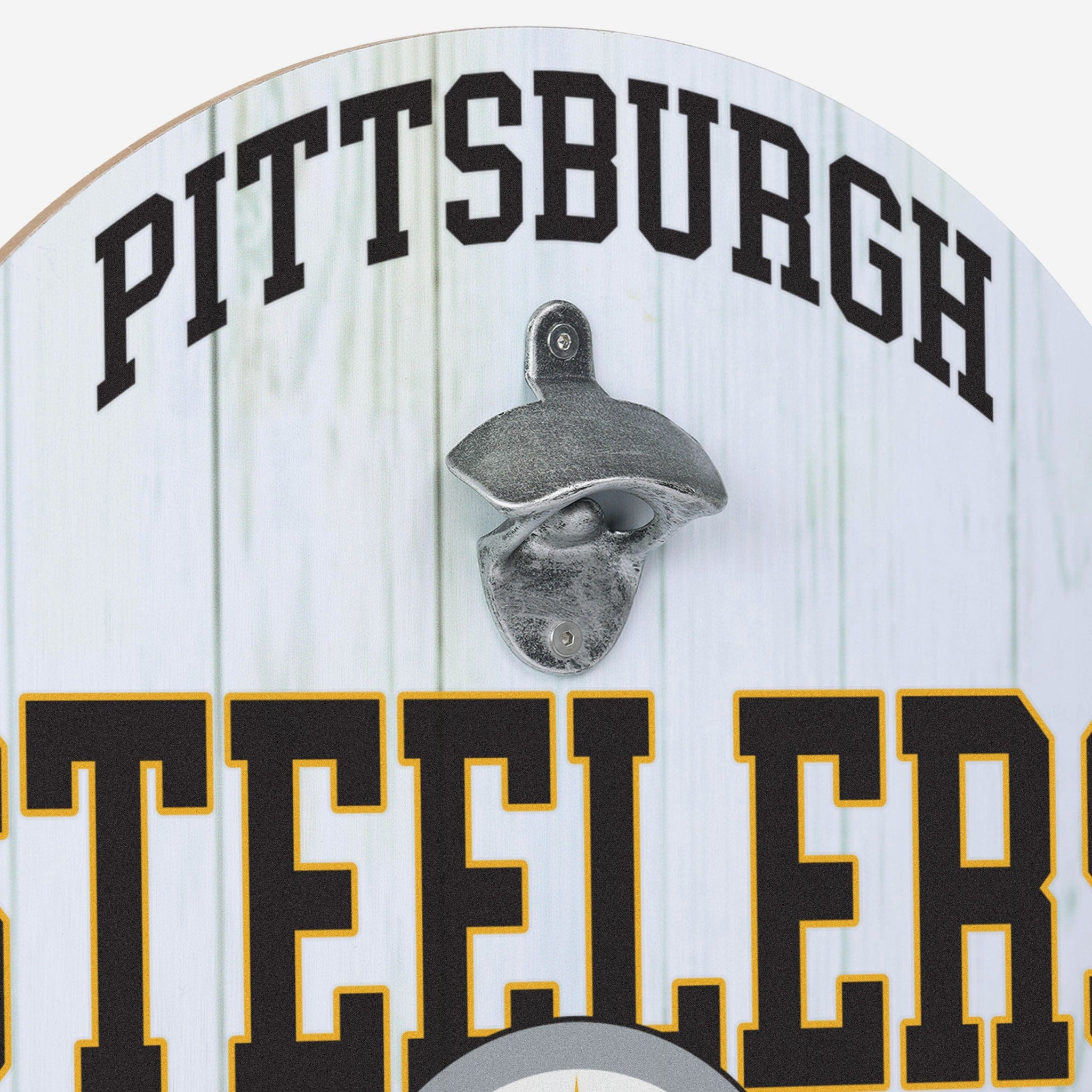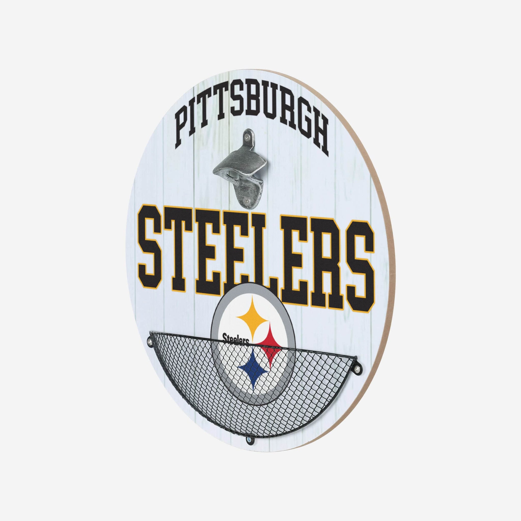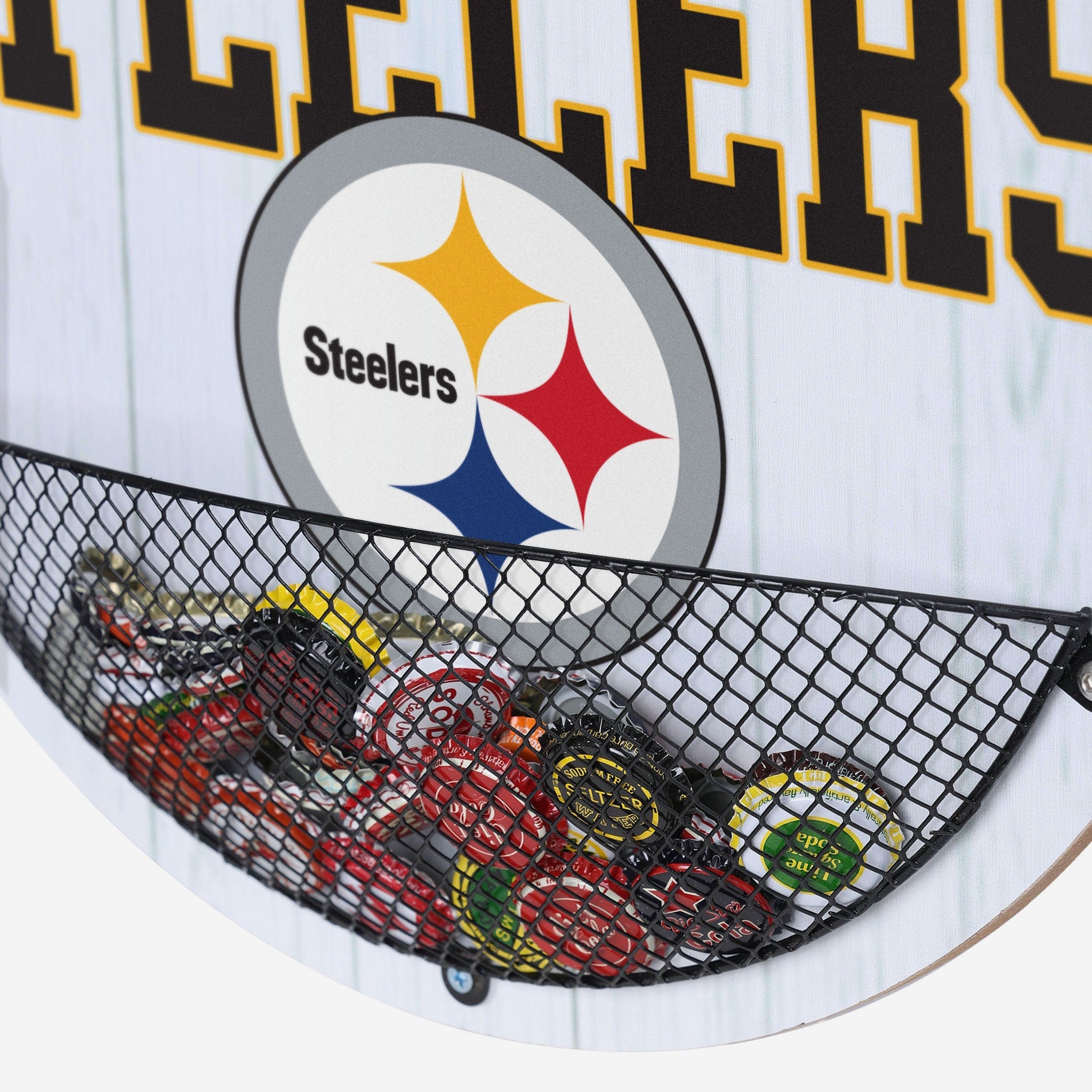 Pop the top and let the cap drop. Cleanup after gameday in the fancave is easy when you've got this Pittsburgh Steelers Bottle Opener Cap Catcher Wall Sign.
