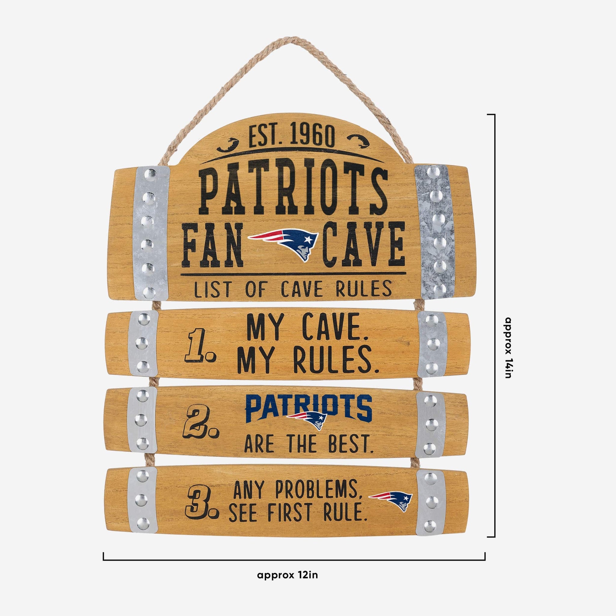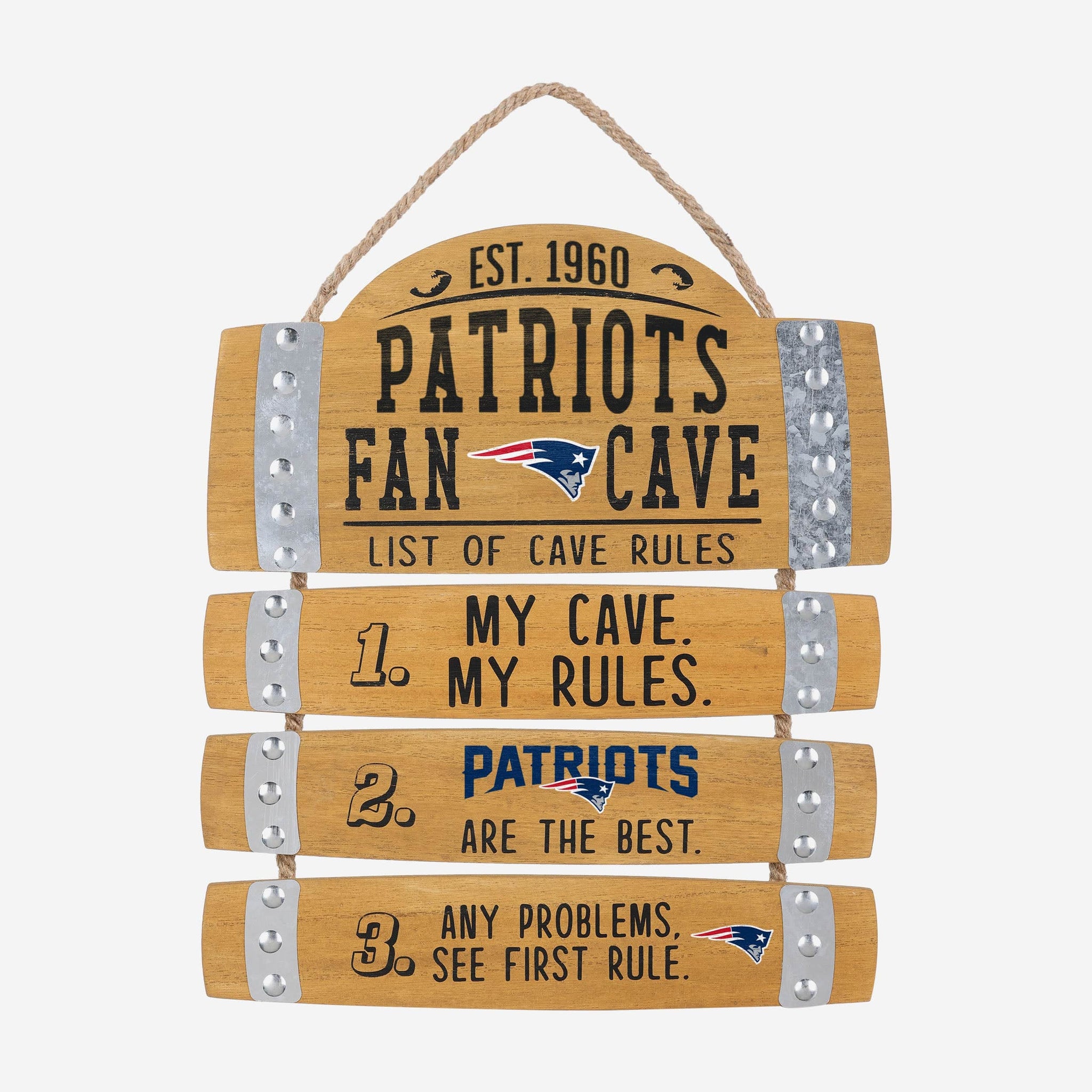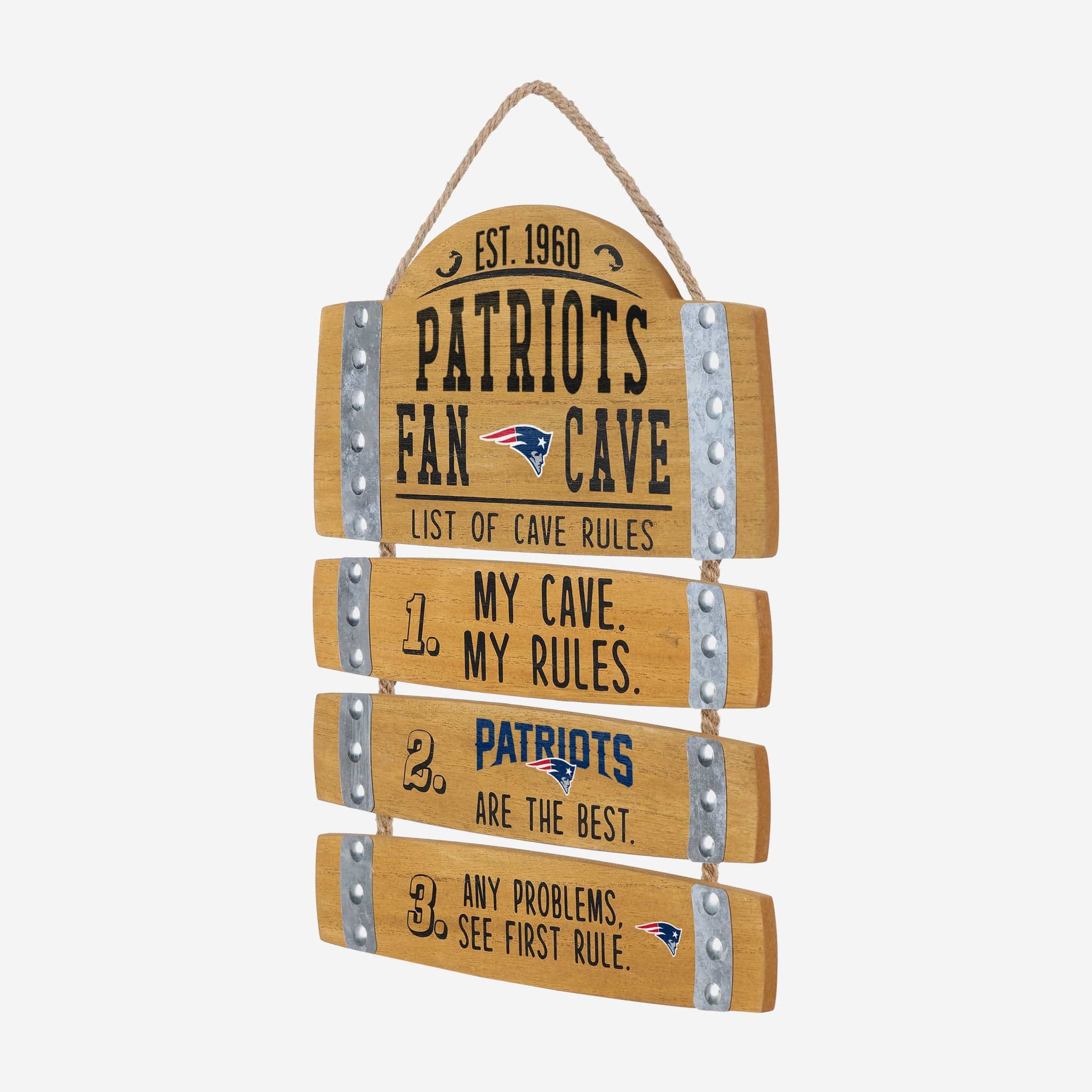 No need to scrape the bottom of the barrel for some sweet fancave gear. All you need to do is check out this New England Patriots Barrel Slat Mancave Sign.
