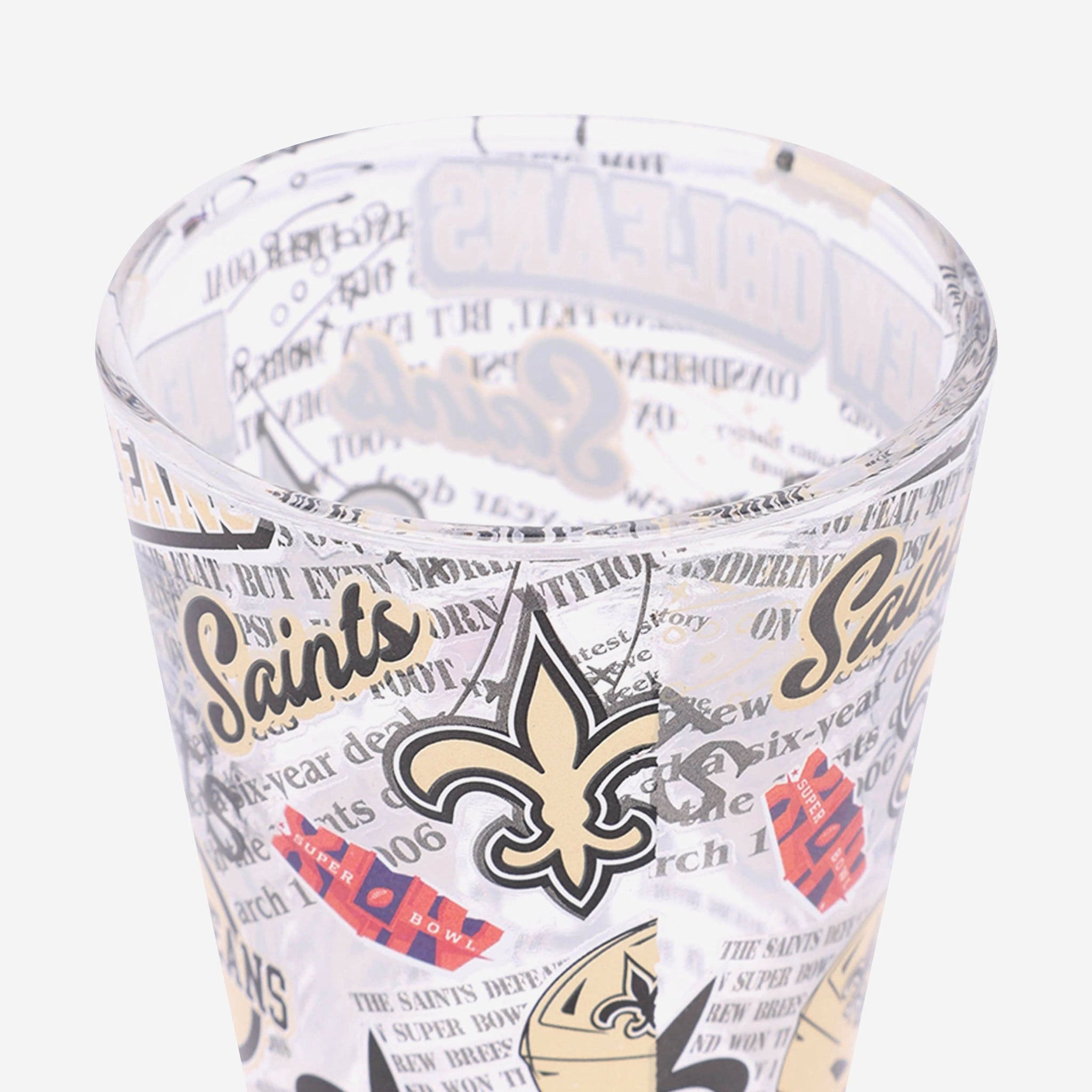 • Third glass features all-over repeat design with team logo displays and thematic team-specific elements throughout that will really get the party started