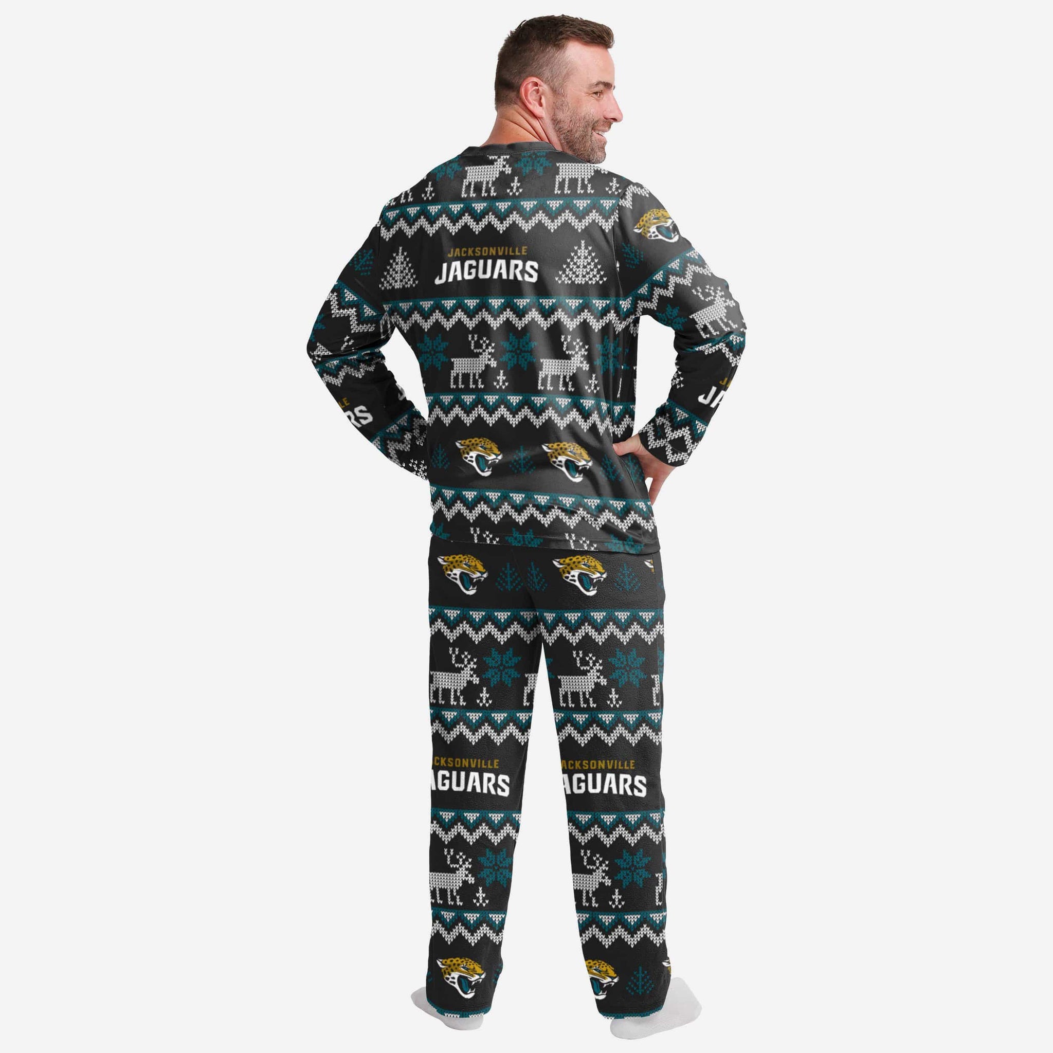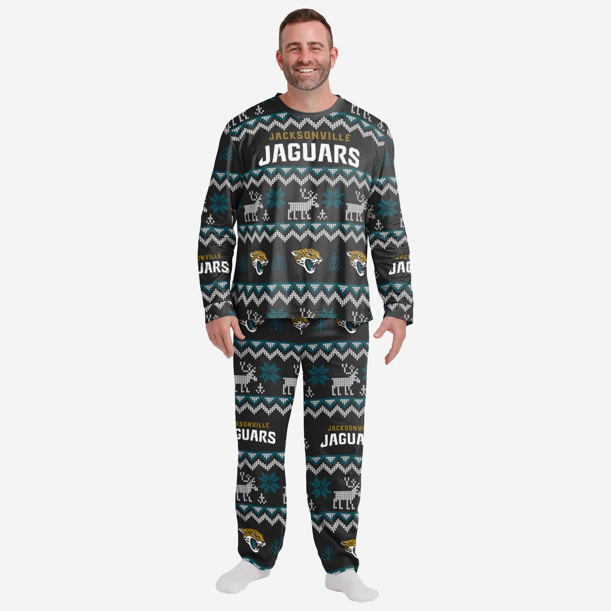 Get some matching family pajamas and dress to impress this holiday season! You won't want to miss these men's team pajamas! These men's PJ's are comfortable and show off your team spirit in the form of some sweet men's jammies. Introducing the Jacksonville Jaguars Ugly Pattern Family Holiday Pajamas! Don't forget to take your holiday photo with the whole family wearing matching Christmas pajamas!