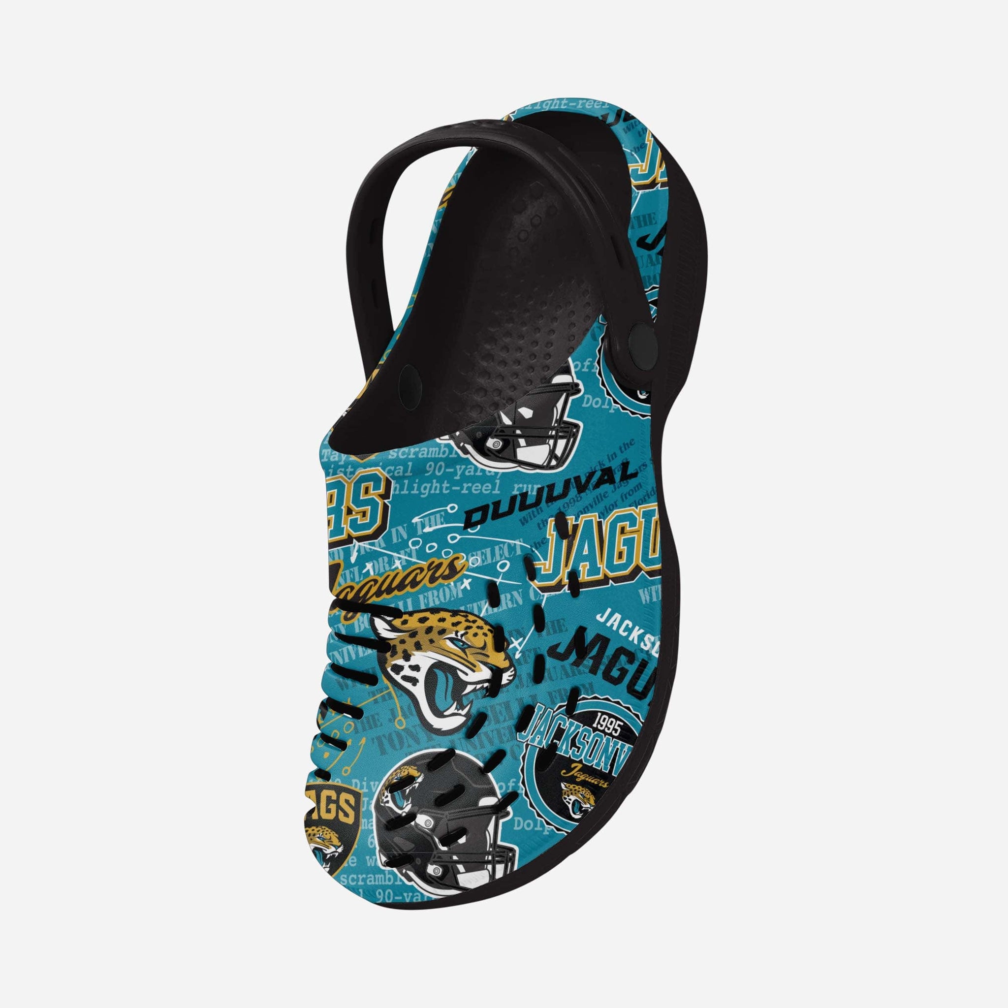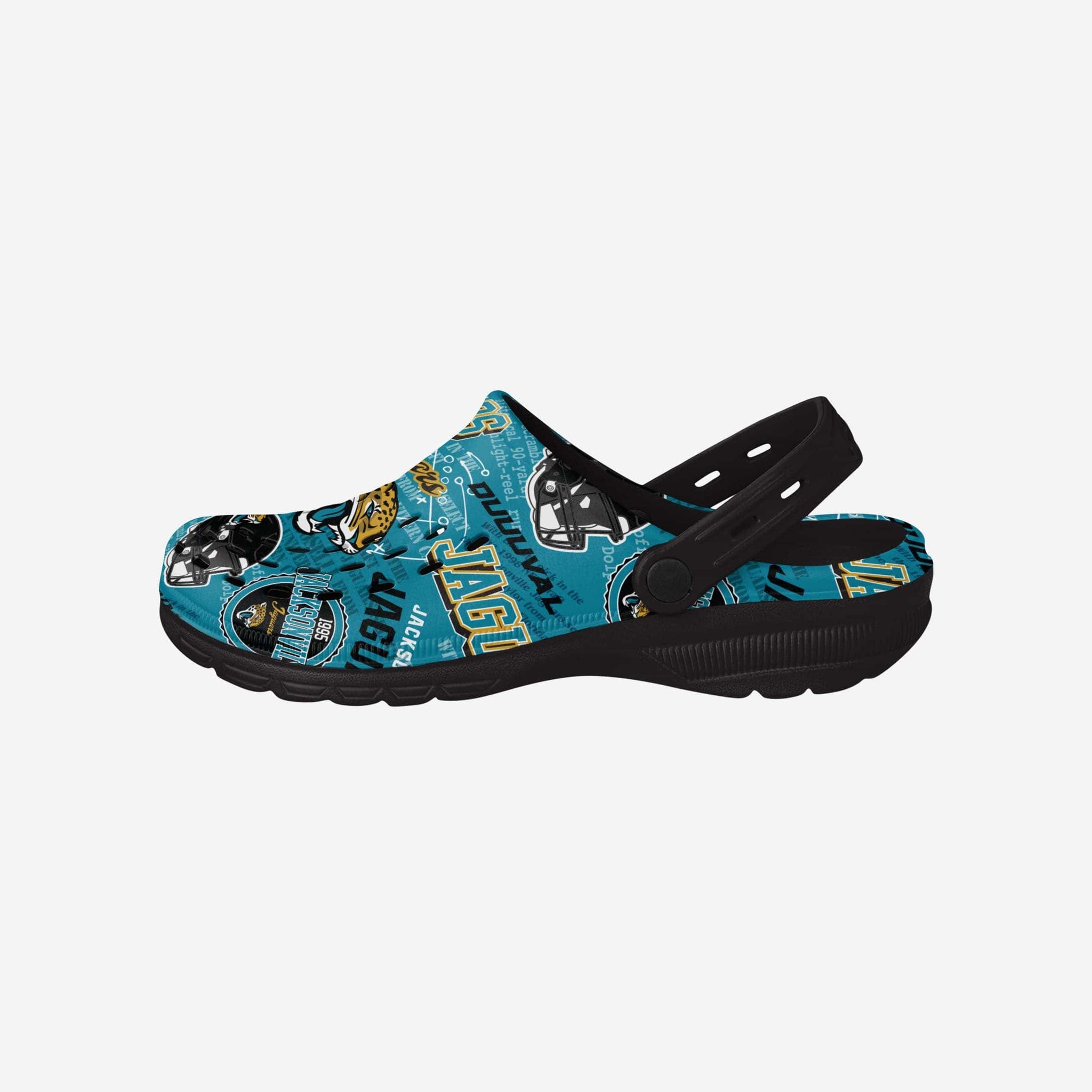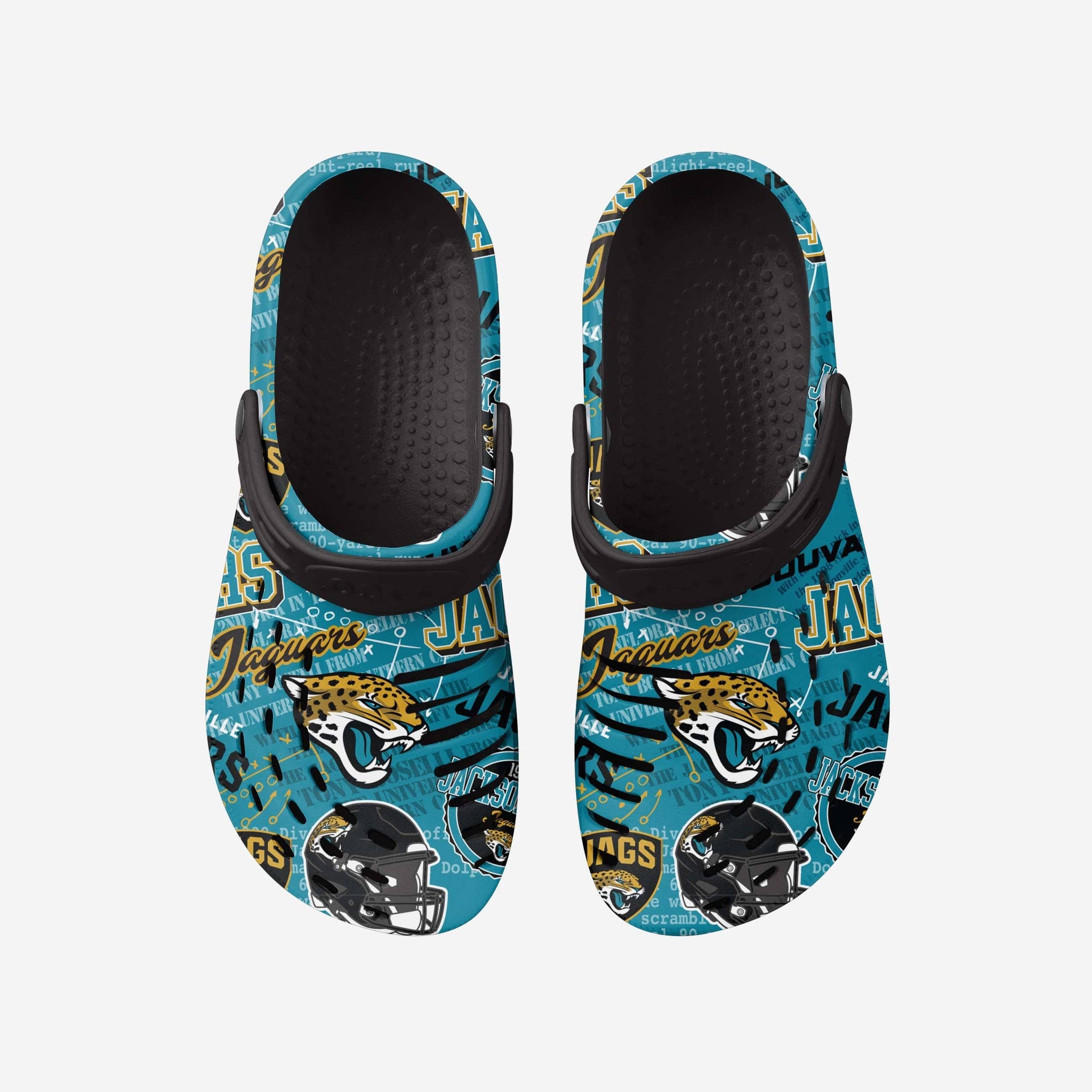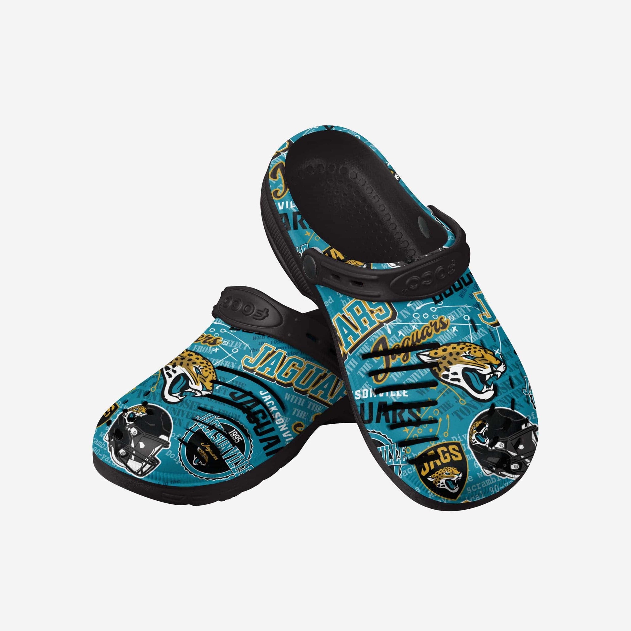 The Jacksonville Jaguars Historic Print Clogs with Straps are here to help you take a step into the time machine and celebrate your franchise's glorious history.
