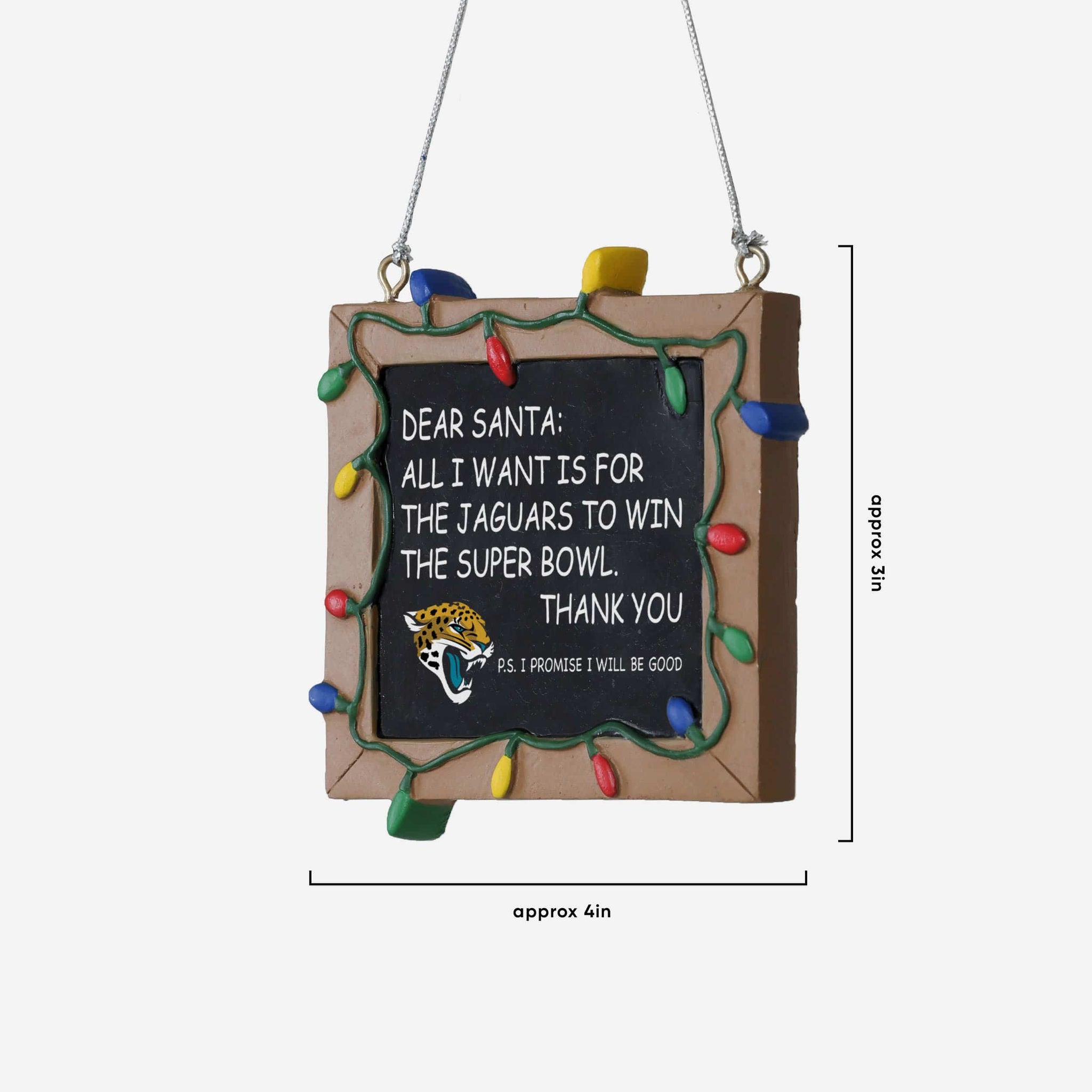 So, you made your list and sent it to jolly ol' Fanta Claus, asking him for a championship. But sometimes letters can get lost in the mail. Just in case, put this Jacksonville Jaguars Resin Chalkboard Sign Ornament on your tree to let him know how good you've been this year, and that all you want for the holidays is a trophy.