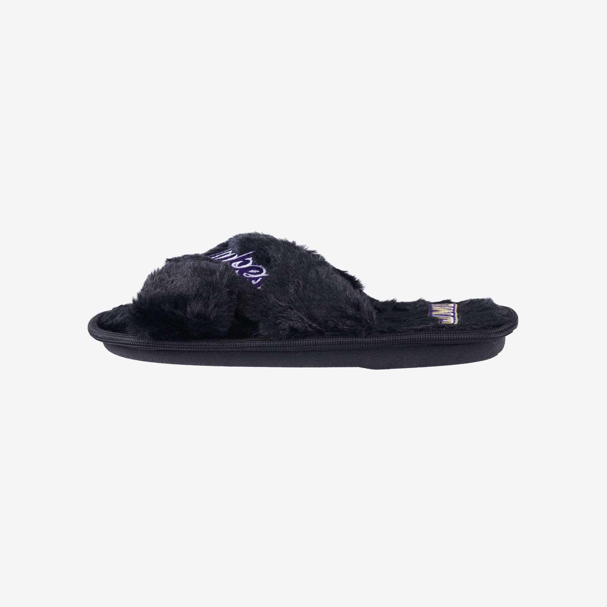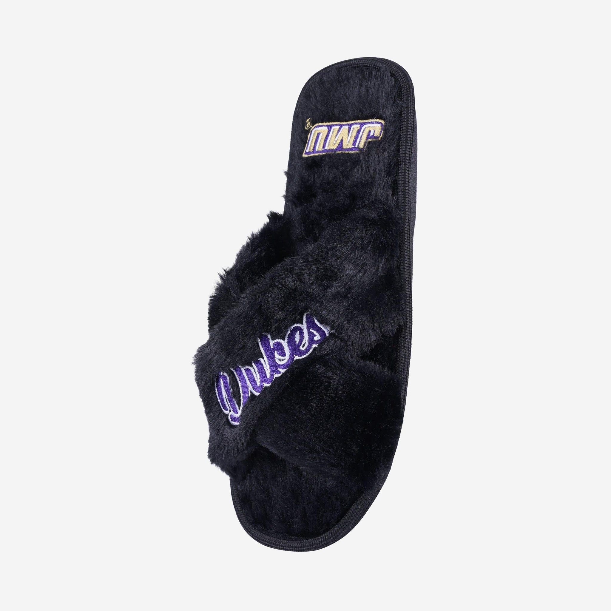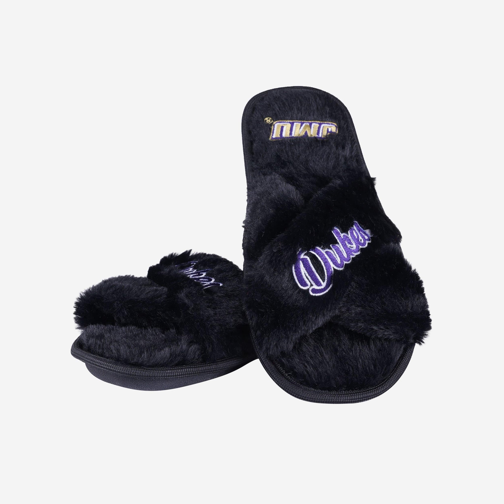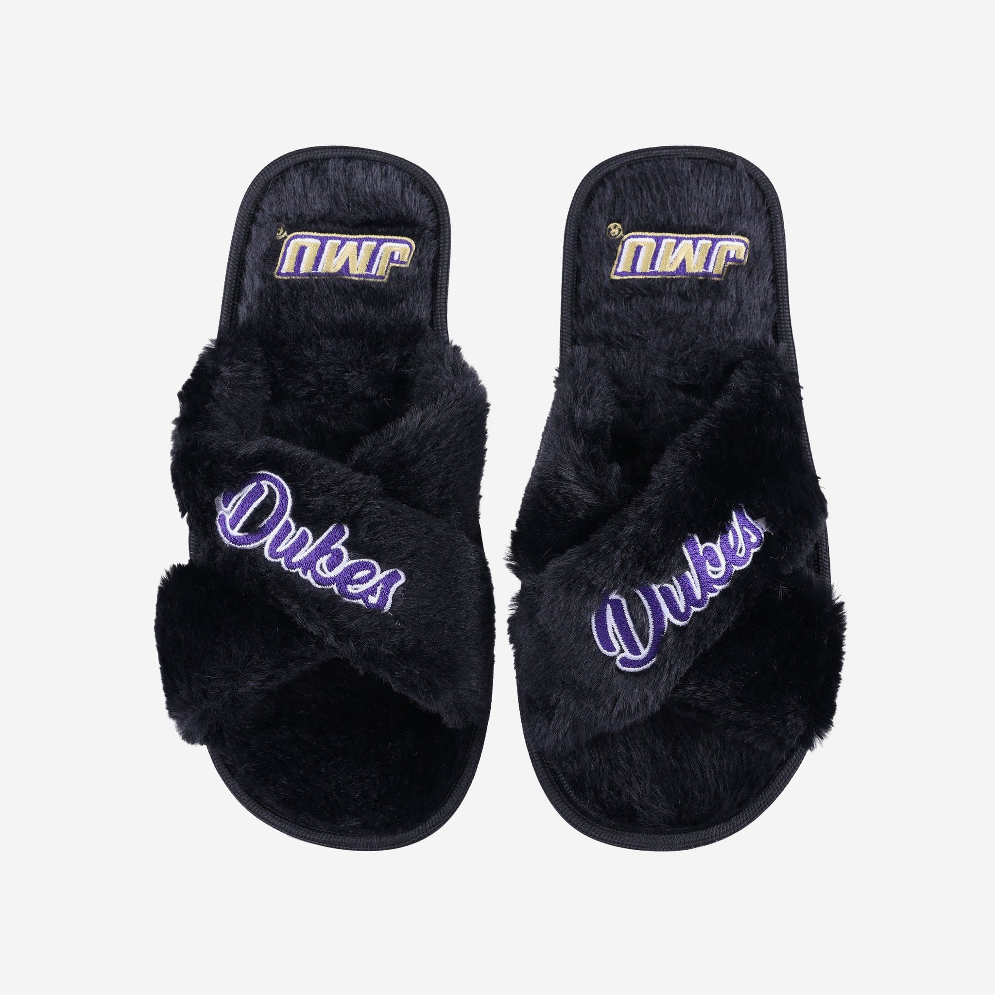 Slip in to something fuzzy, festive, and oh, so fan-tastic on your relaxing days at home. These James Madison Dukes Women's Script Wordmark Fur Cross Slides are the best way to rep the team while you kick back and watch the game on TV.