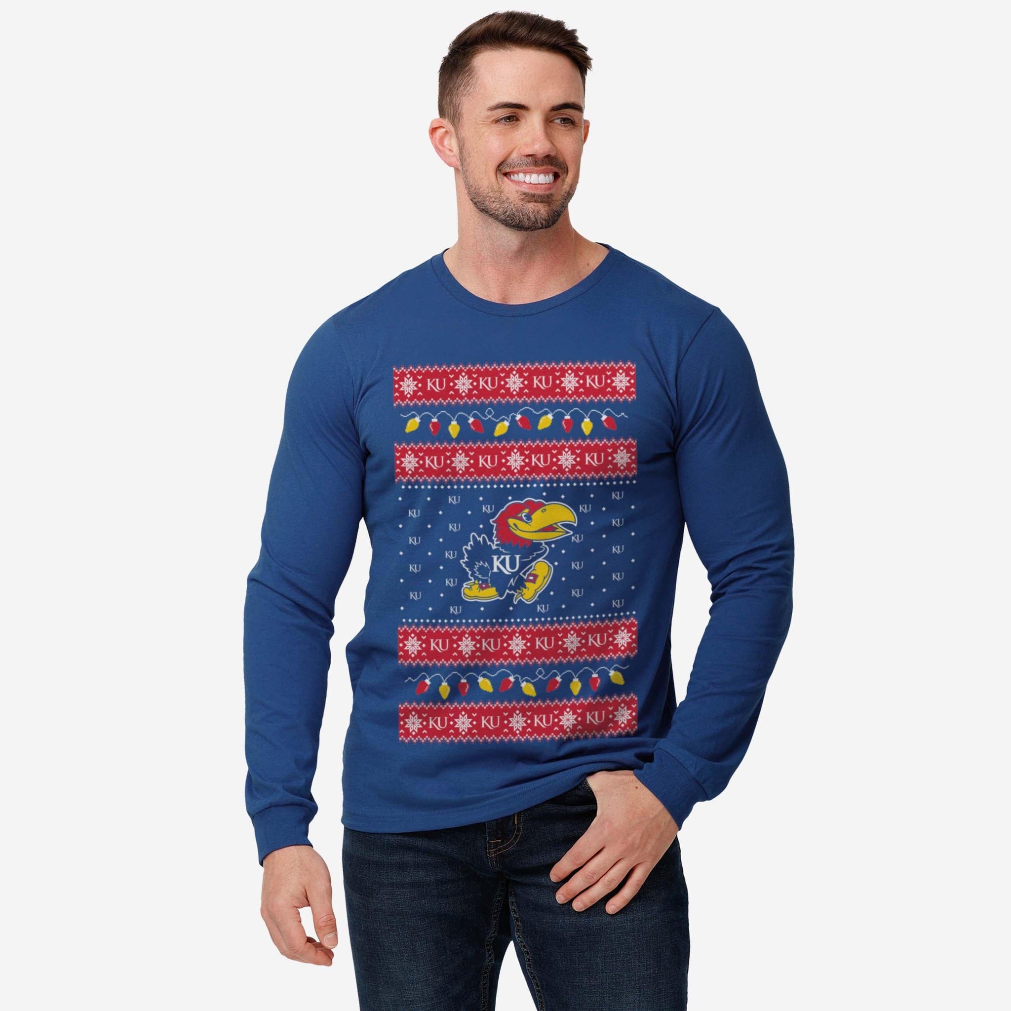 Santa's making a list, and he’s checking it twice! Prove that you’re the nicest fan around with the Kansas Jayhawks Holiday Lights Sweater Long Sleeve T-Shirt.