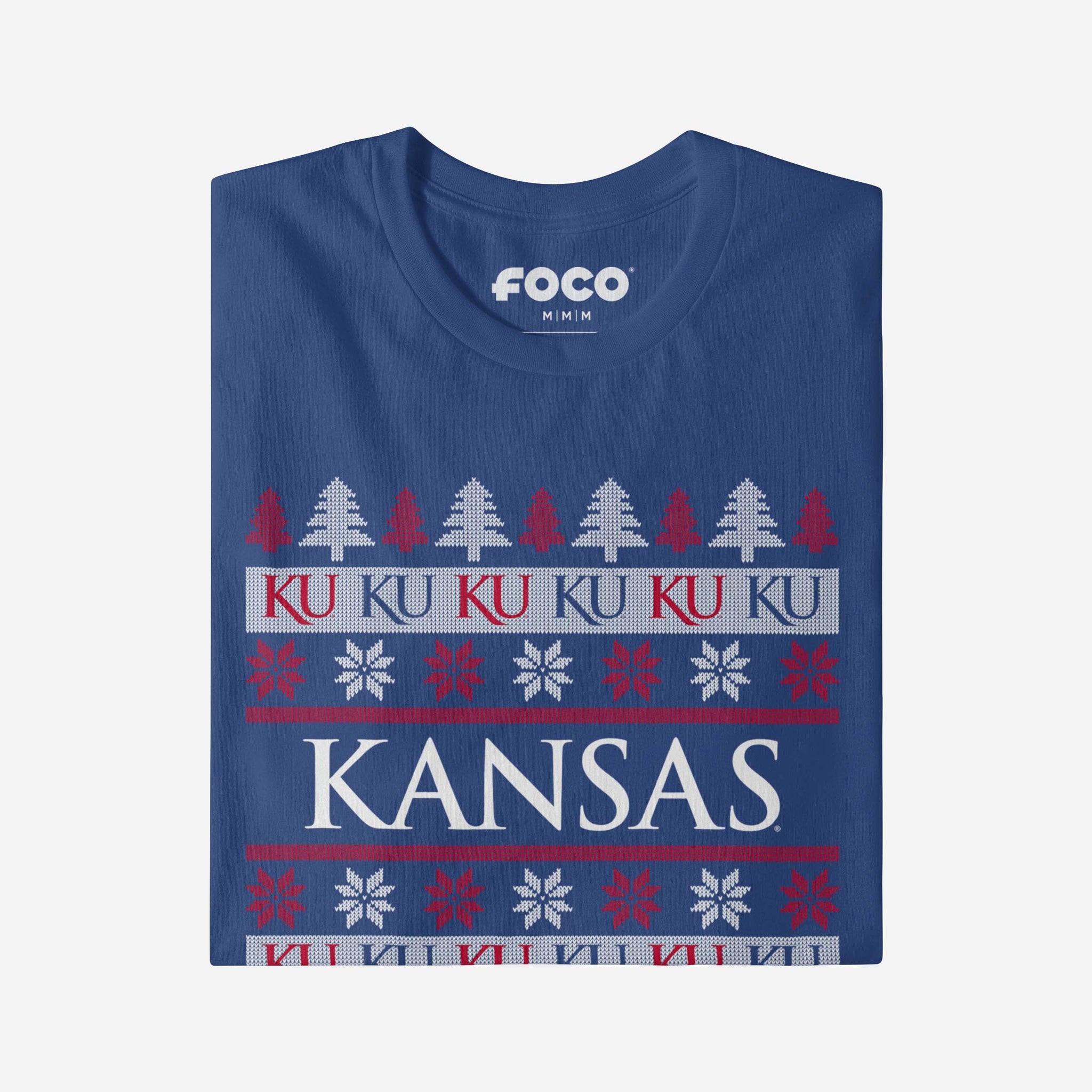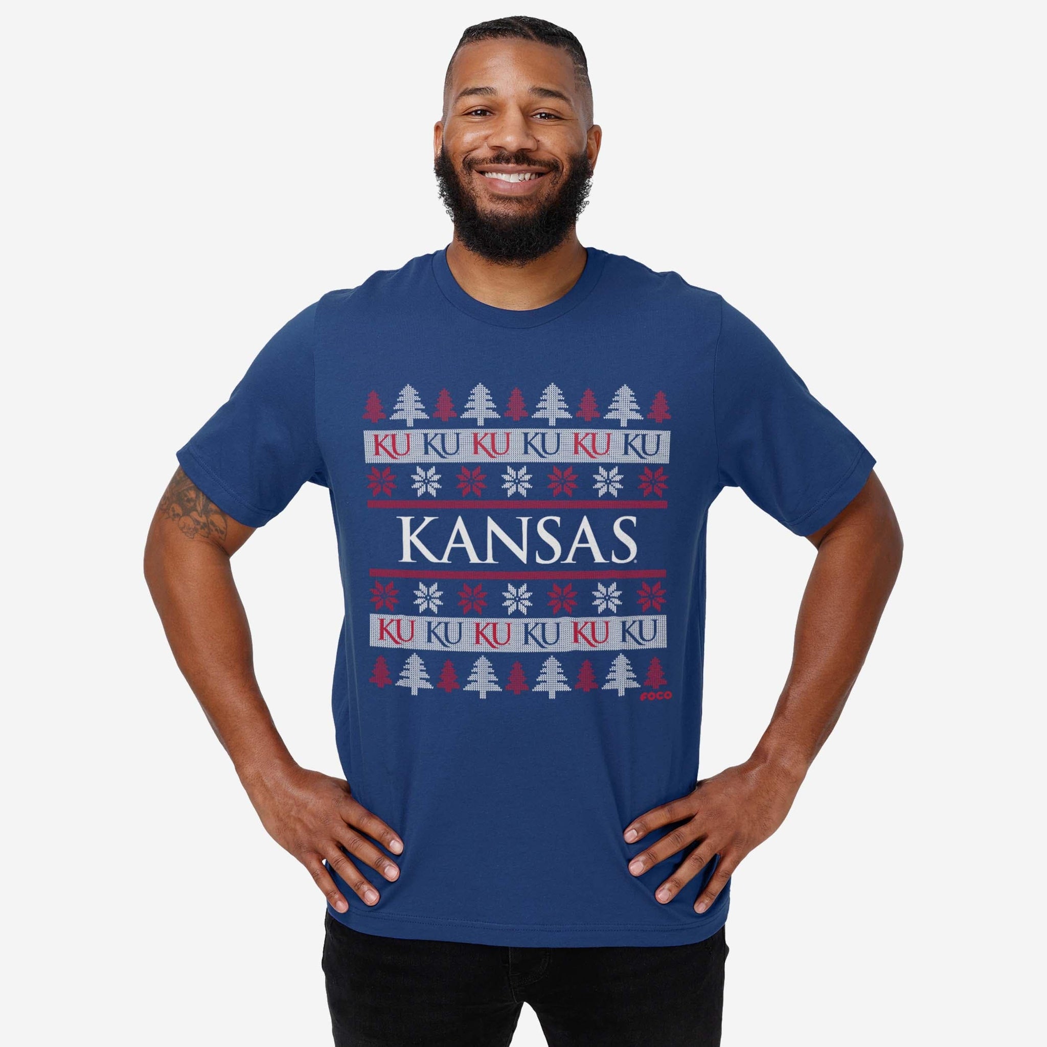 - Festive, team-colored design: This traditional t-shirt shows off the official Kansas Jayhawks colors in an all-over team-colored design with winter tree and snowflake accents, so you can show your team spirit with pride.