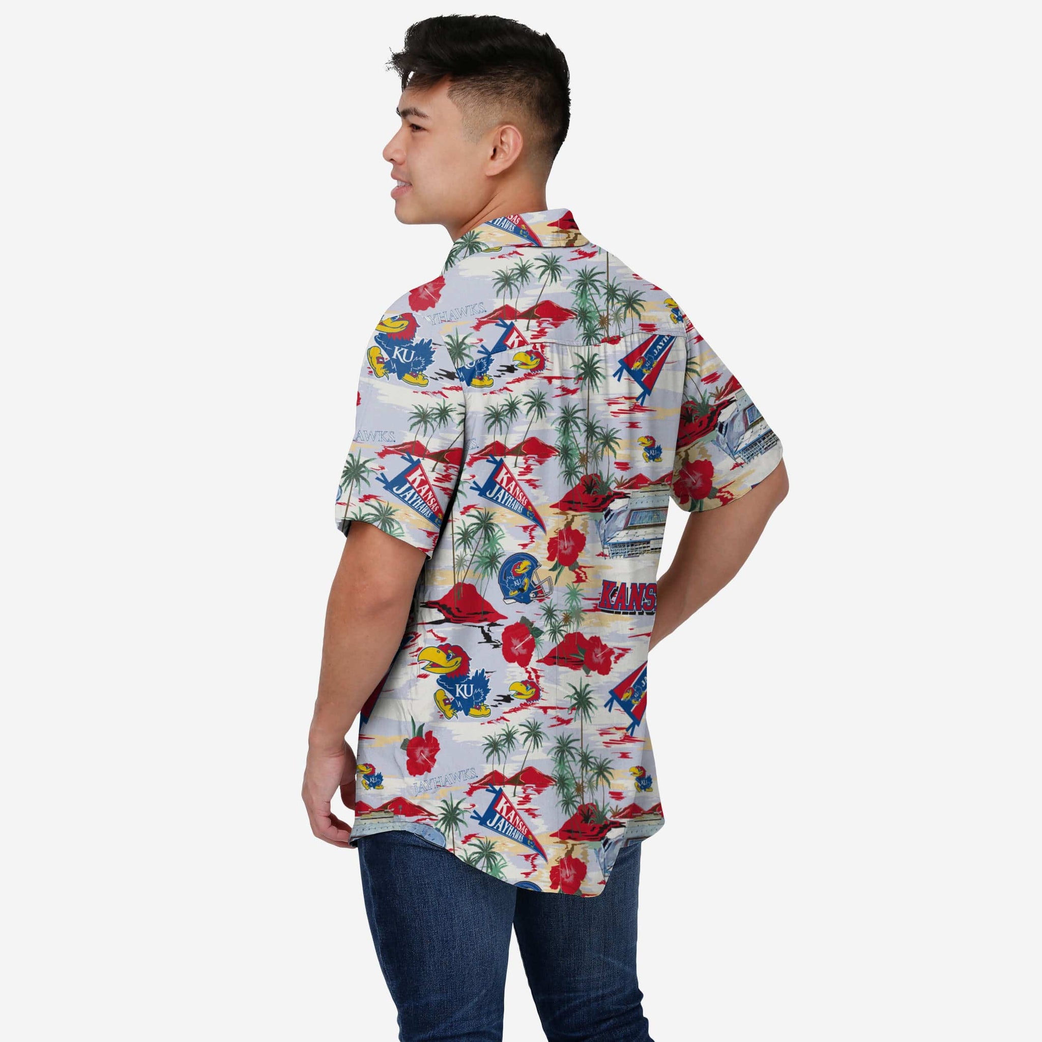 The game. The pool. The tailgate. The vacation spot. These are just a few places where you'll want to stylishly rep your team on the go in this Kansas Jayhawks Thematic Stadium Print Button Up Shirt!