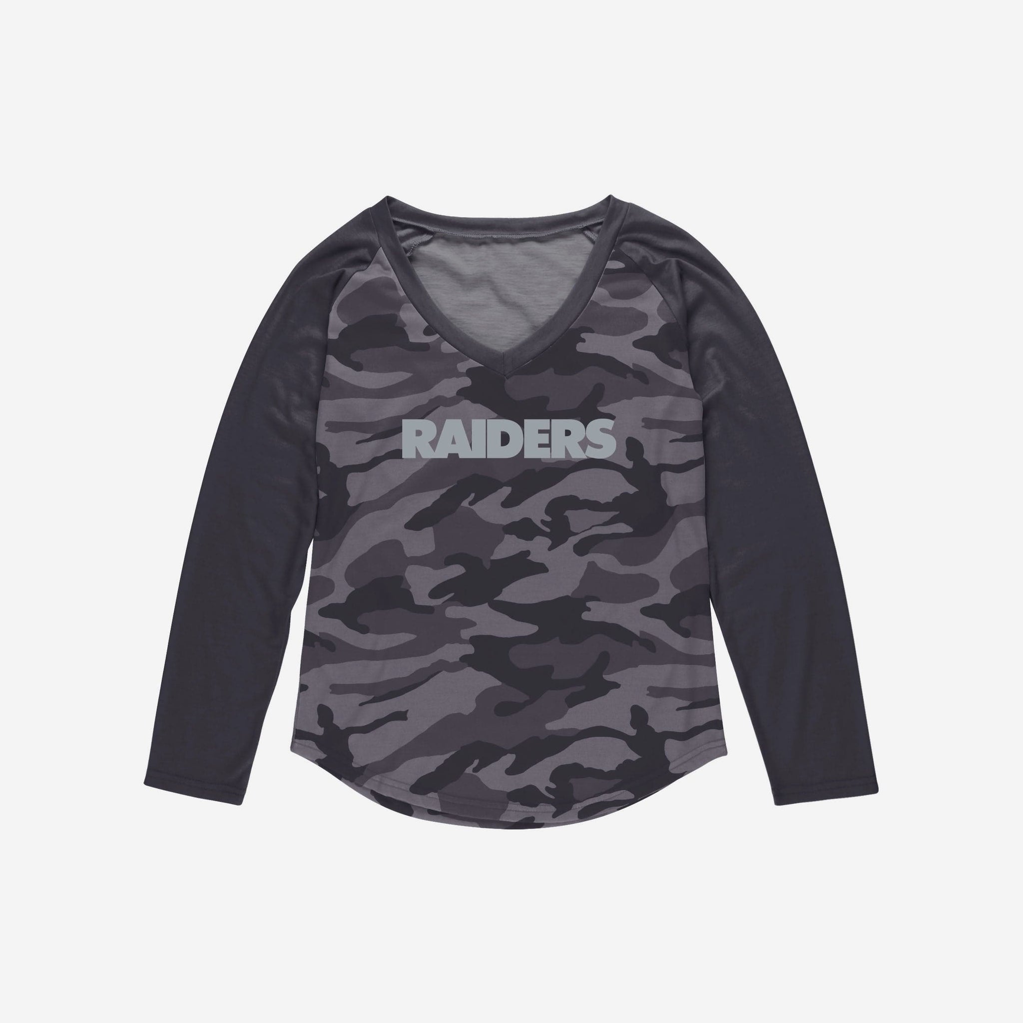 Despite its sleek camouflage design, when you're rocking this Las Vegas Raiders Women's Wordmark Tonal Camo Raglan T-Shirt, you won't blend in with the crowd - You'll stand out.