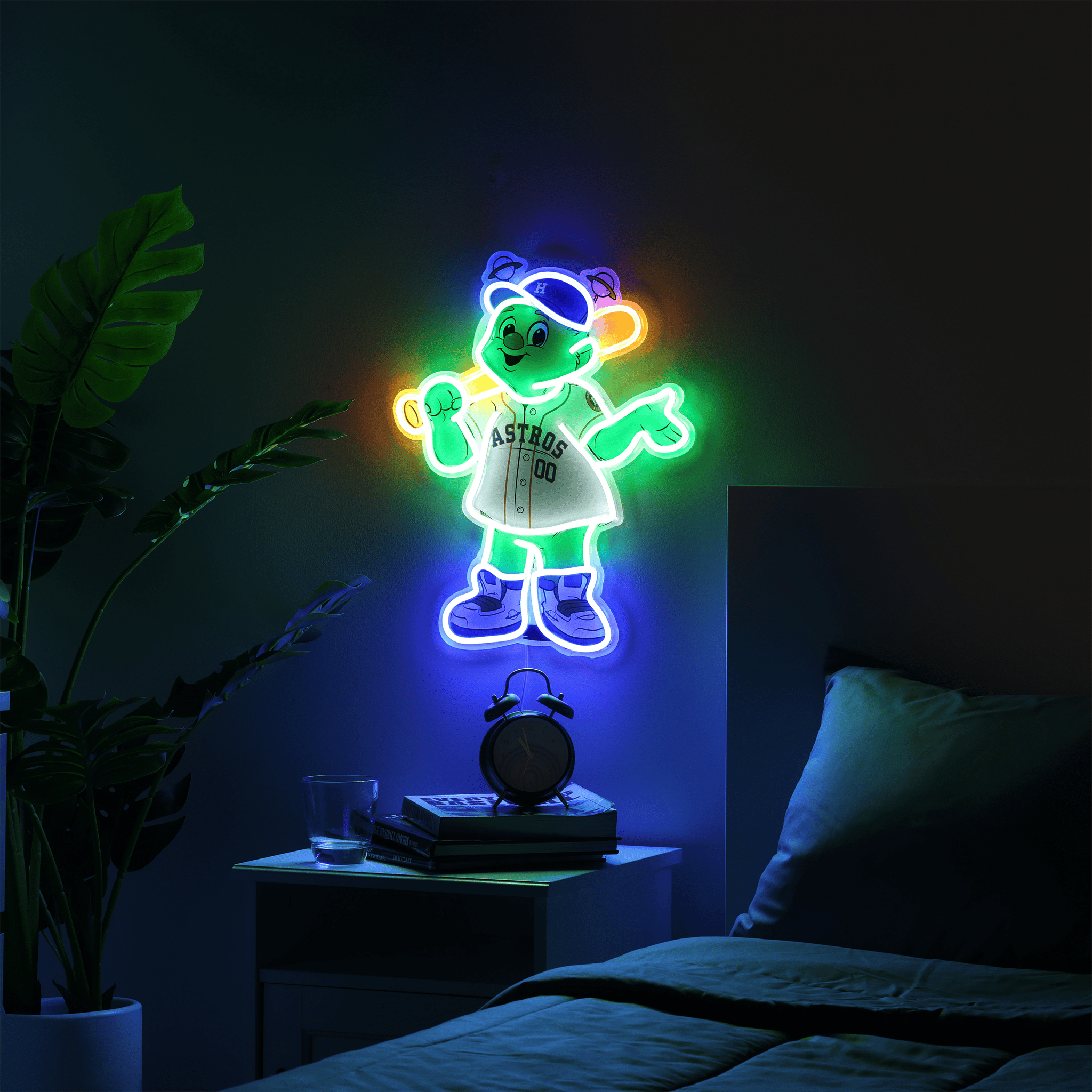 Your team mascot brings the energy to the stadium. Now, you can let them bring some glow to your gamedays with this Orbit Houston Astros Neon Light Up Mascot Sign.
