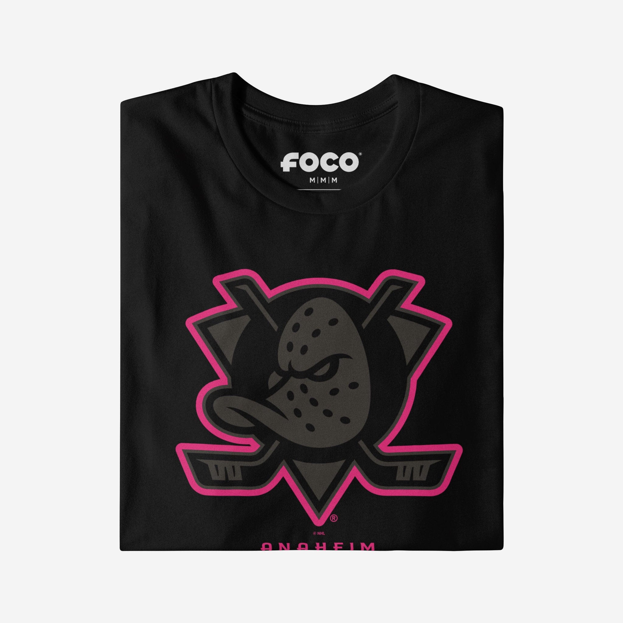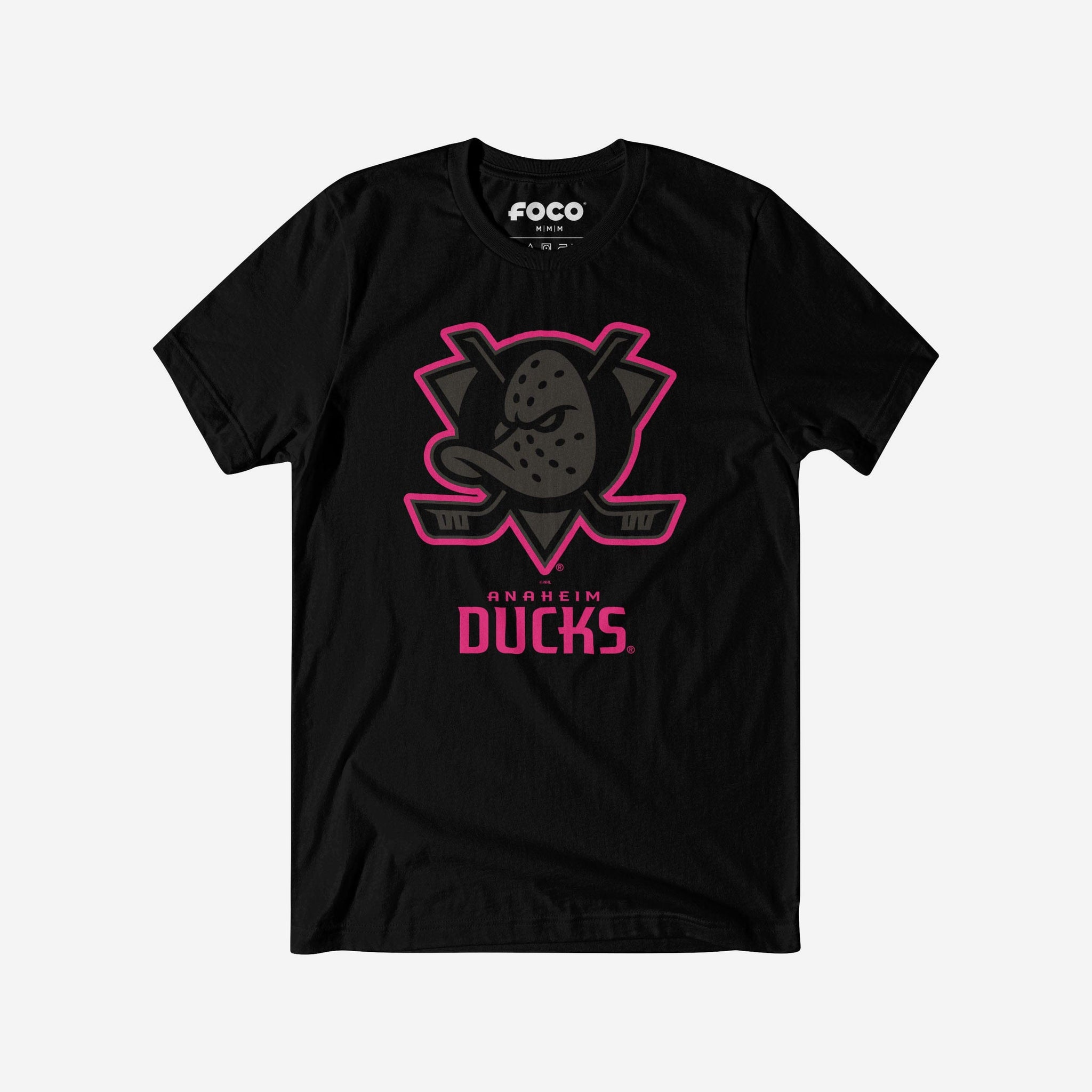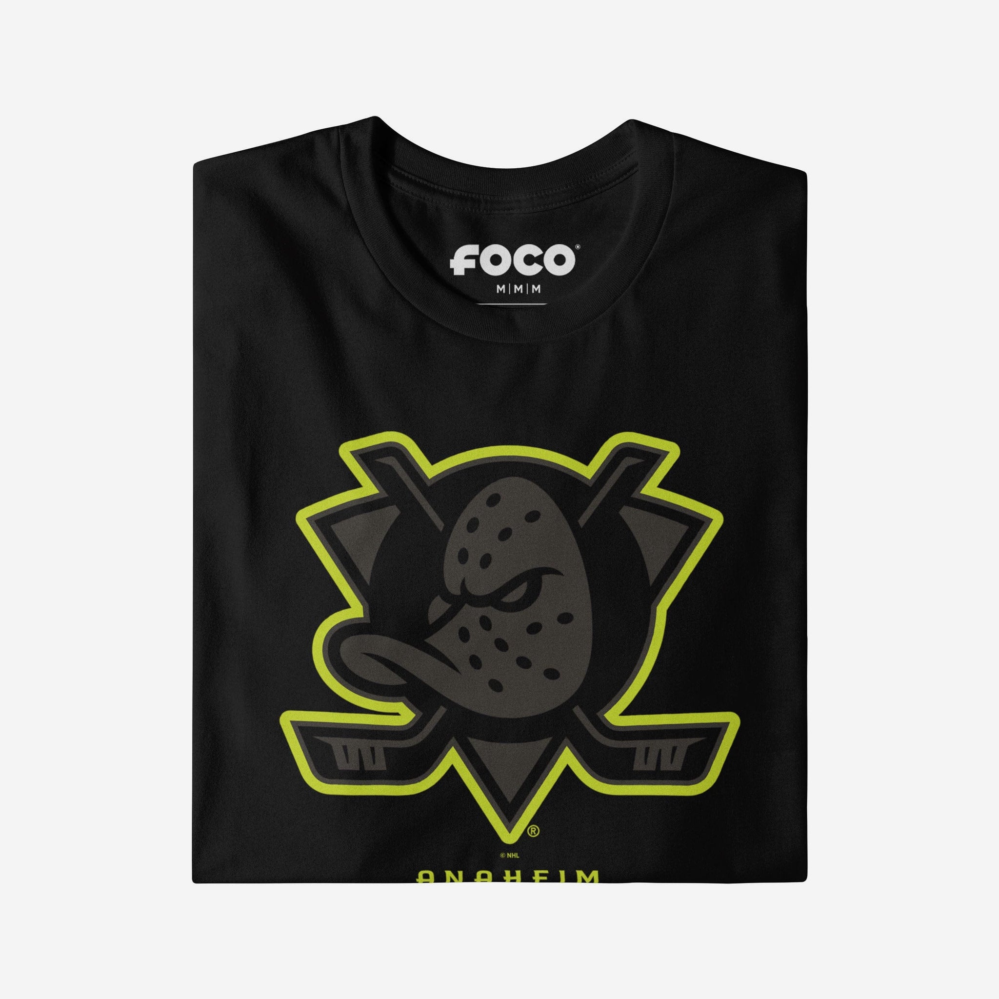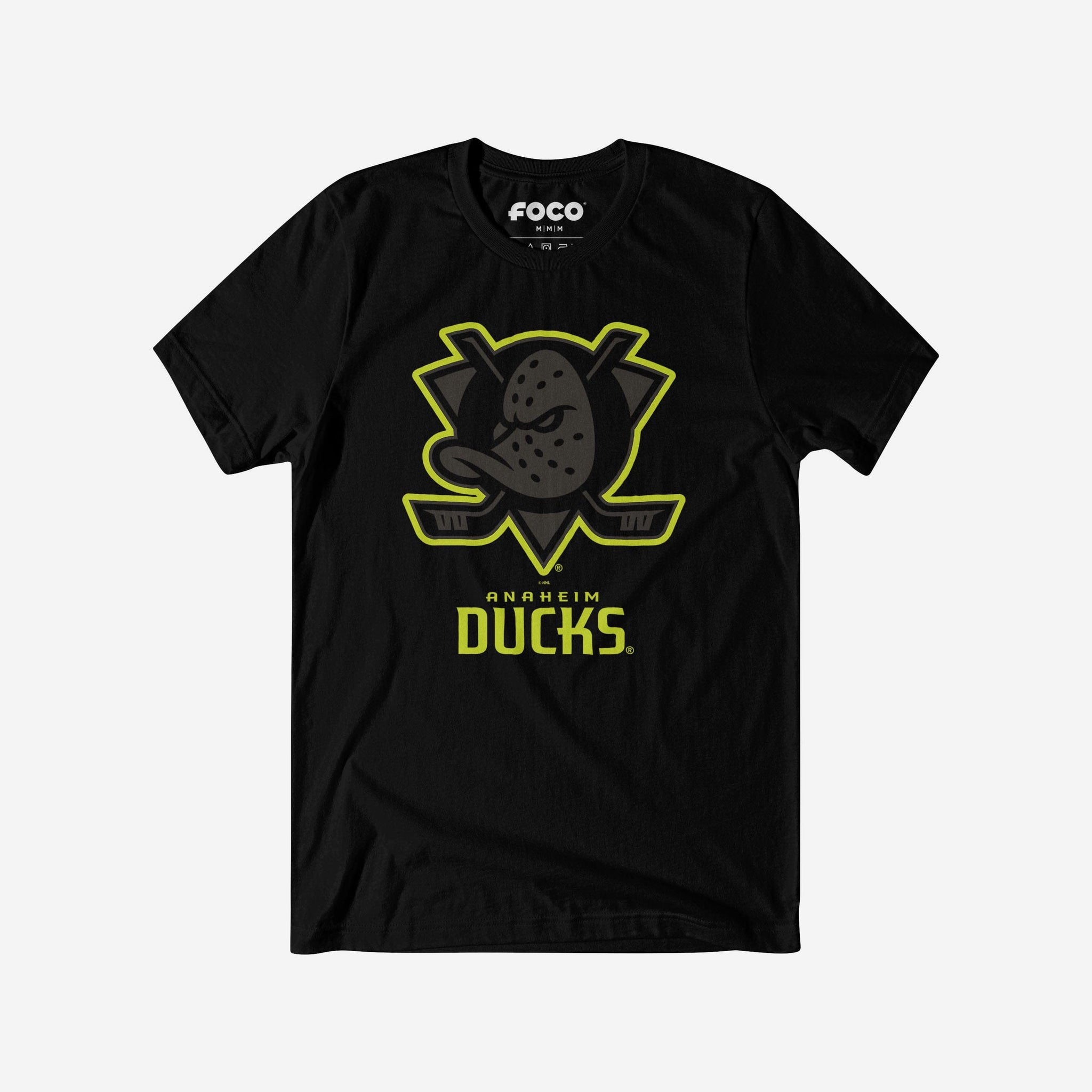 - Team logo display with highlight outline: The front of this apparel features a black Anaheim Ducks team logo display outlined in neon, and a neon wordmark team name display