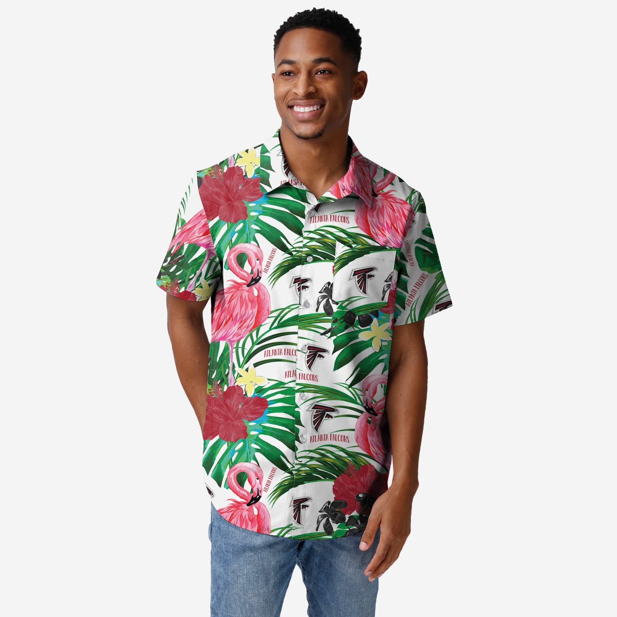 Aloha, party people! No need to set your watch - You're always on island time when you're rocking this Atlanta Falcons Flamingo Button Up Shirt.