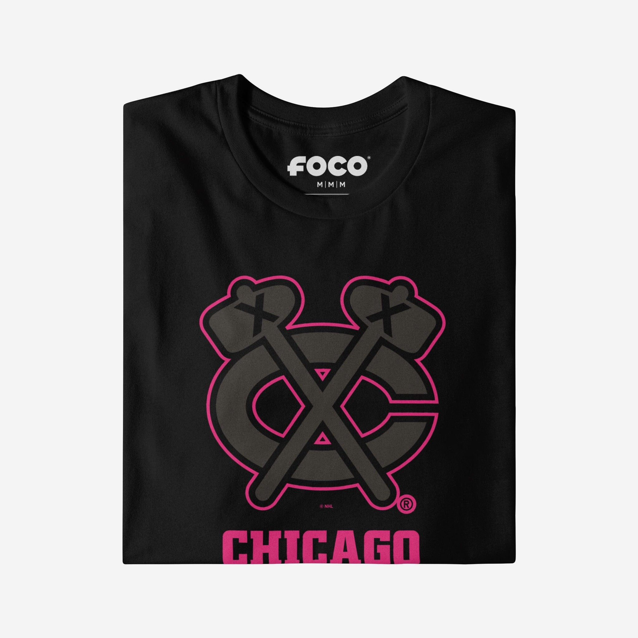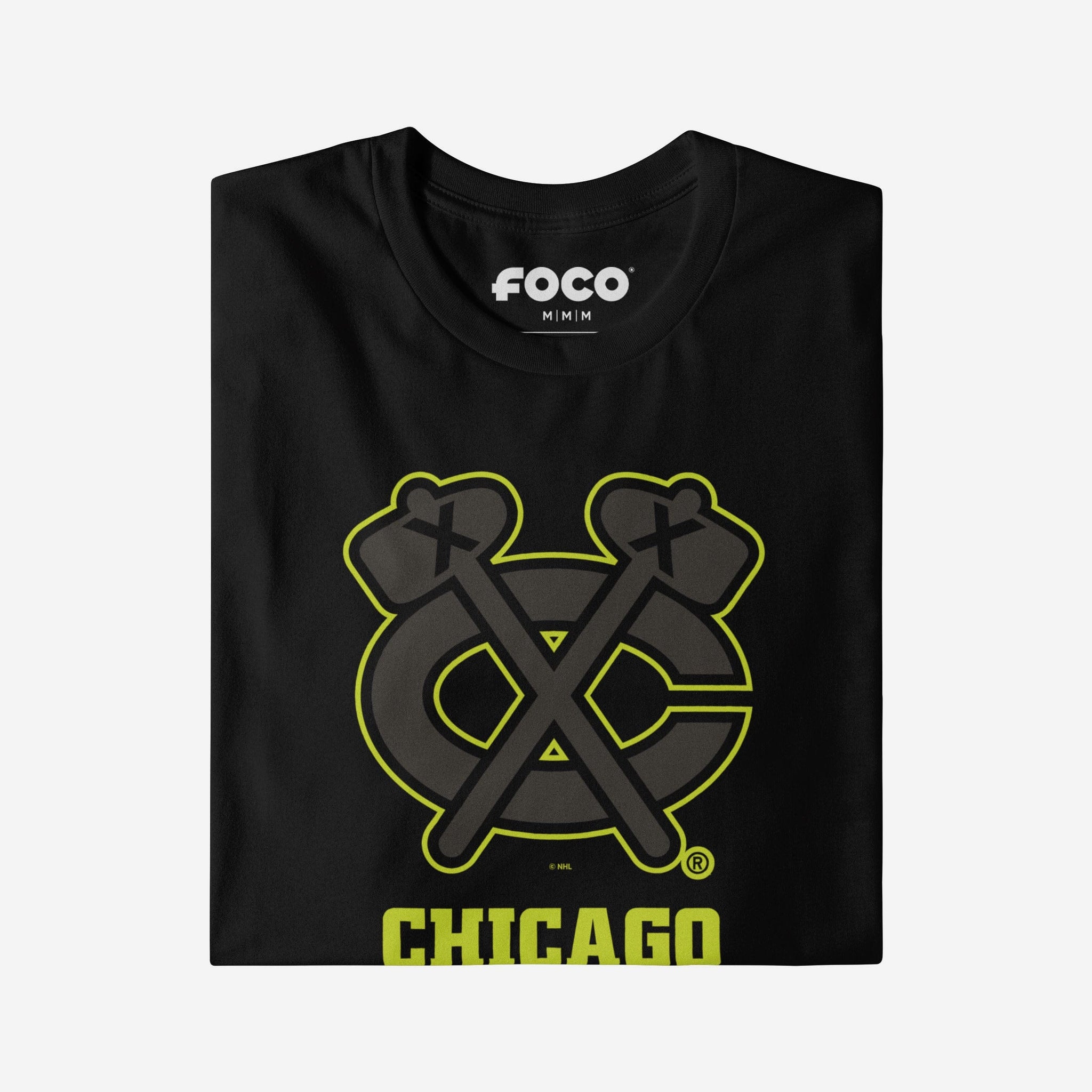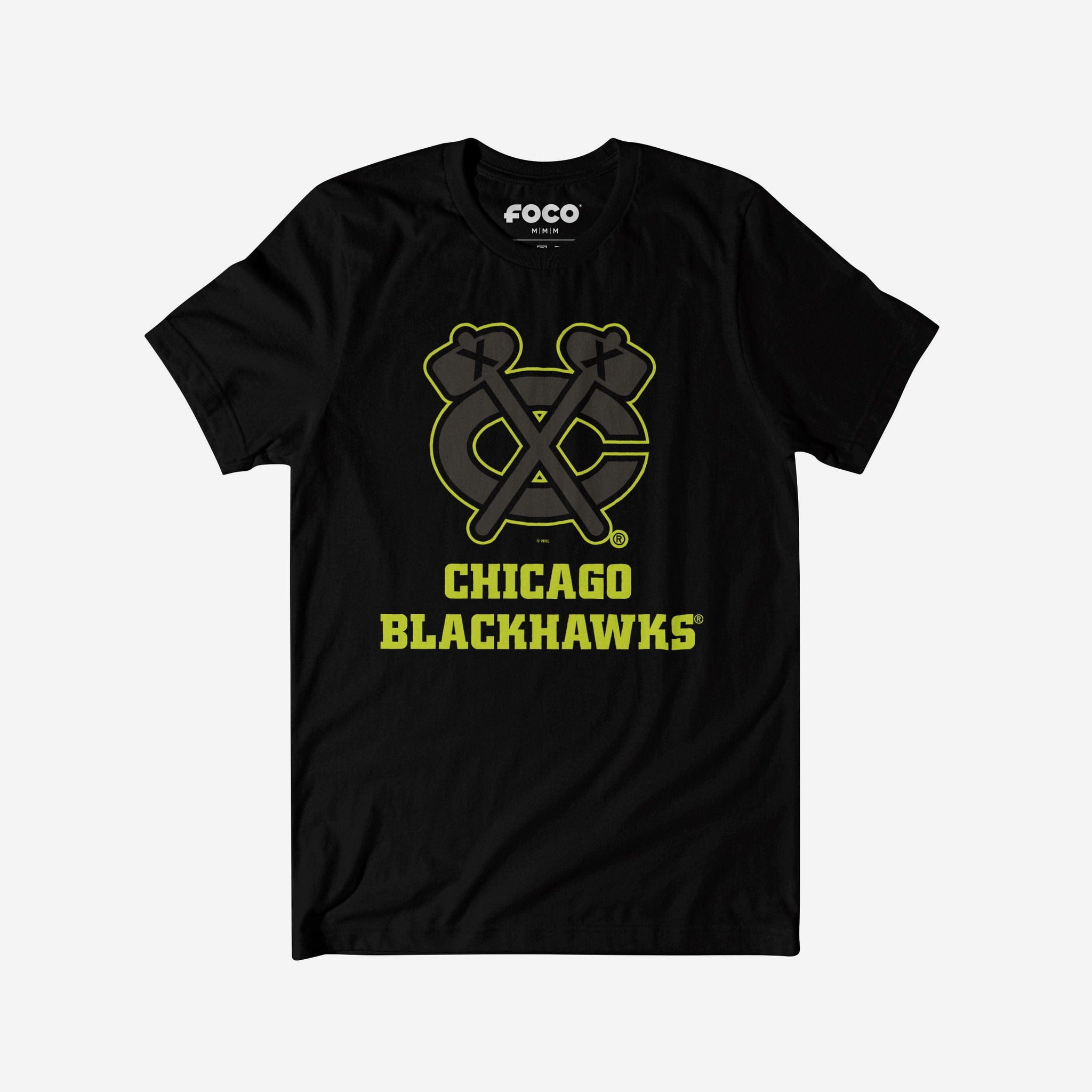 - Team logo display with highlight outline: The front of this apparel features a black Chicago Blackhawks team logo display outlined in neon, and a neon wordmark team name display