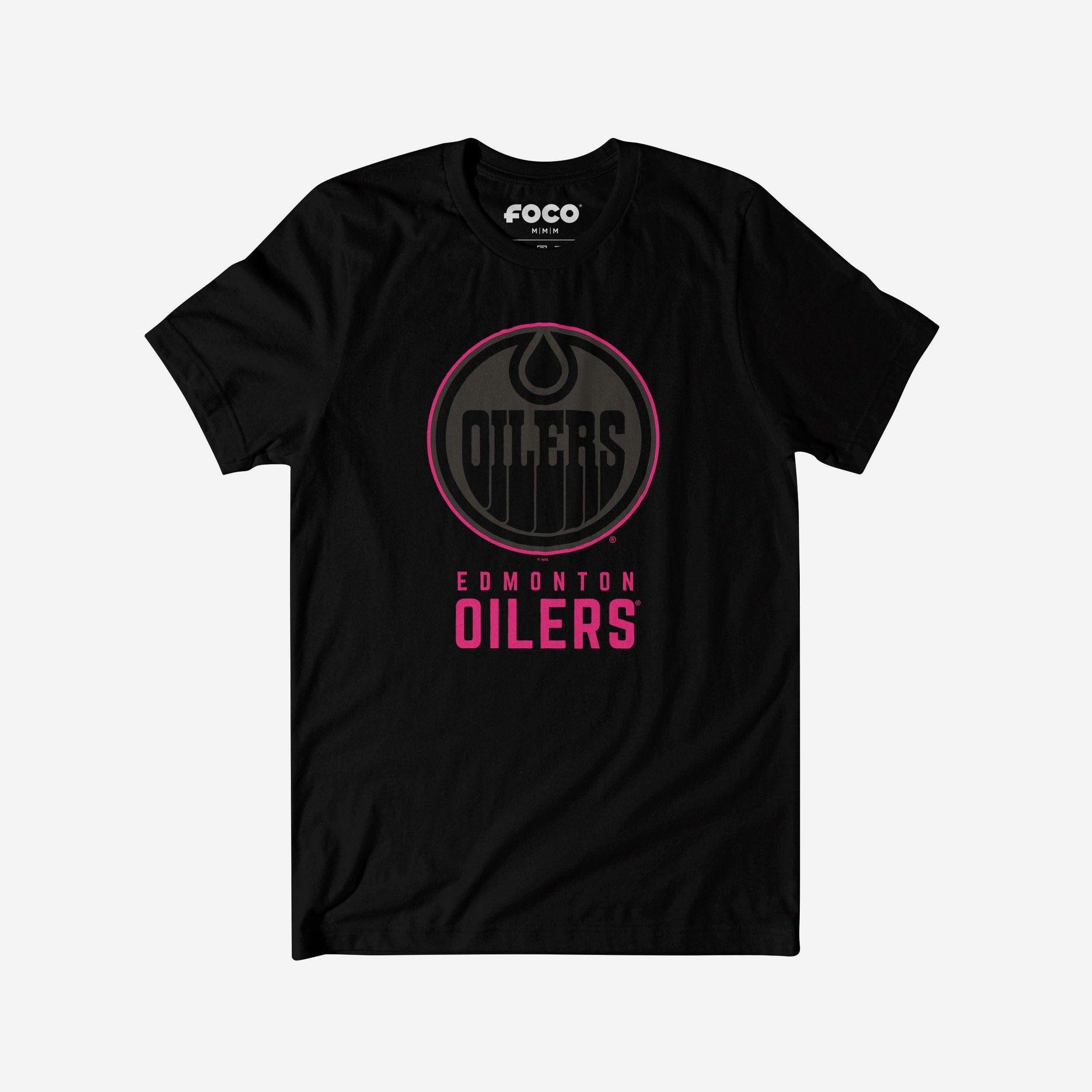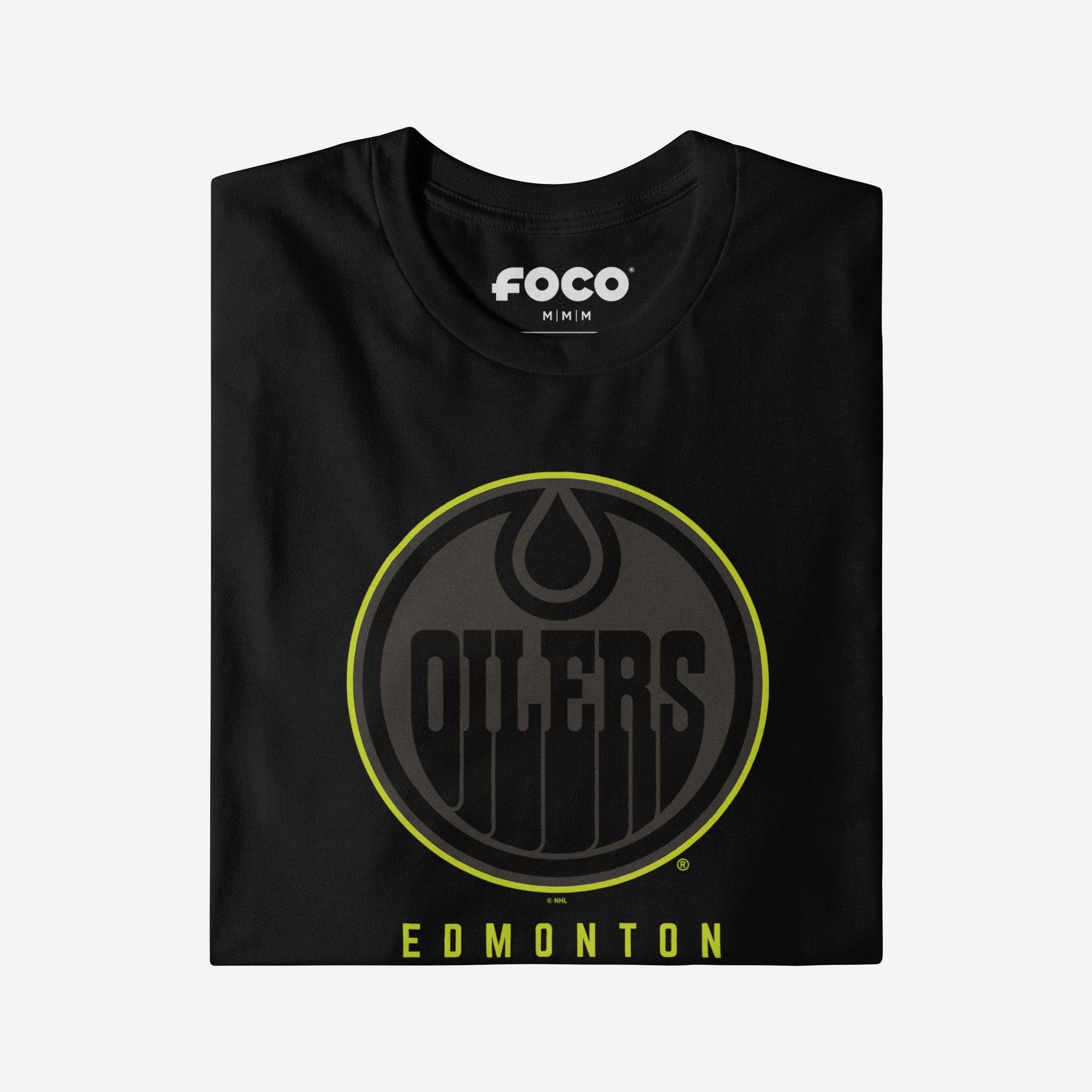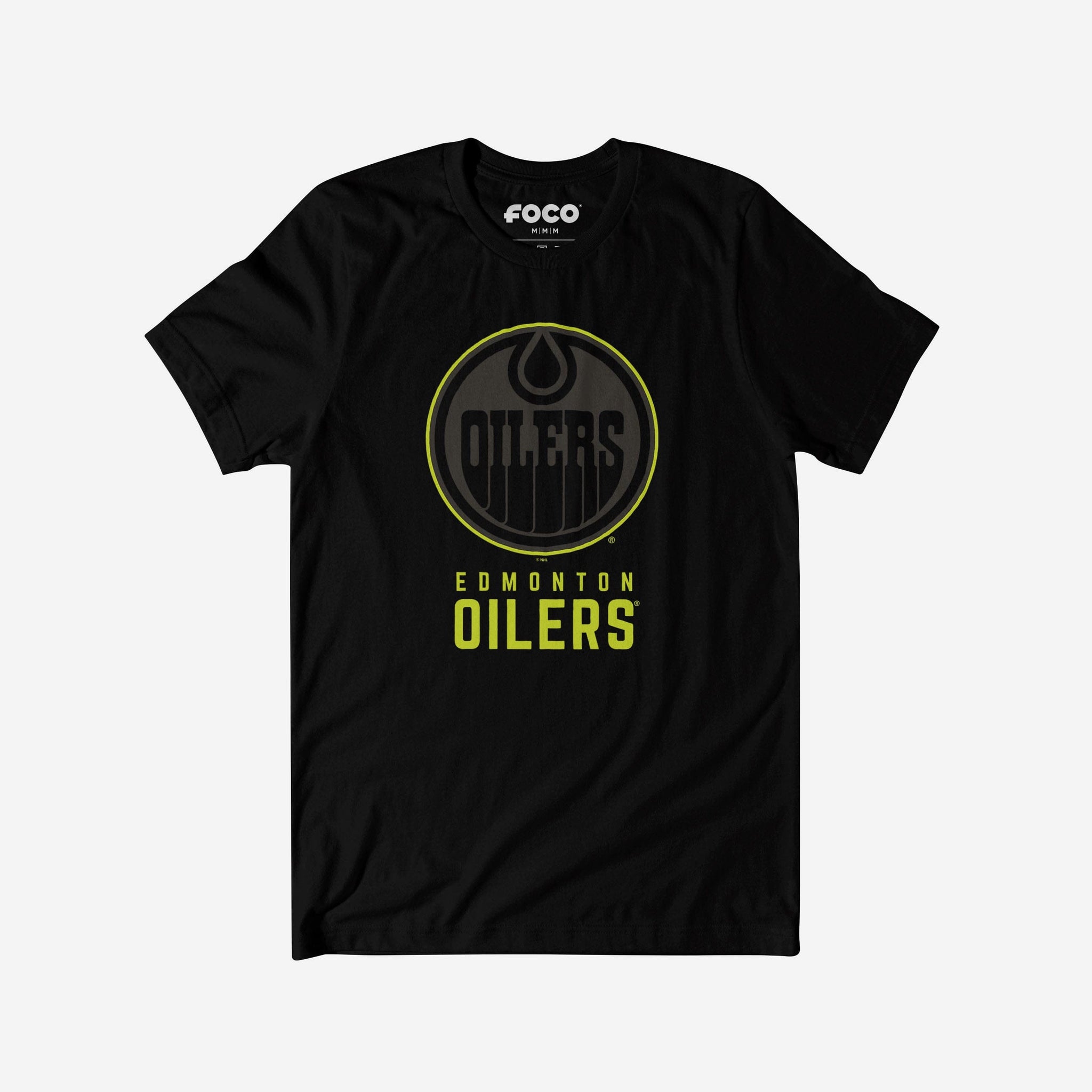 - Team logo display with highlight outline: The front of this apparel features a black Edmonton Oilers team logo display outlined in neon, and a neon wordmark team name display