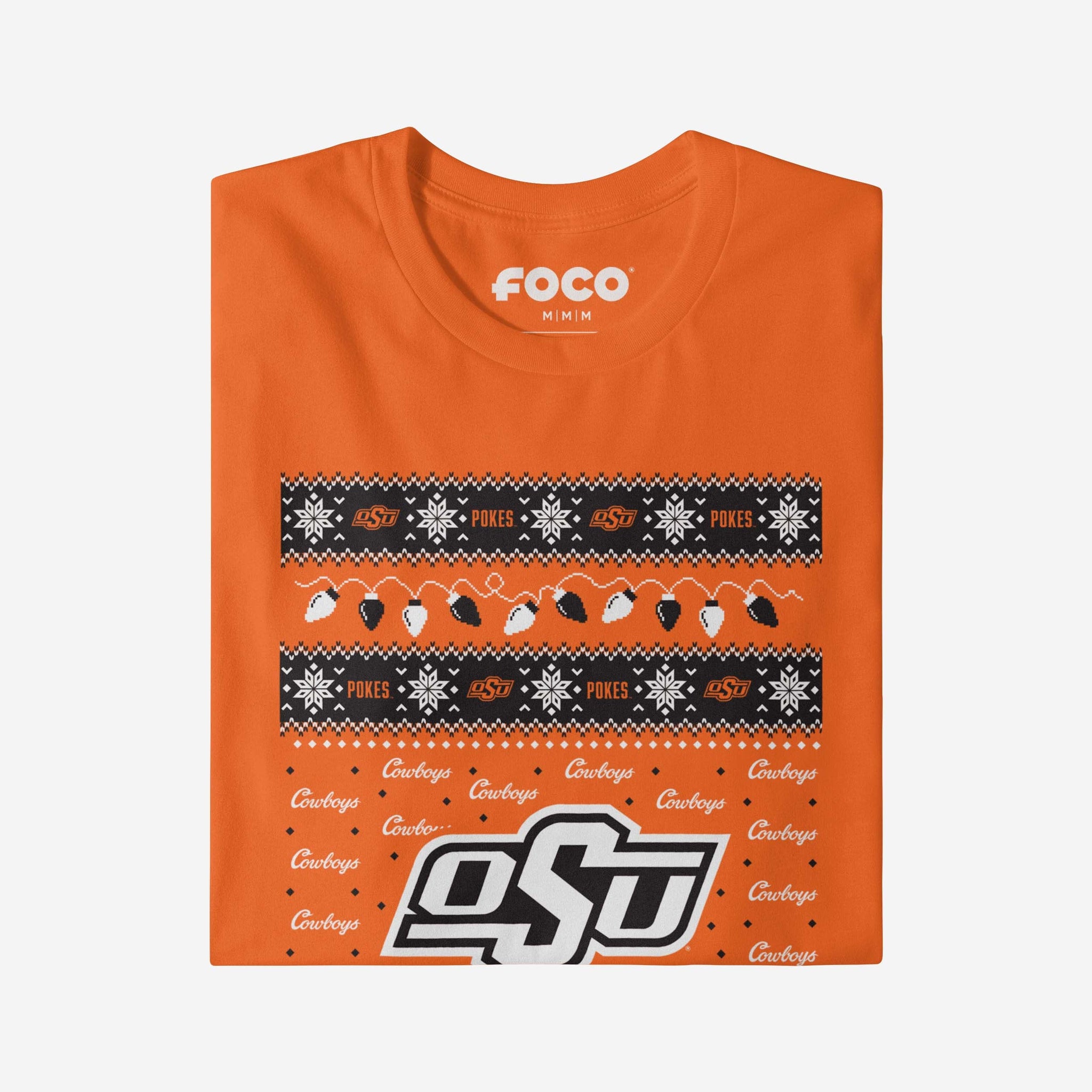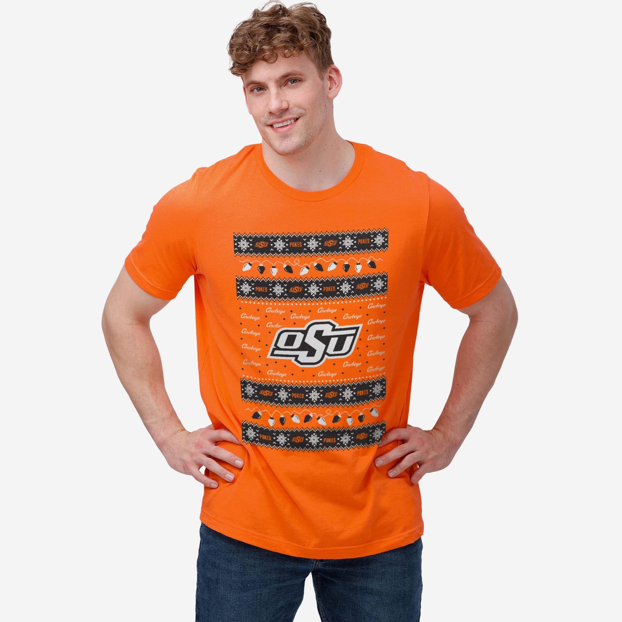 ‘Tis the season for some festive fandom! Make this holiday merry and bright with the Oklahoma State Cowboys Holiday Lights Sweater T-Shirt.
