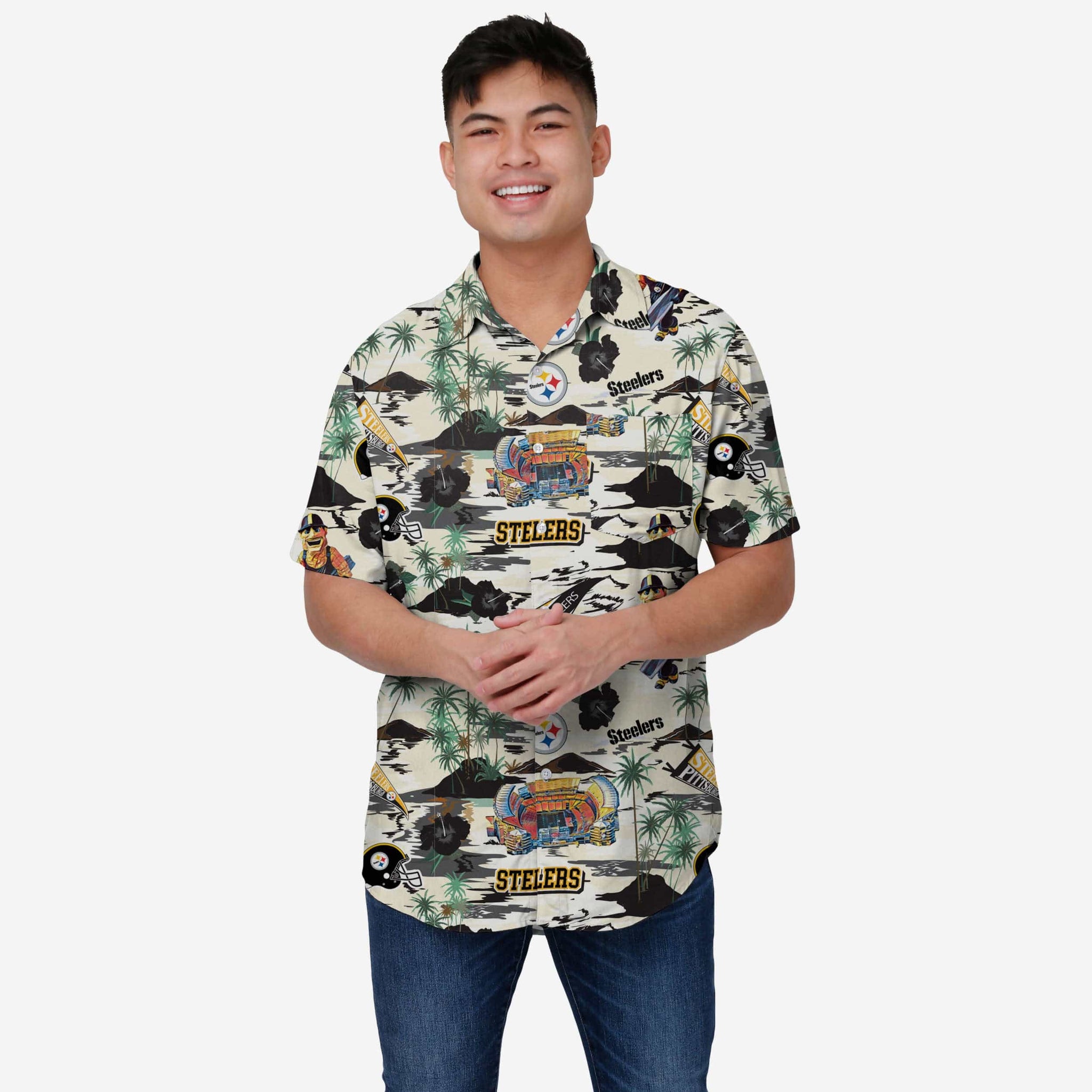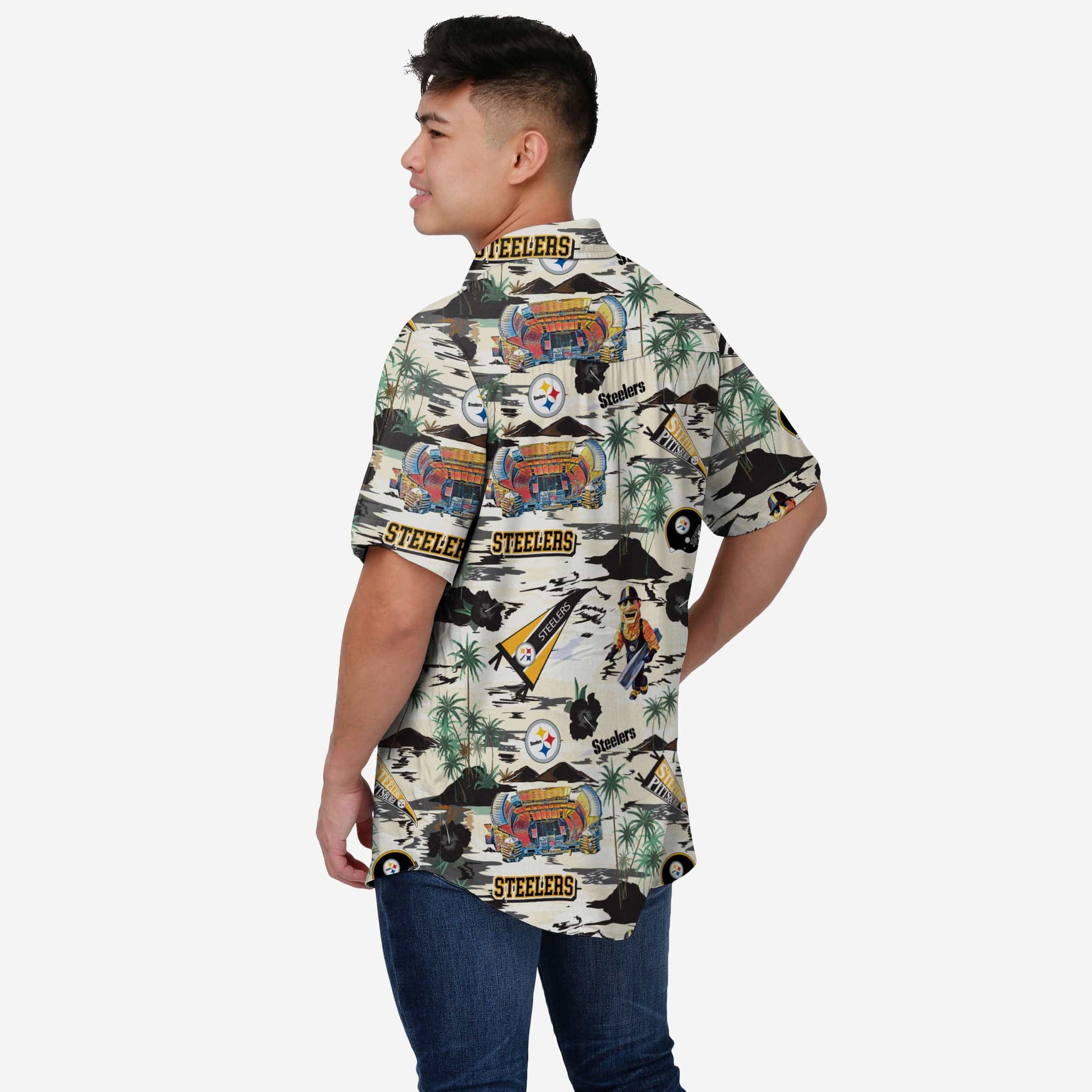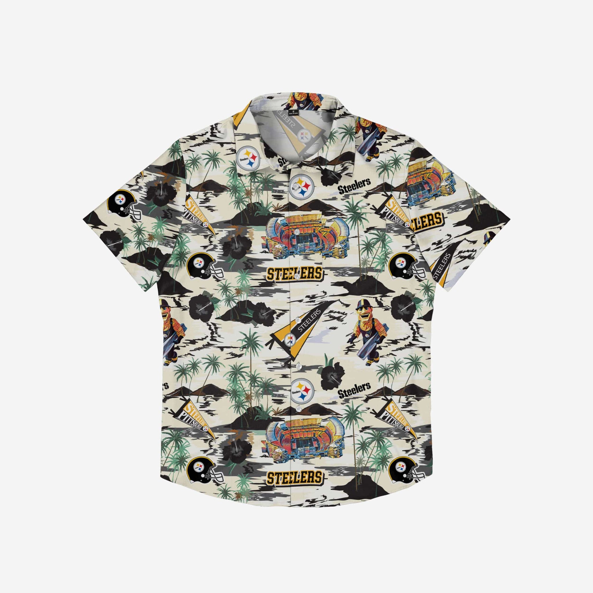 The game. The pool. The tailgate. The vacation spot. These are just a few places where you'll want to stylishly rep your team on the go in this Pittsburgh Steelers Thematic Stadium Print Button Up Shirt!