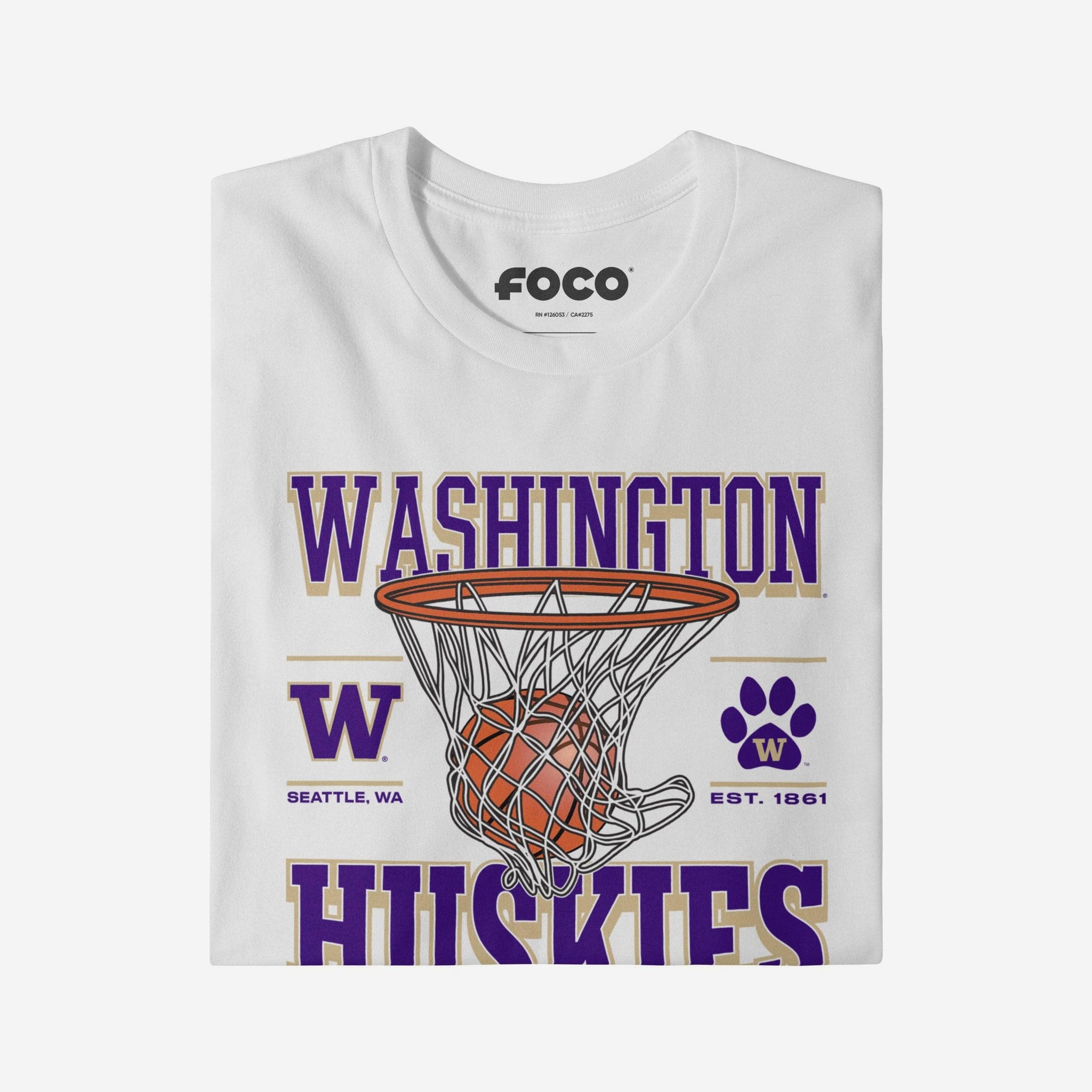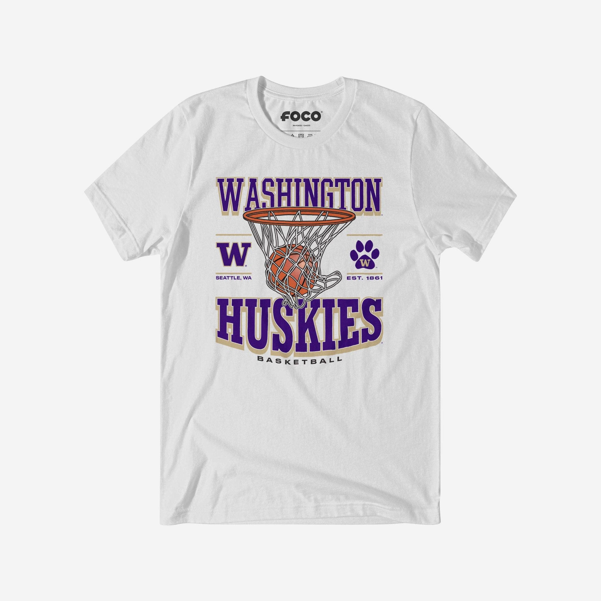 This top features a design that showcases your all-important team colors, a team logo display, a team wordmark name display, year of team establishment, and a basketball swishing through a net display meaning this t-shirt will prove your unmatched dedication to the Washington Huskies when you're at the game or watching at home. In other words, this graphic tee is about to be your new favorite teammate.
