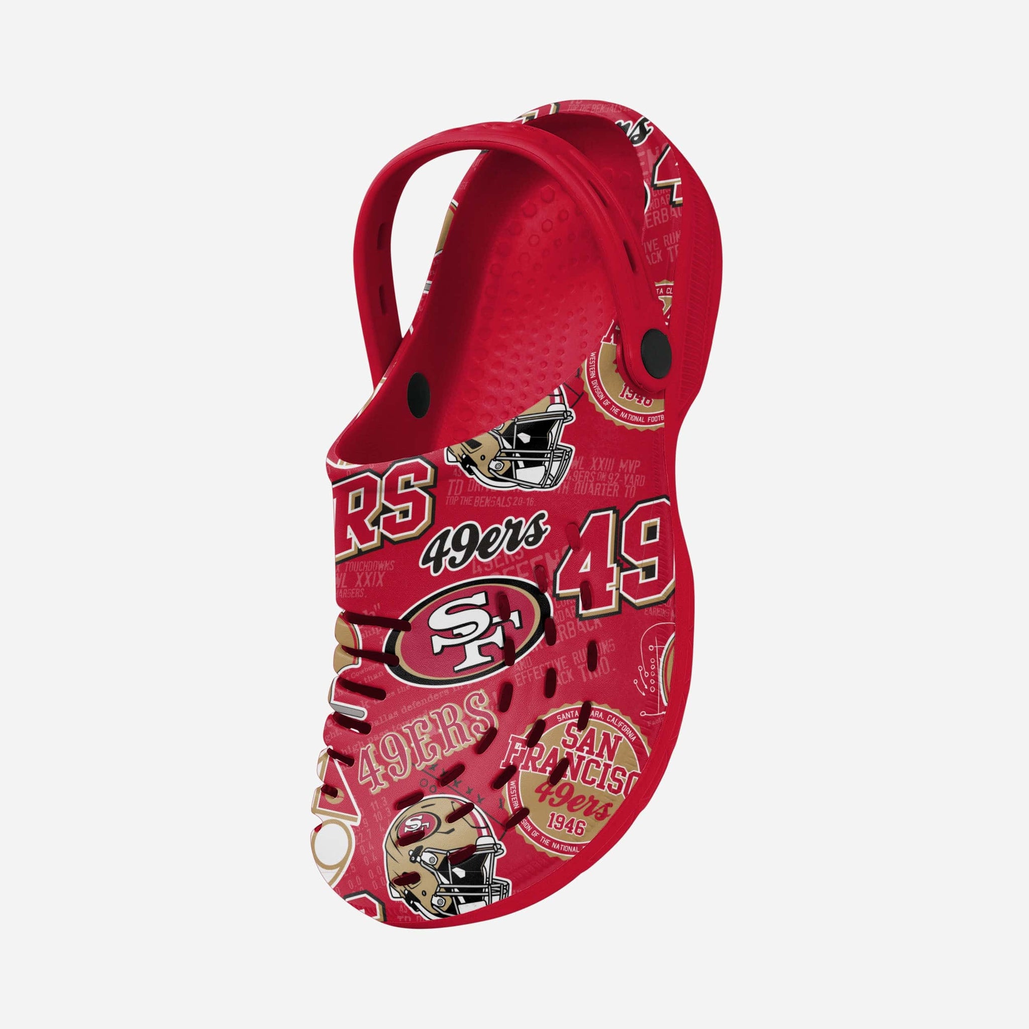 The San Francisco 49ers Historic Print Clogs with Straps are here to help you take a step into the time machine and celebrate your franchise's glorious history.
