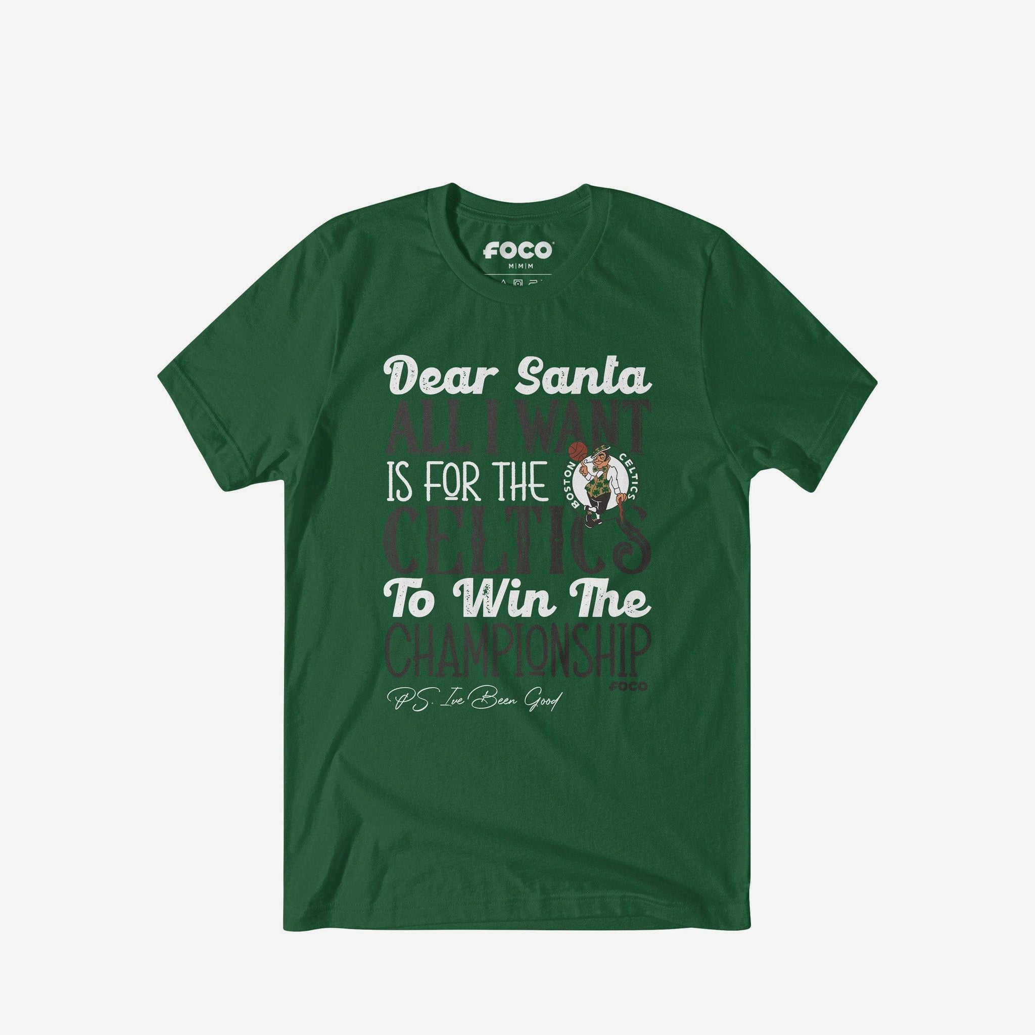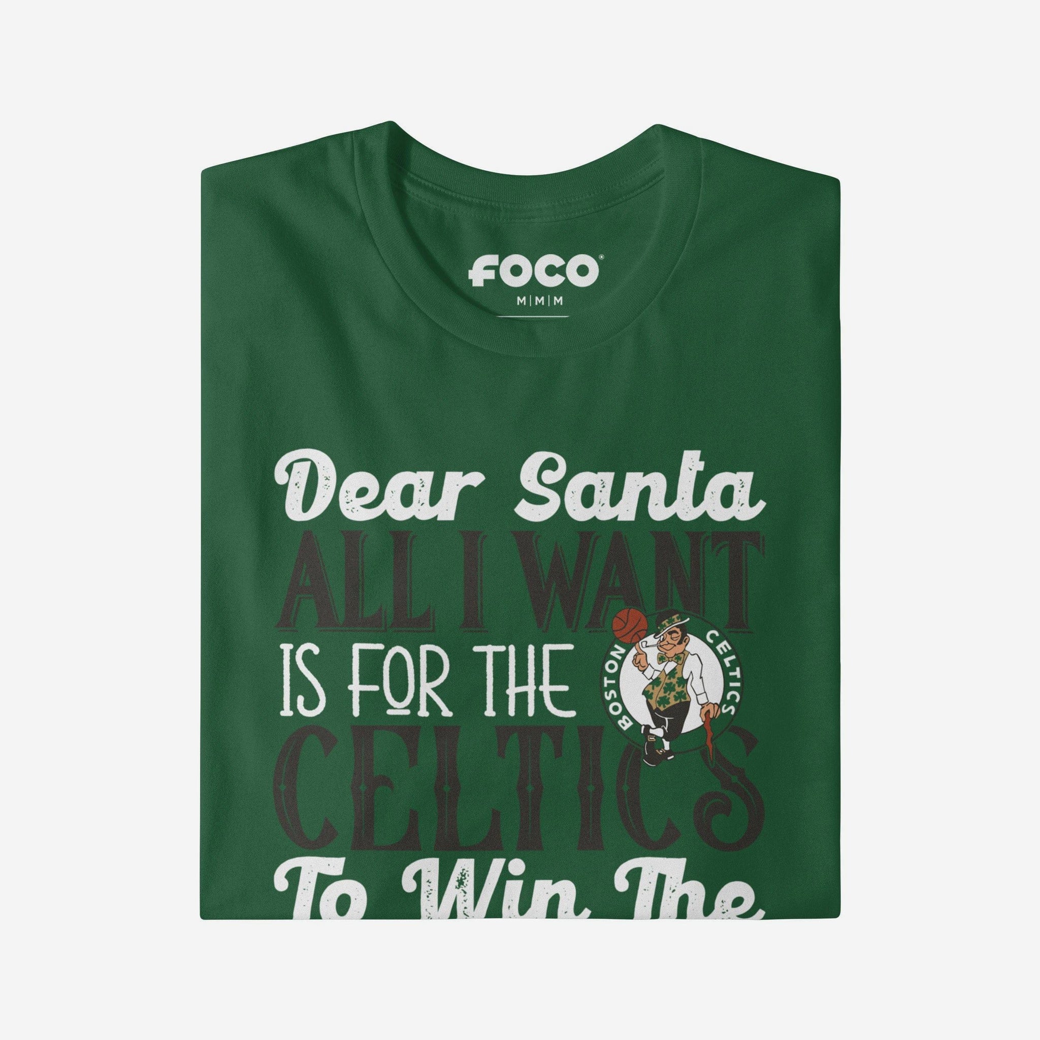 - Festive, team-colored design: This traditional t-shirt shows off the official Boston Celtics colors in an all-over design with a festive message to Santa, so you can combine your team spirit with holiday spirit.