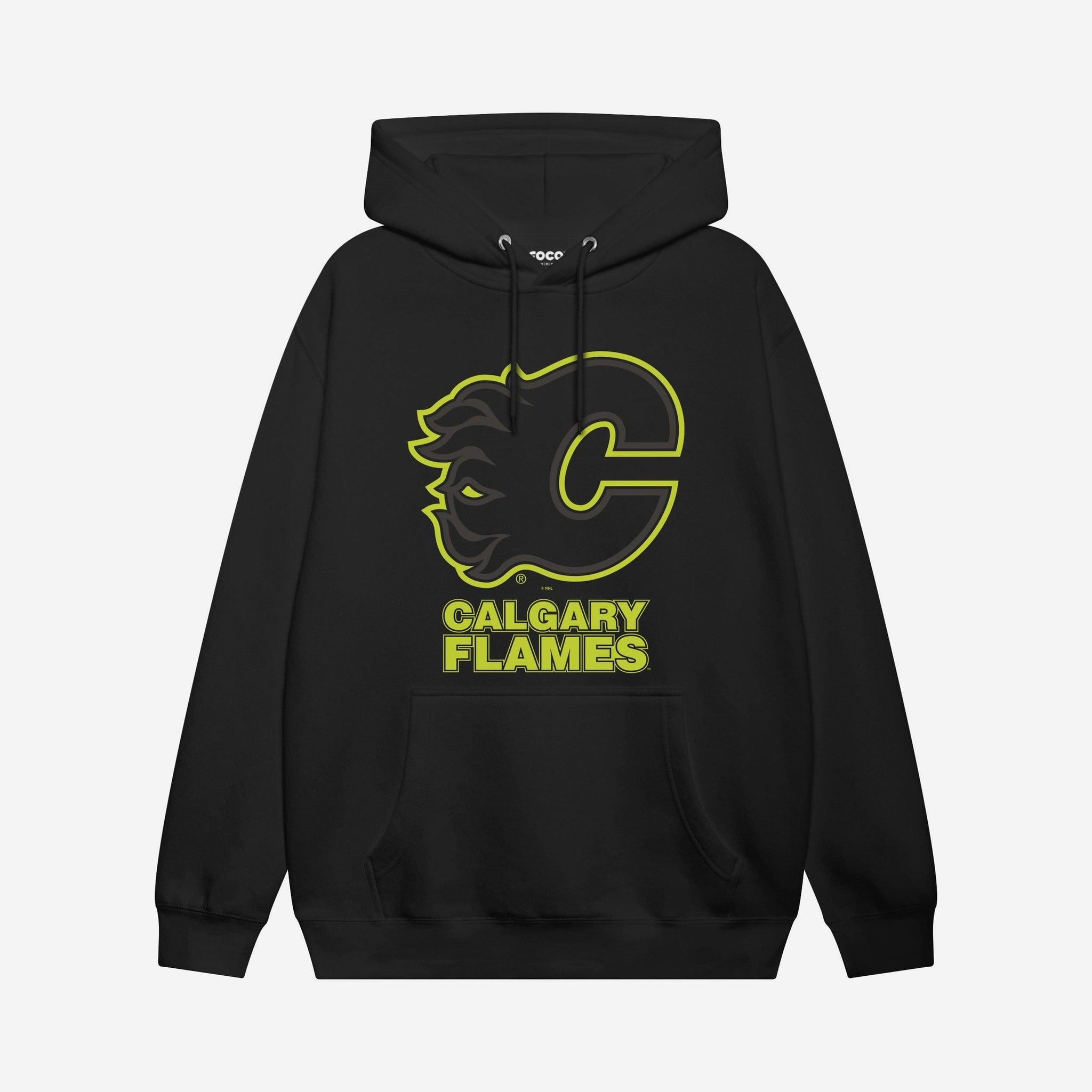 - Team logo display with highlight outline: The front of this apparel features a black Calgary Flames team logo display outlined in neon, and a neon team name display