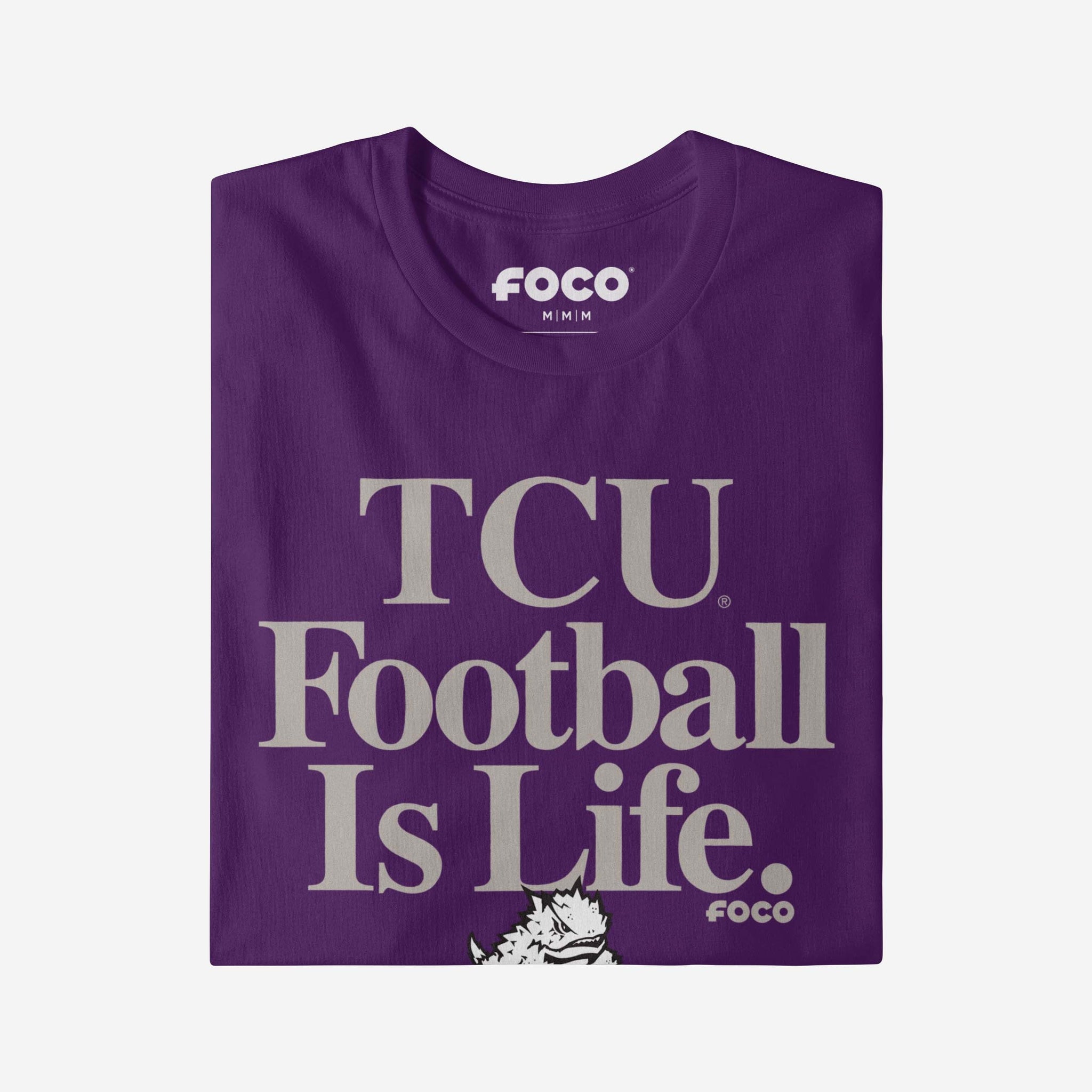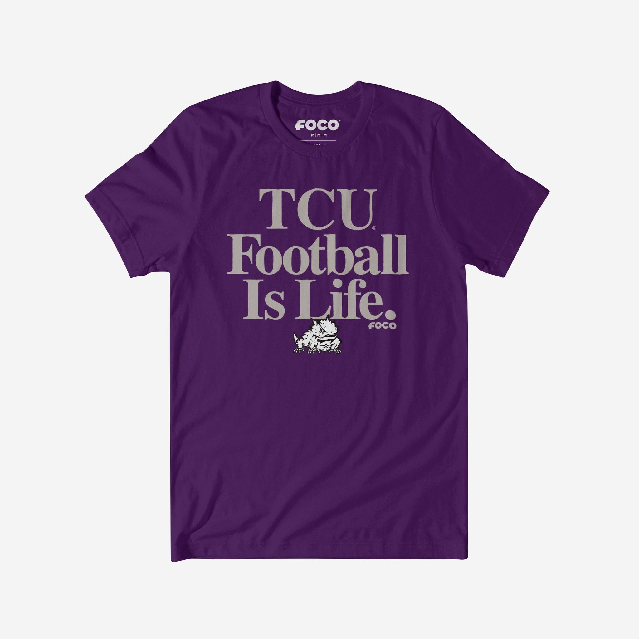 College. Football. Is. Life. You know it. We know it. Now, make sure everyone else knows it with this TCU Horned Frogs Football is Life T-Shirt. Whether you’re taking in the game at the stadium, out with friends, or lounging out on your couch, this team t-shirt is just what you need. School spirit has never been so stylish.