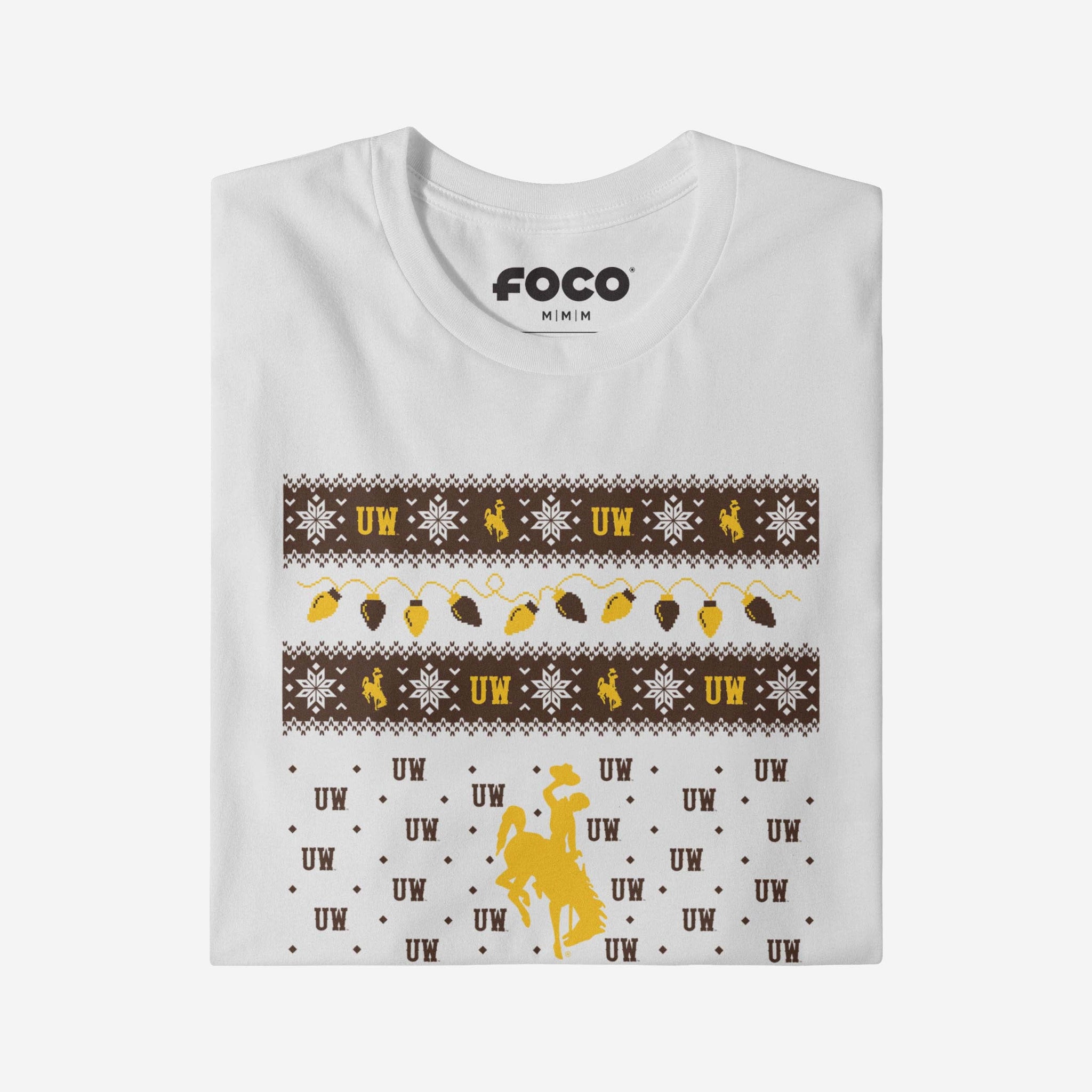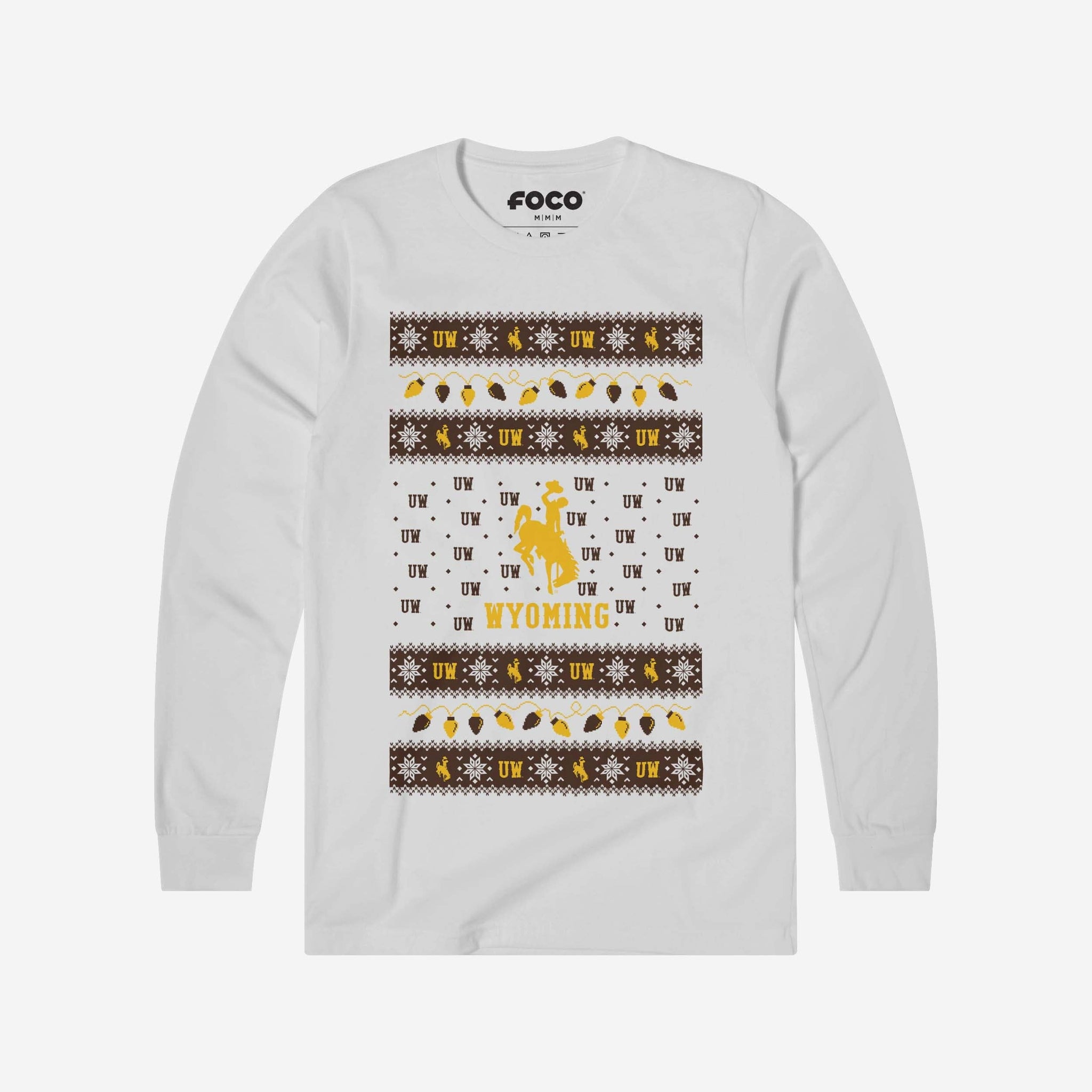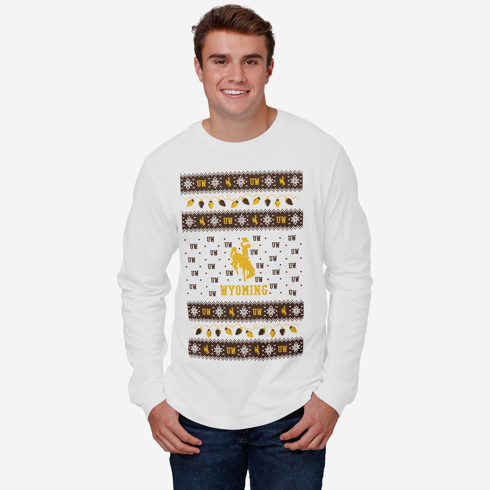 Santa's making a list, and he’s checking it twice! Prove that you’re the nicest fan around with the Wyoming Cowboys Holiday Lights Sweater Long Sleeve T-Shirt.