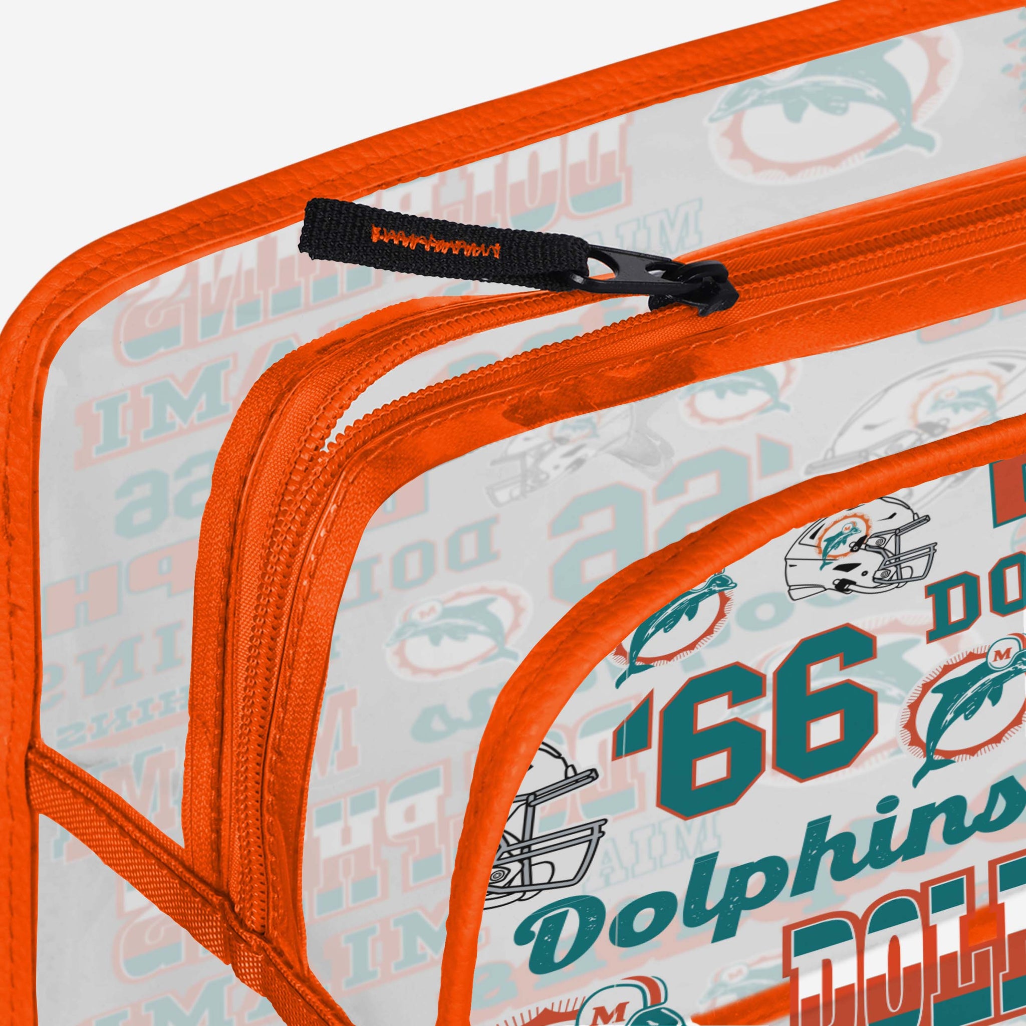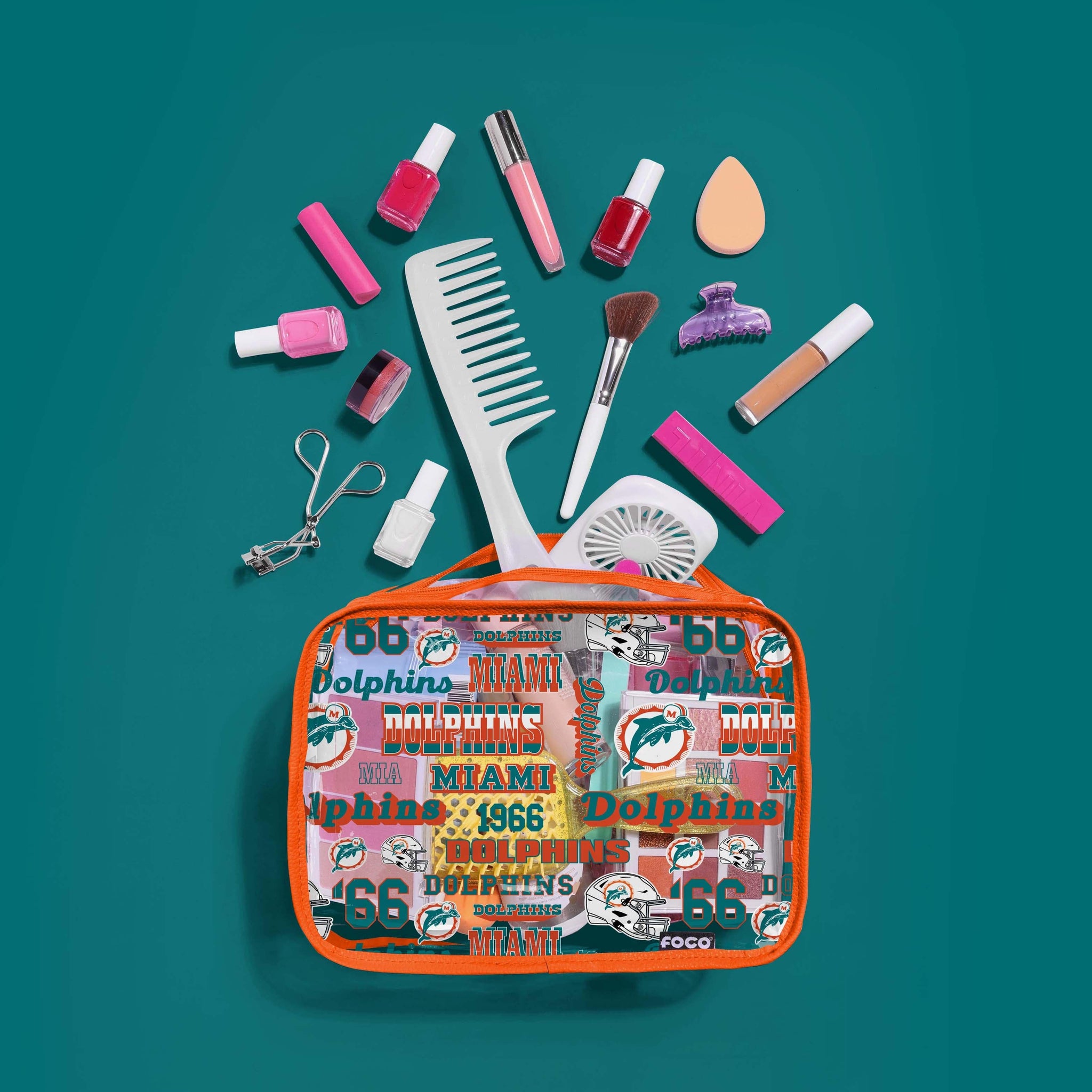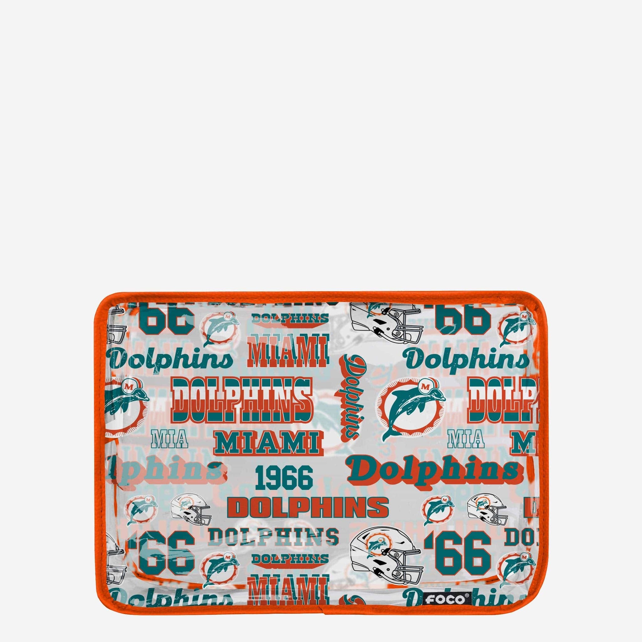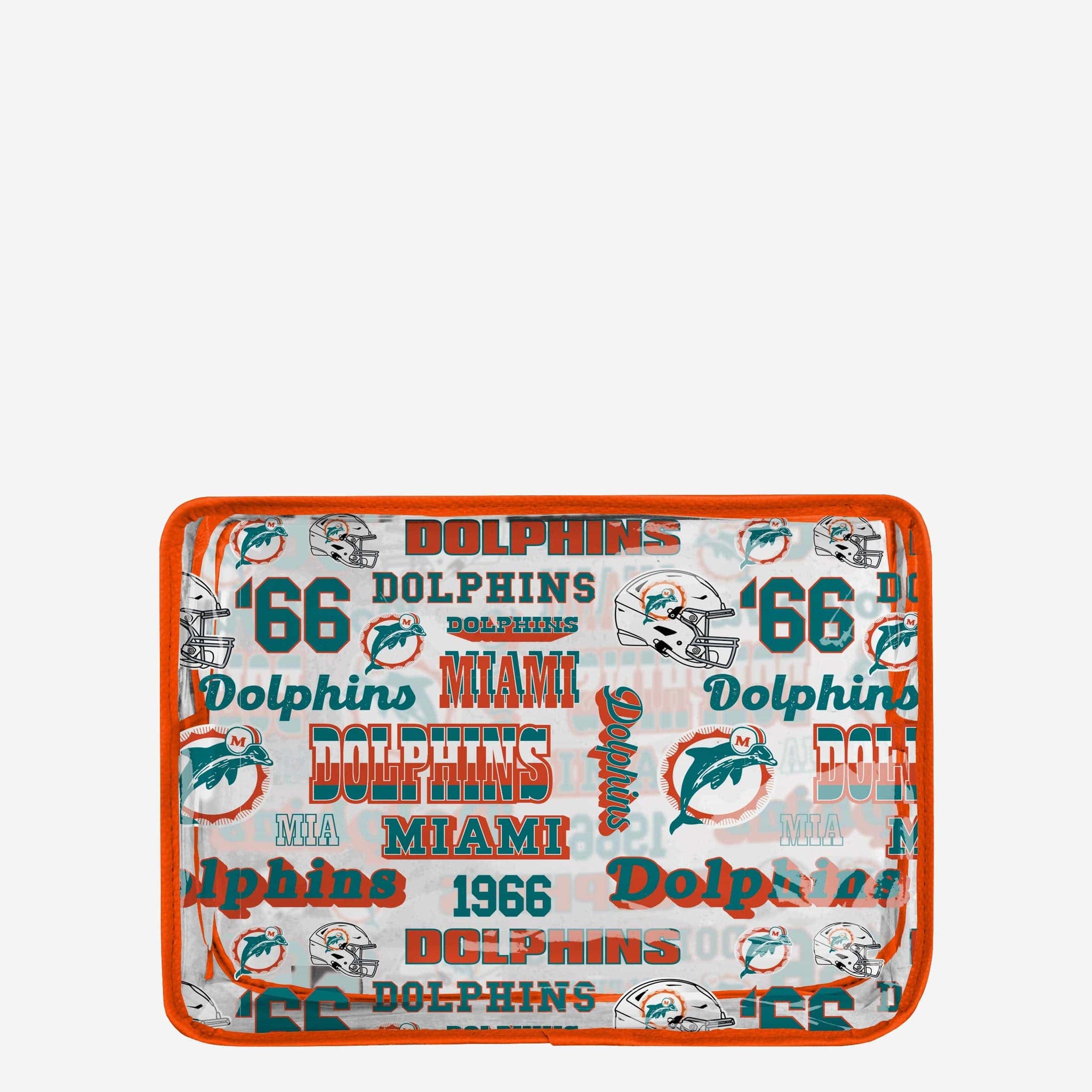 Lipstick. Hair care. Fandom. Get ready to carry it all! Wherever you go, let everyone clearly see which team you root for with a Miami Dolphins Repeat Retro Print Clear Cosmetic Bag.