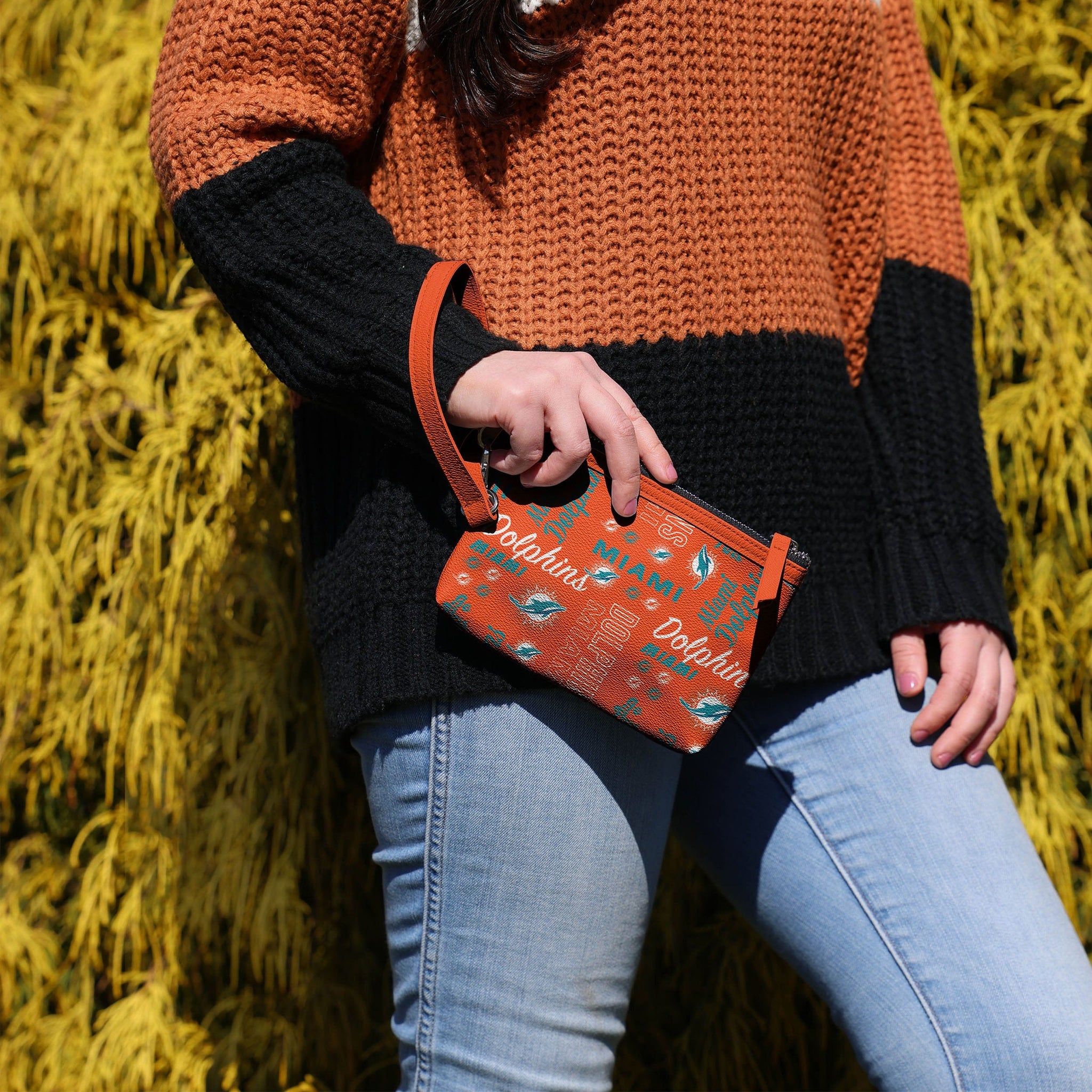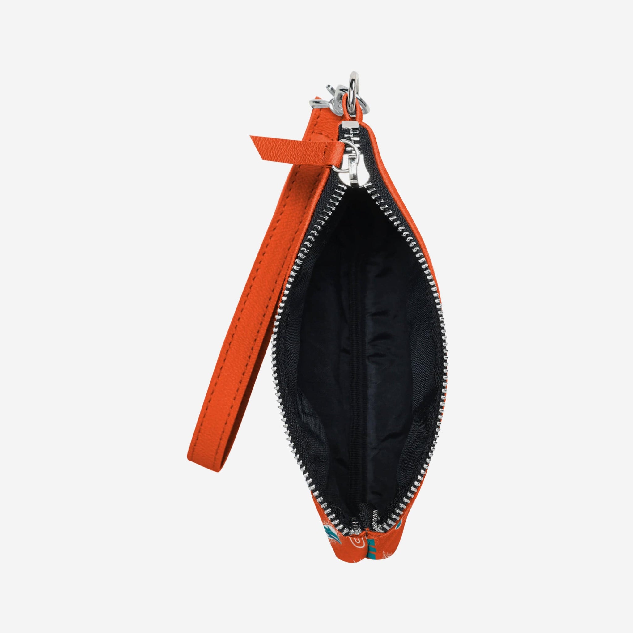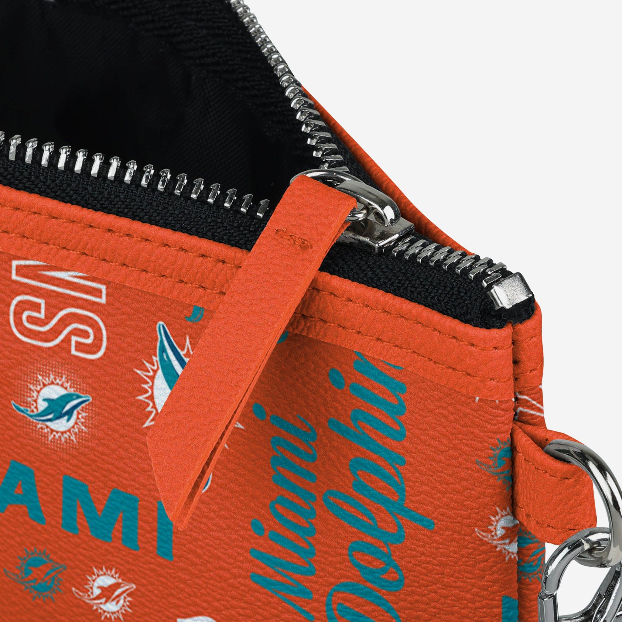 Gamedays on the go are easier and more fashionable than ever before thanks to this Miami Dolphins Spirited Style Printed Collection Repeat Logo Wristlet.