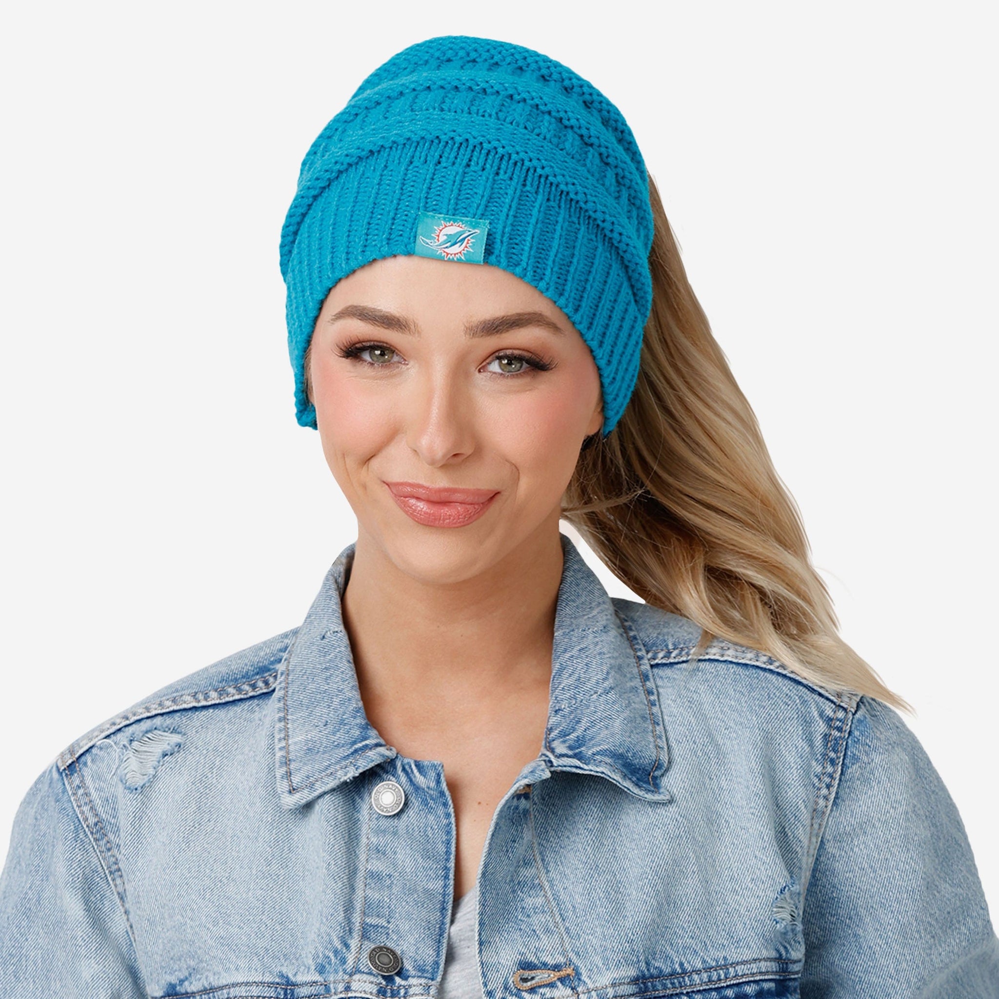 Putting together the ultimate fit for the tailgate and beyond? Make sure to get your head in the game with the Miami Dolphins Women's Solid Ponytail Beanie!