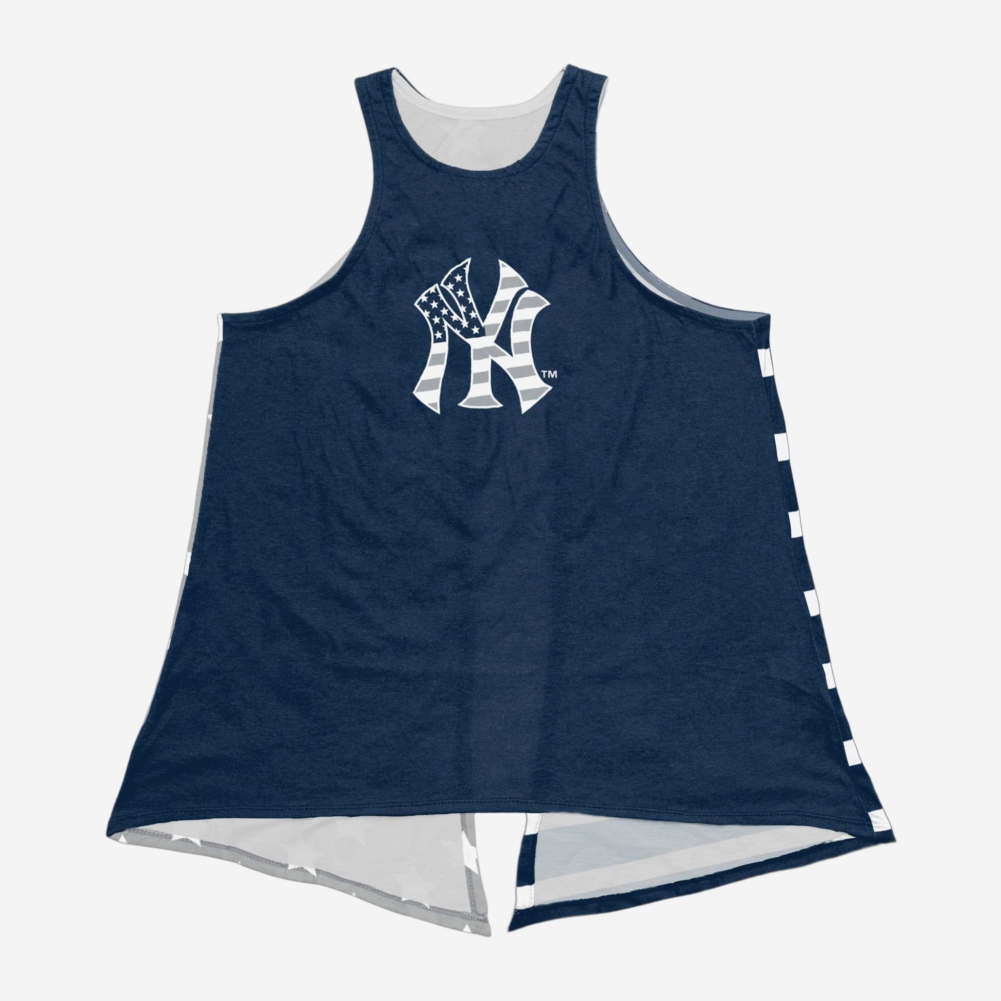 What this New York Yankees Women's Americana Tie Back Sleeveless Top lacks in sleeves, it more than makes up for in patriotic team pride!